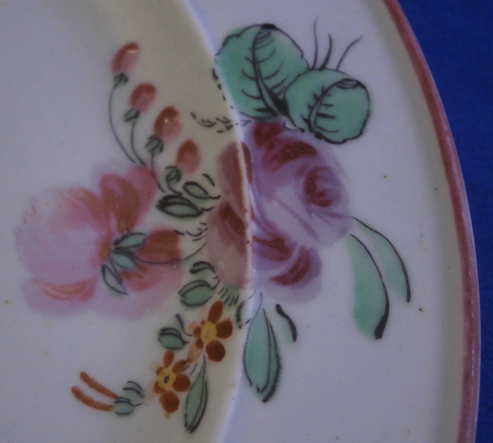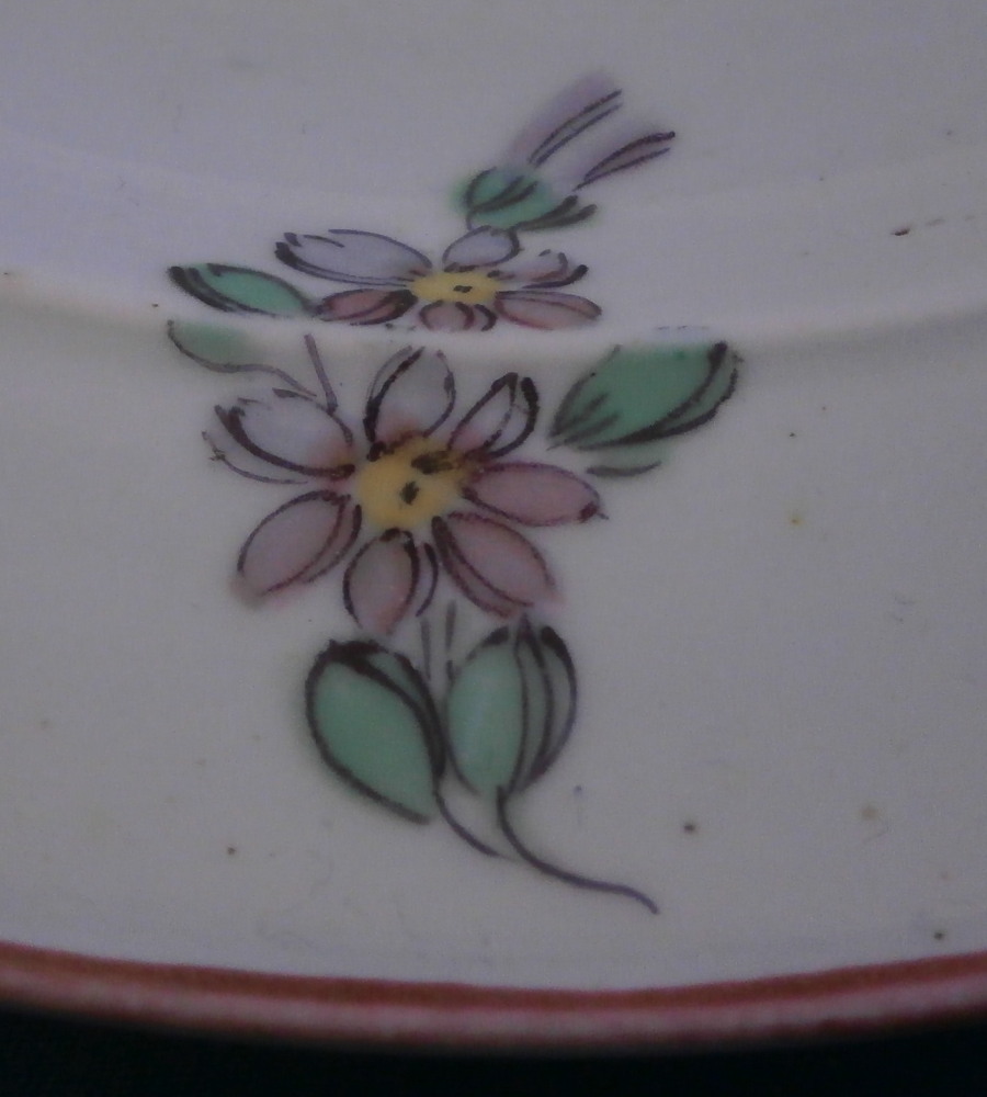 This is a rare small plate made by Alcora of Spain in the late 18th century. The full name of the maker is Real Fábrica del Conde de Aranda ( l'Alcora ) and it is really hard to find a piece by this maker! Plates and cups are found mostly in museums and often damaged. The plate is hand painted with a floral arrangement to on side and two smaller single flowers to the other. Their typical pink trim to the edge. This piece would have belonged to the German flower series of dishes inspired by the engravings of Weidemann . The design was introduced by Vincente Alvaro after a stay in Paris which explains why it looks so French in style. The quality of the porcelain is very nice with some inclusions in the paste and the hand painted decoration is quite nice as well. The glaze has a bluish tint to it. The dish is marked with their typical A mark in black as shown. The piece is in good condition with some use marks, a chip to the underside rim edge and another to the foot ring. Inclusions/impurities to the paste. Displays nicely and is a nice example by a very rare maker! The piece is 0.875 inches tall and 7.5 inches in diameter. Please email me for more information or other pictures.
