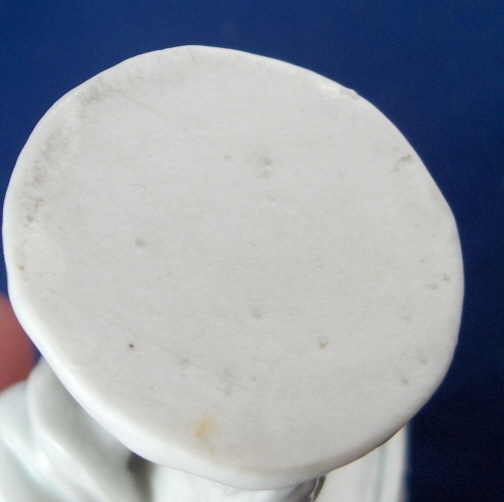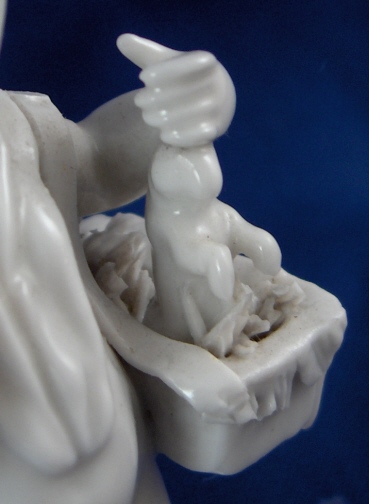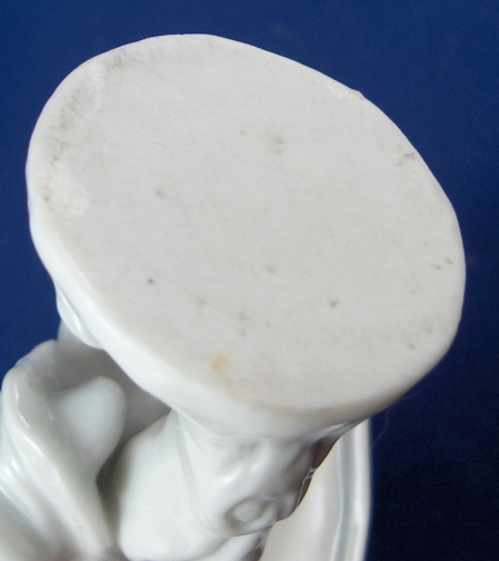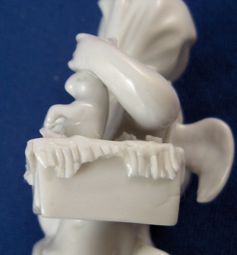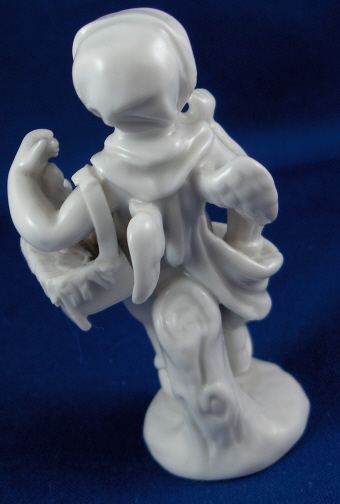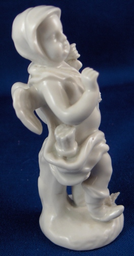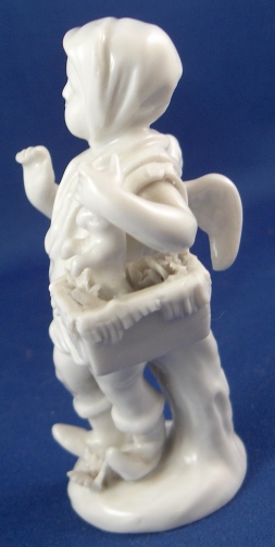 This is a rare porcelain figurine most likely made by Althaldensleben in Germany in the first half of the 19th century. The matching piece I own is marked with a single blue line mark but this piece here is unmarked. A good quality white piece of a cherub with a bunny in his basket. Very well modeled really which shows that they were indeed a formidable competitor to KPM during this period. The little figurine is in great condition with a little chip to the grass haning over the side of the basket and a ground down (but glazed over) spot to the top of the strap holding the basket to his shoulder. This is from the manufakturing process and not real damage. The piece is not marked as shown but the second piece that came with it has the Nathusius mark and they look to be from the same maker. It is 3.375 inches tall, 1.75 inches wide and 1.5 inches deep. Please e-mail me for more information or photos.