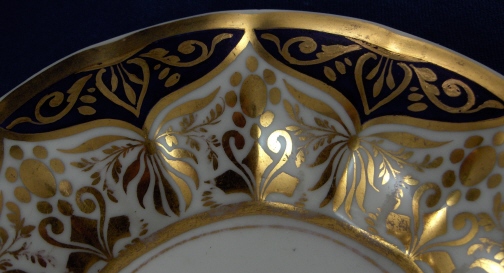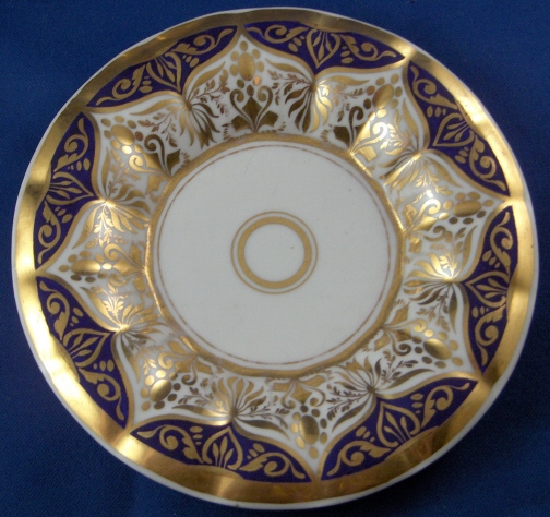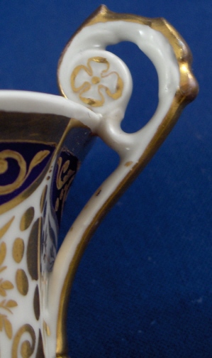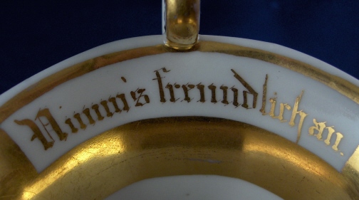 This is a superb cup and saucer set made by Althaldensleben in about 1830. Althaldensleben was started by Gottlob Nathusius in about 1814 as an earthenware factory but soon (about 1826) converted to porcelain making. After his death in 1836 the factory was closed. It is rare to find pieces by this maker as they only made porcelain for ten years. The cup has a nice shape with a handle including what looks like a 4 leaved clover and 4 claw feet. Nice gold design some of which is on a cobalt blue ground. The set is marked with the underglaze blue line mark underneath. The cup has the number 46 (I think) impressed underneath. The cup has a saying " Nimm's freundlich an " - accept it with kindness. The cup is 3.125 inches tall plus the handle and 3.5 inches in diameter. The saucer is 0.75 inches tall and 5.75 inches in diameter. The set is in perfect condition with just a tiny bit of wear. Please email me for more information or photos.