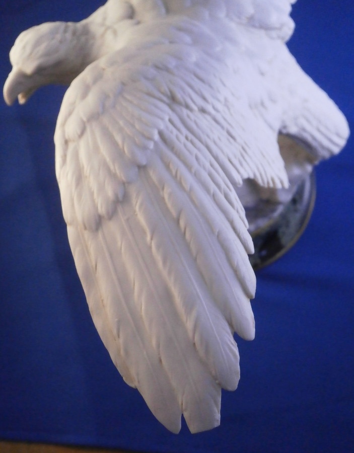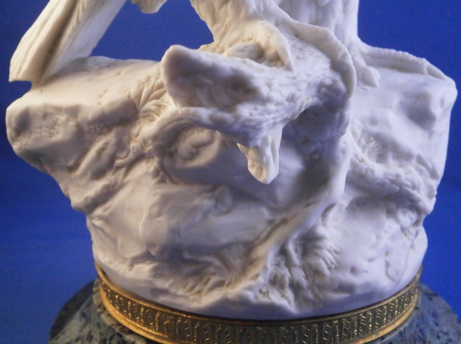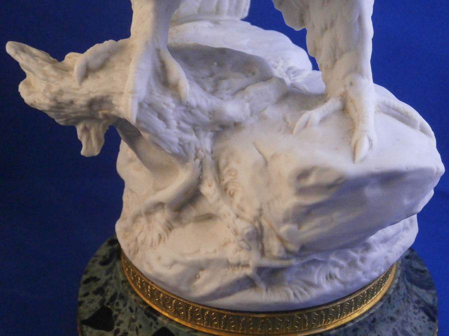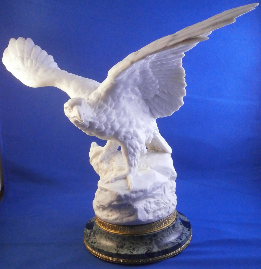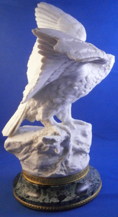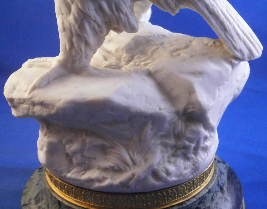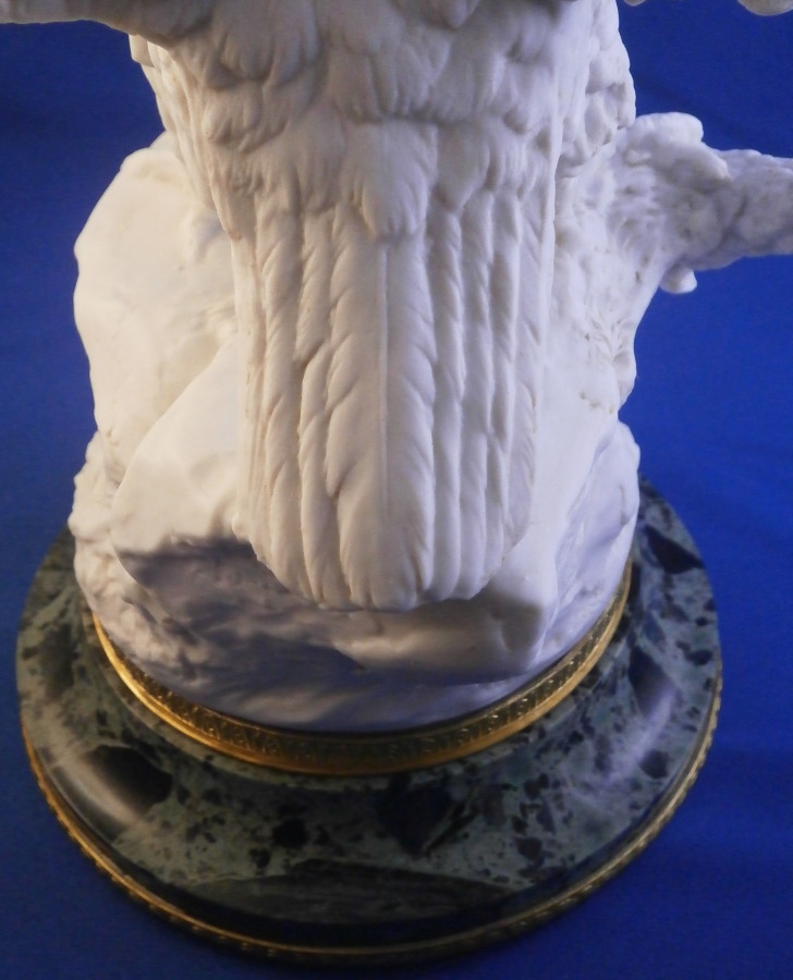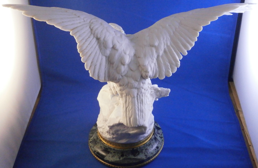 This is an extremely nice figurine of an eagle either made for the American market or even by a US maker likely in the late 19th century. I ahve never seen this model before and the added gold metal trim to the base is permanently attached to the porcelain so I cannot look for a possible maker's mark. What I do know is that is is the nicest eagle figure I have come across in my years of collecting. It is superbly modeled with the wings stretched out standing on a rocky base with an old gnarly tree trunk on the side. Tons of detail and the parian unglazed porcelain means it did not get covered by glaze so it is all visible. The superbly made piece in combination with an amazing green marble base with gold trim make this one of the neatest pieces I have seen in a long while! Just stunning. A rather large figurine being 10.625 inches tall, 14.25 inches wide and 6.5 inches deep. The base has a diameter of 5.125 inches. The piece is not visibly marked as to the maker. It has a small airhole underneath the butt. The bird is in great condition given the fragile nature of it. Two tips of the feathers on the wings have been damaged but it's not something that takes away from the piece at all. The base is in perfect condition and the green and gold coloration goes perfectly with the white of the porcelain! Please email me for more information or other pictures.