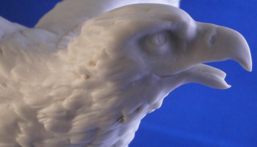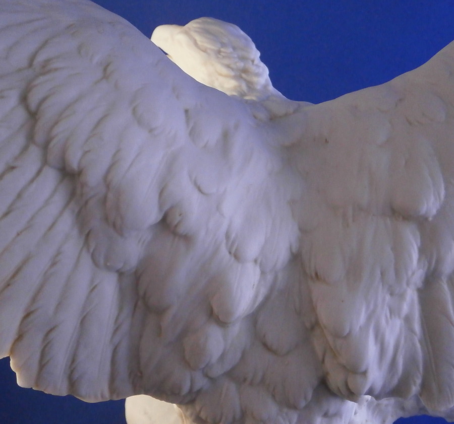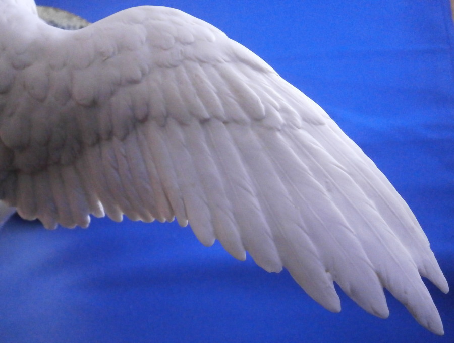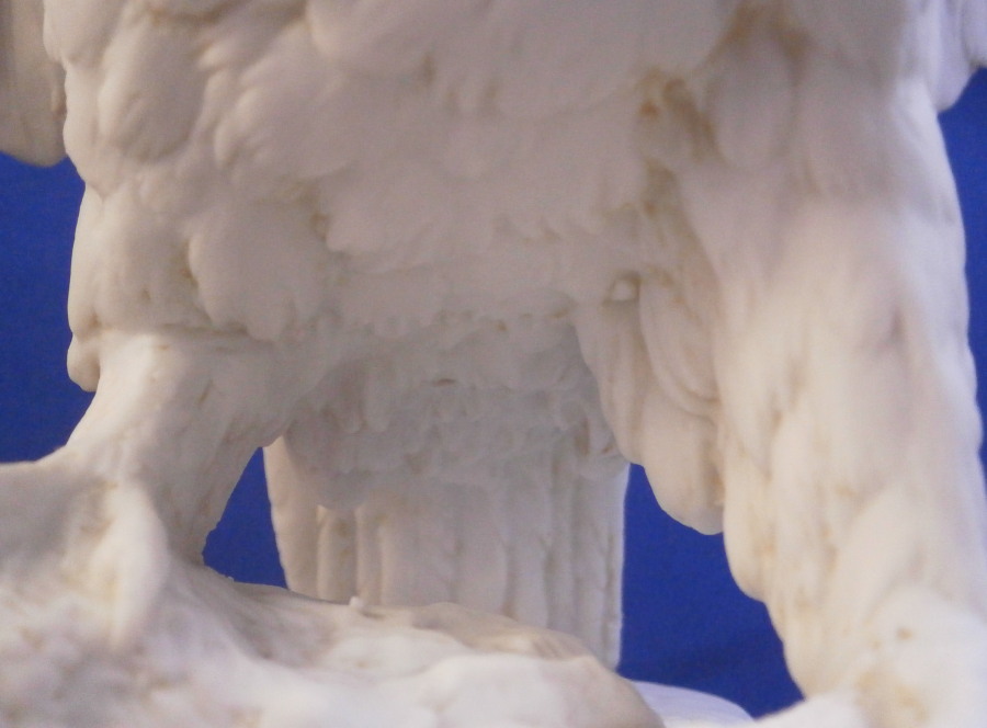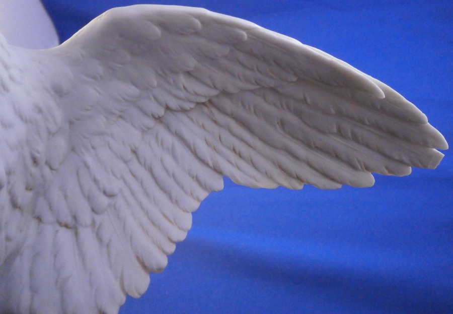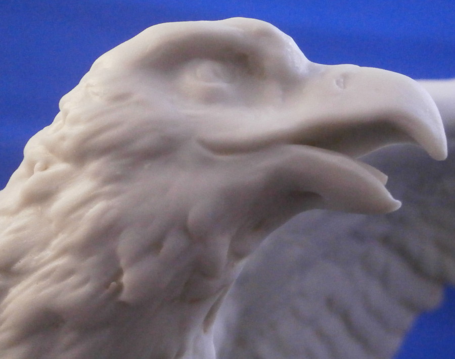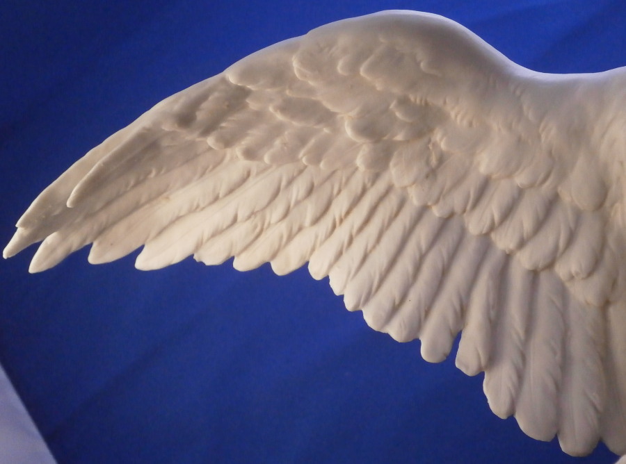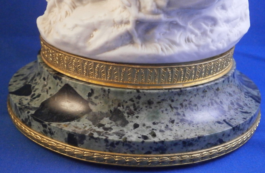 This is an extremely nice figurine of an eagle either made for the American market or even by a US maker likely in the late 19th century. I ahve never seen this model before and the added gold metal trim to the base is permanently attached to the porcelain so I cannot look for a possible maker's mark. What I do know is that is is the nicest eagle figure I have come across in my years of collecting. It is superbly modeled with the wings stretched out standing on a rocky base with an old gnarly tree trunk on the side. Tons of detail and the parian unglazed porcelain means it did not get covered by glaze so it is all visible. The superbly made piece in combination with an amazing green marble base with gold trim make this one of the neatest pieces I have seen in a long while! Just stunning. A rather large figurine being 10.625 inches tall, 14.25 inches wide and 6.5 inches deep. The base has a diameter of 5.125 inches. The piece is not visibly marked as to the maker. It has a small airhole underneath the butt. The bird is in great condition given the fragile nature of it. Two tips of the feathers on the wings have been damaged but it's not something that takes away from the piece at all. The base is in perfect condition and the green and gold coloration goes perfectly with the white of the porcelain! Please email me for more information or other pictures.