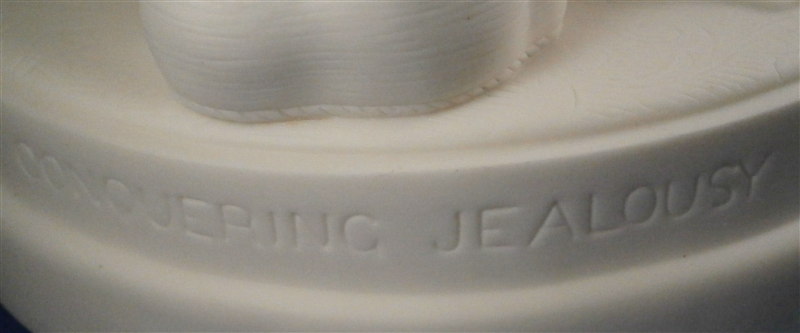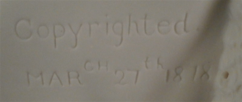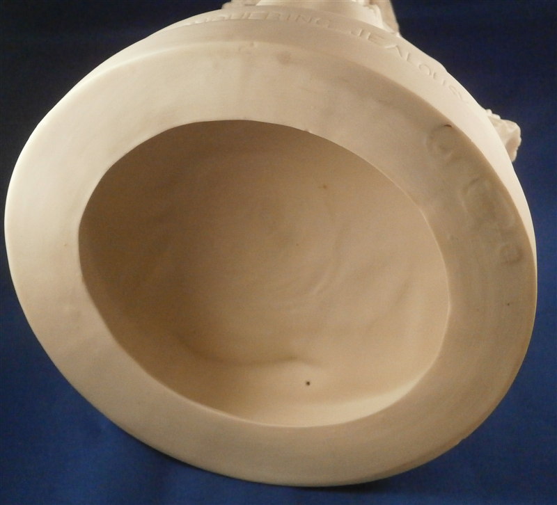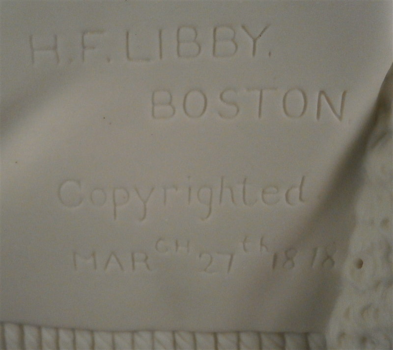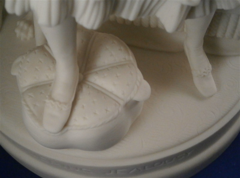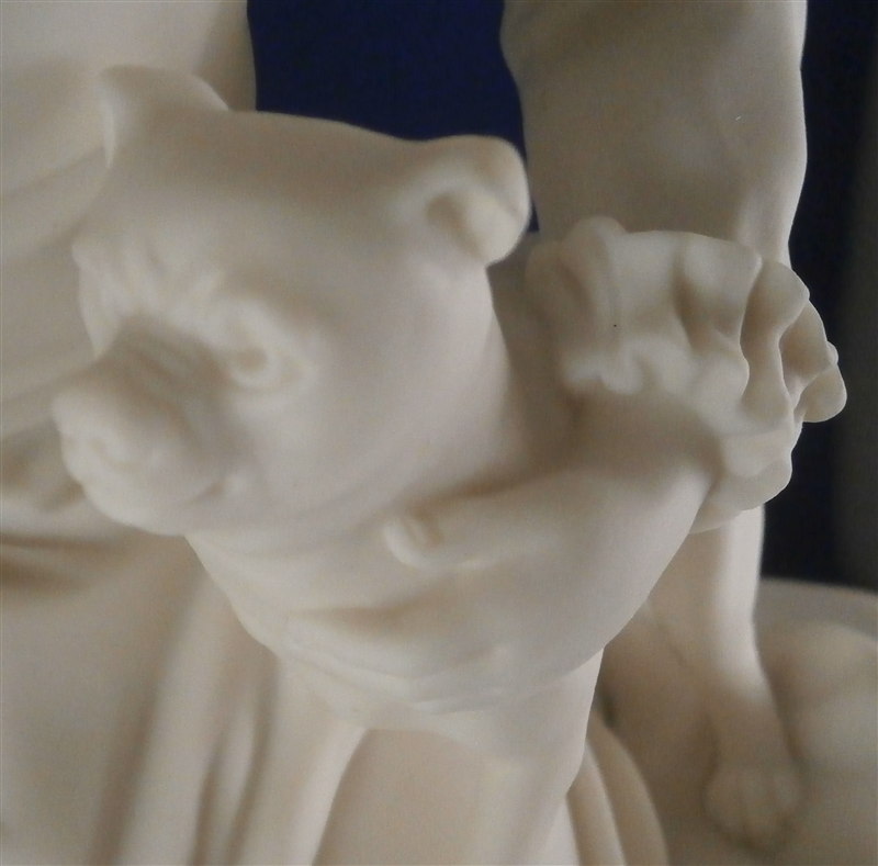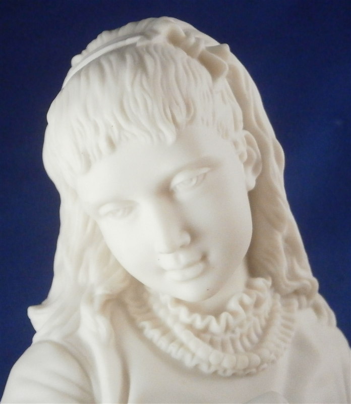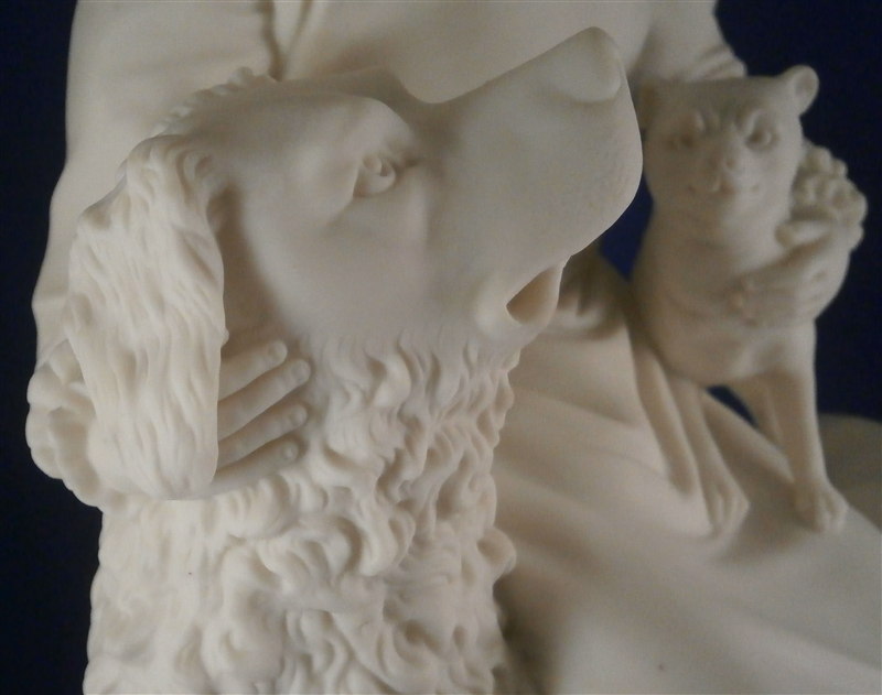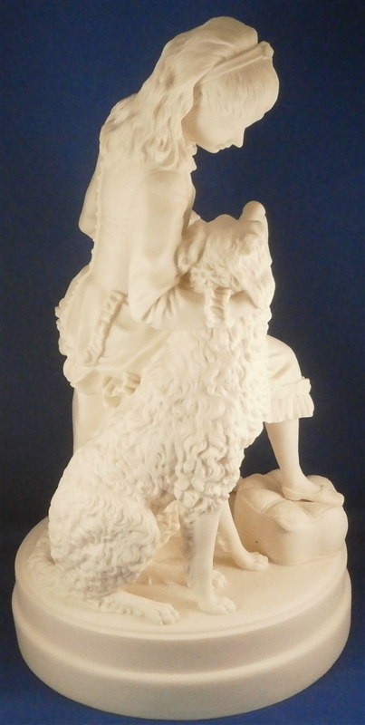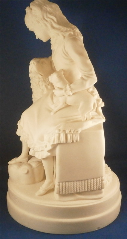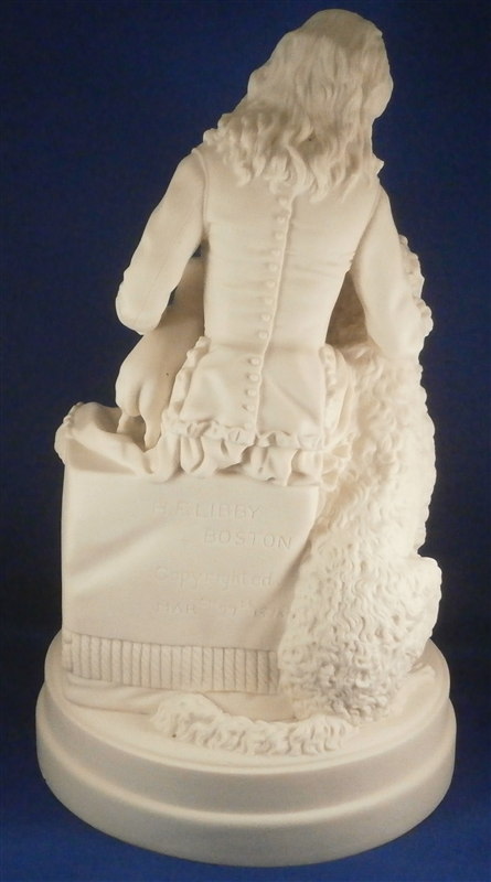 This is a superb large figure modeled by an American in Boston named Henry F. Libby in the later 19th century. He was a Boston dentist and amateur sculptor that modeled porcelain on the side until his practice grew more successful. The porcelain itself was made in England by Robinson and Leadbeater which was a common practise in the early days of porcelain in the USA. The figurine is made of Parian / unglazed porcelain and is quite stunning. It is of a girl having a chat with her two dogs about behaving properly :) One is a large dog possibly a golden retriever and the other a small one possibly a pug dog. The piece is amazingly detailed and very well modeled. A rather large figurine being 12.75 inches tall with a base diameter of 7.375 inches. The piece is not marked as to the maker but the back is marked H.F. Libby Boston and the copyright date as shown. The front of the base has a title on it - Conquering Jealousy . The figurine is in superb condition with a small chip to the bottom side edge of the base as shown. Please email me for more information or other pictures.