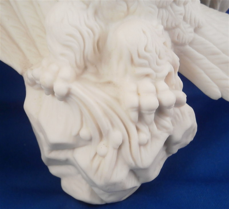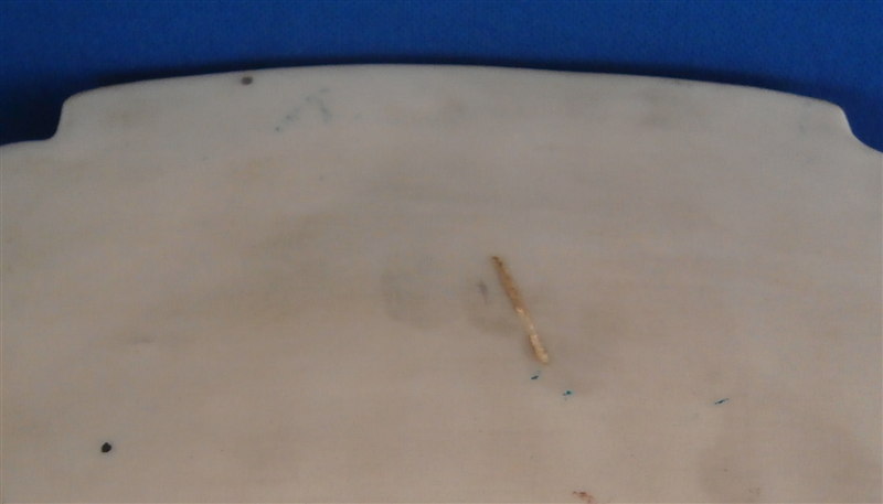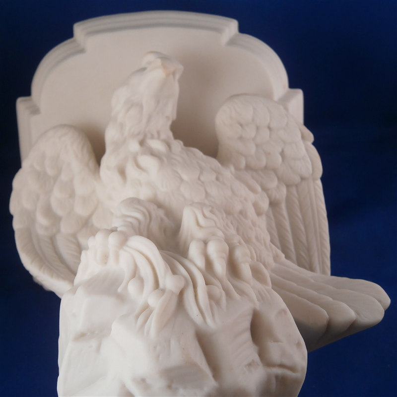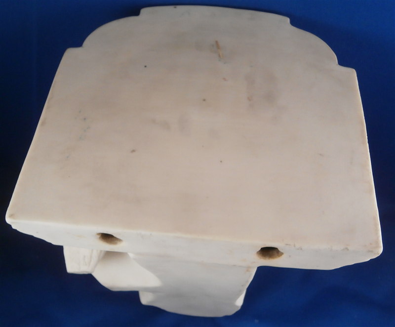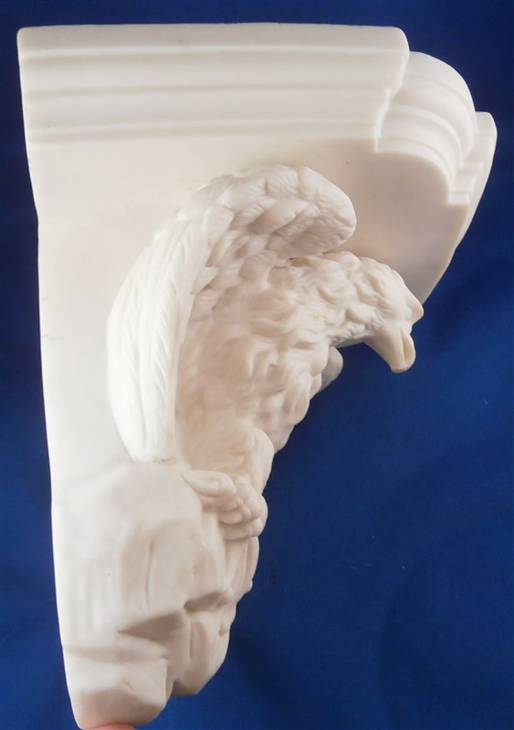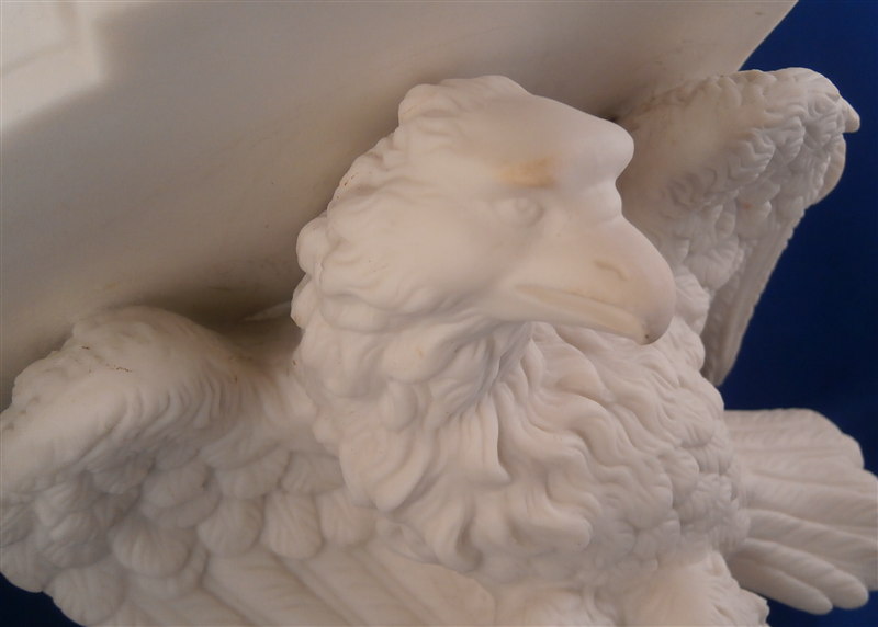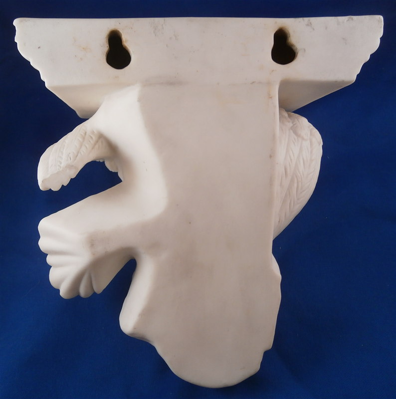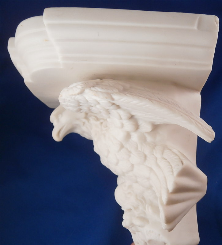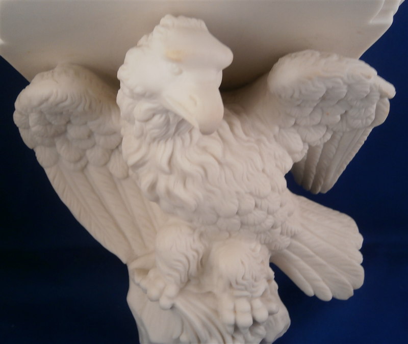 This is a superb figural shelf very likely made by an American maker and certainly from the mid to late 19th century. It is very well modeled and of good quality but not what I would expect from an English makers as there are various differences in design from English pieces I have seen. The eagle is just superb and is holding an olive branch in his claws. Certainly a very rare and fun piece plus quite unusual. The piece is in great condition with a chip on the right side of the right back corner as well as a few very minor firing flaws the biggest being on the top surface where there is a line in the paste that resulted from an impurity to the paste. Now to my reasoning why I think it is American. It is unmarked which in this period on English porcelain is not common anymore, the entire piece isn't as perfect as one would expect from a maker that has been around for a long time with the surfaces on top and the back being a bit uneven when put on a flat surface and the holes for hanging are uneven and made by hand. The eagle is very well done much better than most I have seen in porcelain which makes sense as well. So there are my reasons :) As always feel free to chime in! The piece is 7 inches from top to bottom, 6.25 inches deep and 6.75 inches wide. Please email me for more information or other pictures.