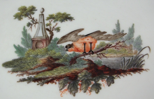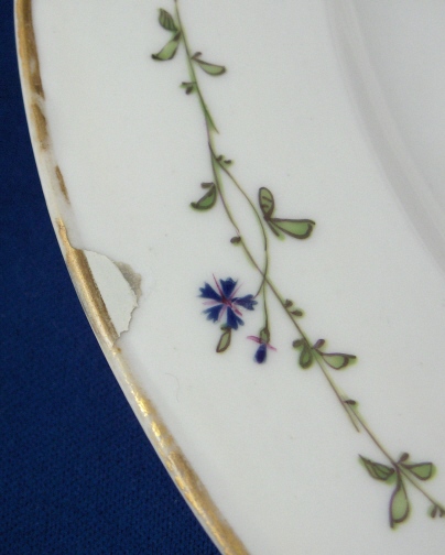 This is a plate made by Oude Amstel in about 1790. Oude Amstel was transferred from the Loosdrecht site around 1784. Not much changed afterwards and they soon ran into trouble again and in 1809 they were moved to the Nieuve Amstel site. The plate is nicely handpainted with a large scene in the center of a bird in a landscape surrounding with some kind of obelisk type piece on the left side. Five small scattered cornflowers through the center as well as a cornflower garland around the rim and a gold trim to the edge. The quality of the scene is superb! The plate is in decent condition with three not so well restored chips to the rim and another nibble. There is some wear mainly to the gold trim of the edge of the plate. But all in all a superb and very rare example of a hard to find maker. The plate is marked with the underglaze blue Amstel mark as well as an incised L4, an o and an incised line. It is 10.25 inches in diameter so a nice size. Please email me for more information or other pictures.