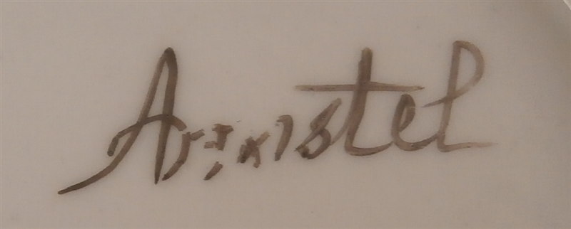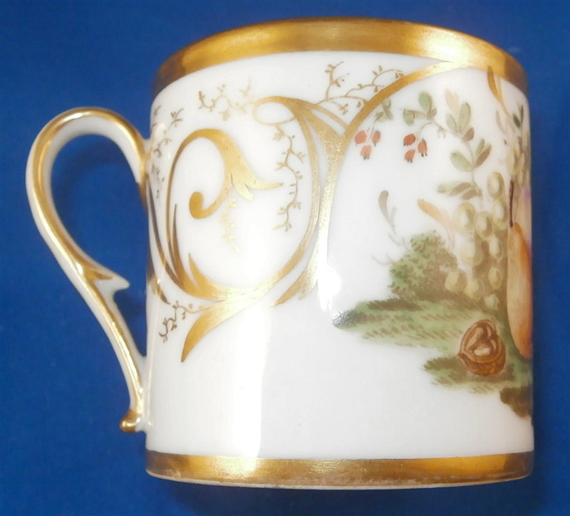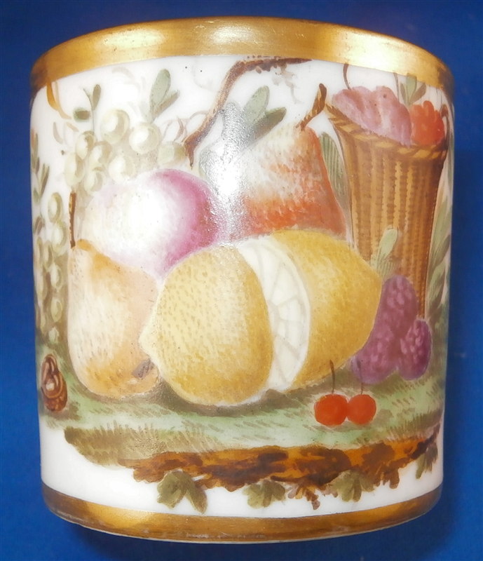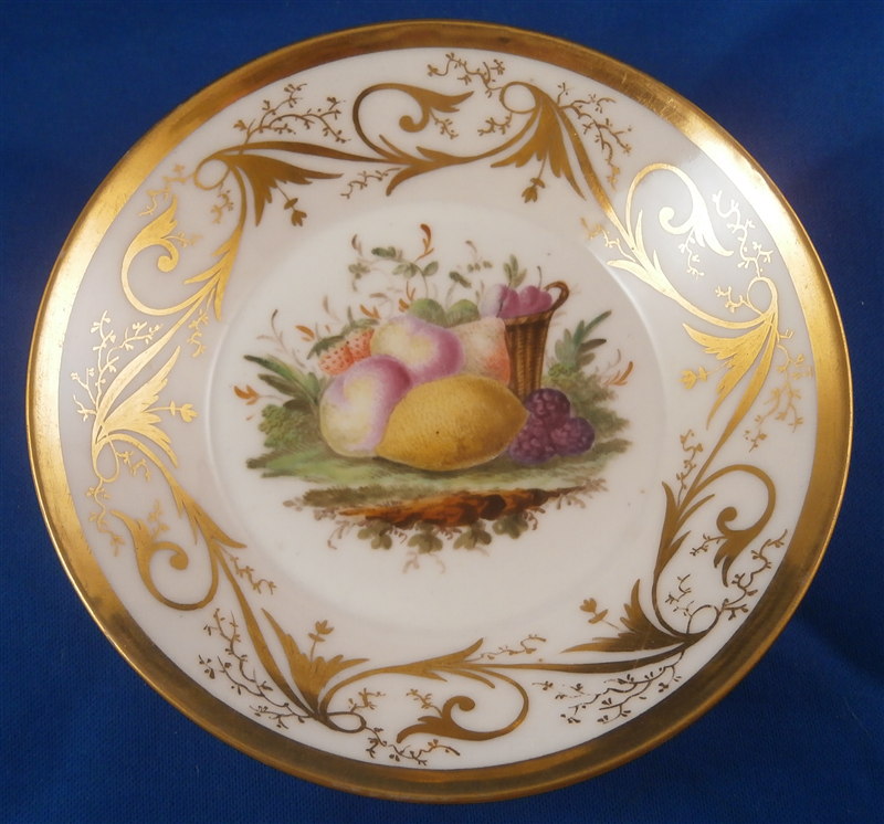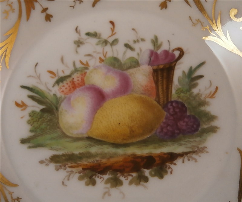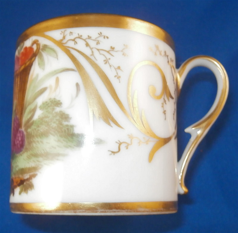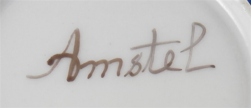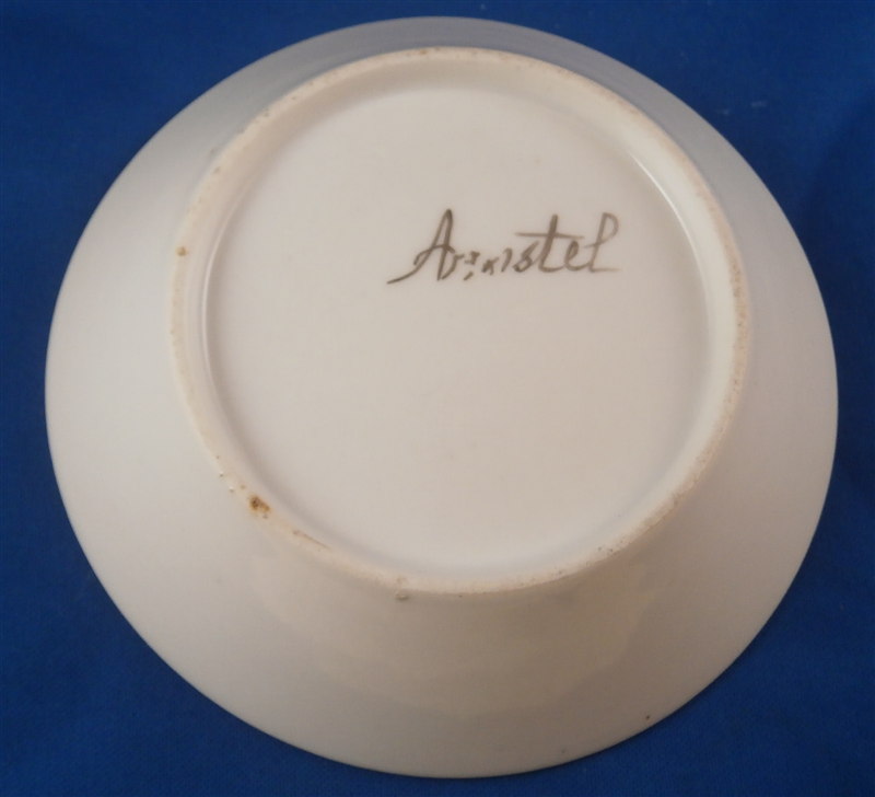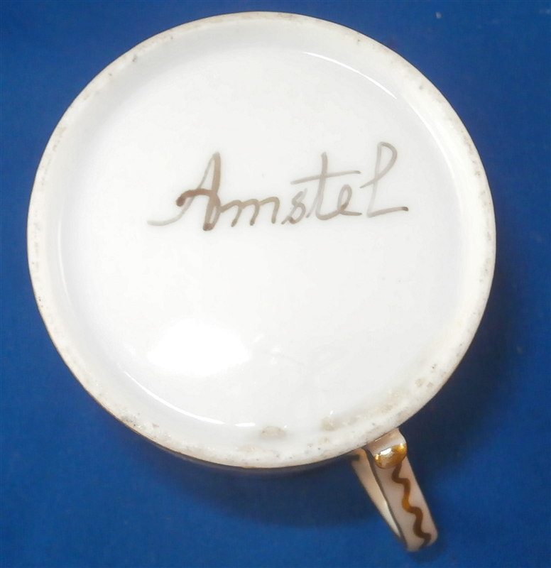 This is a superb cup and saucer made by Amstel in about 1809. It is handpainted with a nice scene of a fruit basket with fruit and berries spilling out onto the grass and an elaborate gold trim. There is a lemon (cut in half on the cup), some pear, peaches, blackberries, cherries, strawberries and so on. Both pieces are in perfect condition which is always a plus :) They are marked with the above glaze black Amstel mark rarely used. The cup also has the incised script L mark often found on porcelain by the Dutch makers from Loosdrecht to Amstel. The cup is 2.375 inches tall and the same in diameter. The saucer is 1.125 inches tall and 5 inches in diameter. Please email me for more information or other pictures.