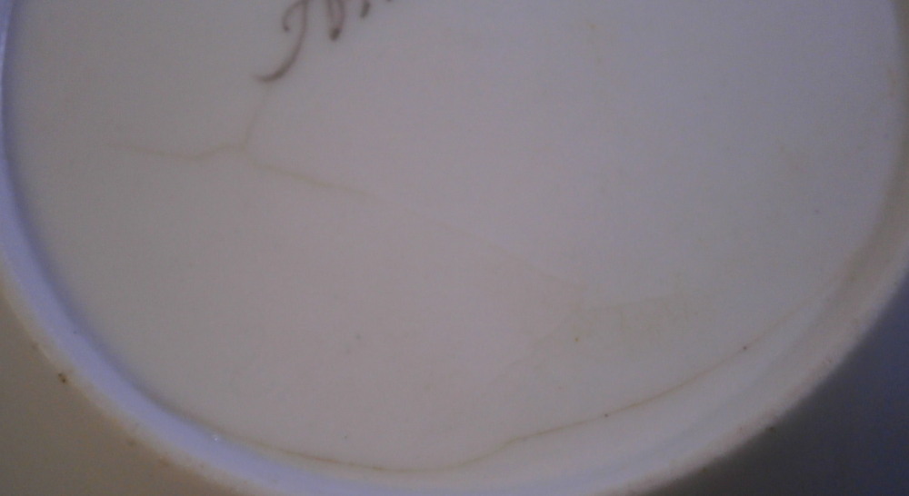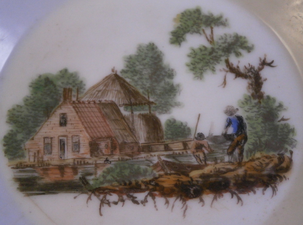 This is a saucer made by Amstel in the early 19th century around 1809. It is hand painted with nice scene in the center of a building near some water in a landscape surrounding including two guys on the opposite shore. One looks like he is ready to get in a boat that is sitting near them. A bit of gold trim to the edge. The saucer displays OK but there is a chip to the edge as shown, a larger black firing spot on the rim and some crazing and glaze lines some of which are stained as well as one you can see from the top and bottom around the edge of the well under the scene. You cannot feel them with your fingernail and the stained line seems to be under the glaze but I am not sure. It's not very obvious when on display mainly because of its location. It is still a nice example and a very hard to find one. The chip could easily be restored if one wanted to. The piece is marked with the rarely used over glaze black script Amstel mark as well as an incised script R and A in different locations underneath. The piece is 1 inch tall and just under 5 inches in diameter. Please email me for more information or other pictures.