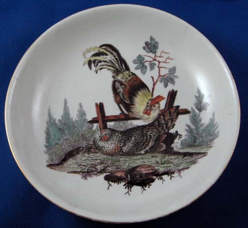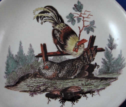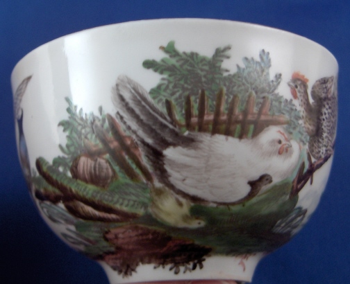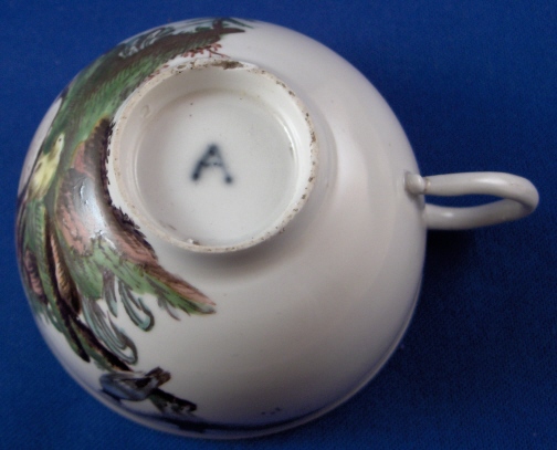 This is a cup and saucer set made by Ansbach in about 1775. They started making porcelain around 1758 and the factory flourished from 1758 through 1777. It closed somewhere around 1860. The set is marked with the underglaze blue A mark underneath. The cup has a 2 impressed on the footring and the saucer has an incised mark I cannot quite make out. Both pieces are superbly handpainted with a scene with chicken in a landscape backdrop and the cup also has two other birds on the side. Gold trim to rims and handle. The cup is 1.875 inches tall and 3 inches in diameter. The saucer is 1.125 inches tall and 5.125 inches in diameter. The set is in great condition with a chip to the footring of the cup and a hairline to the bottom of the handle with a teeny chip on it. Handle is perfectly stable! Please email me for more information or photos.