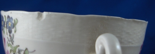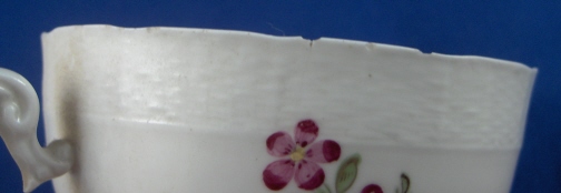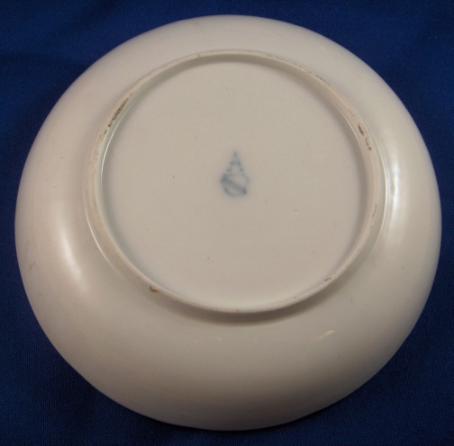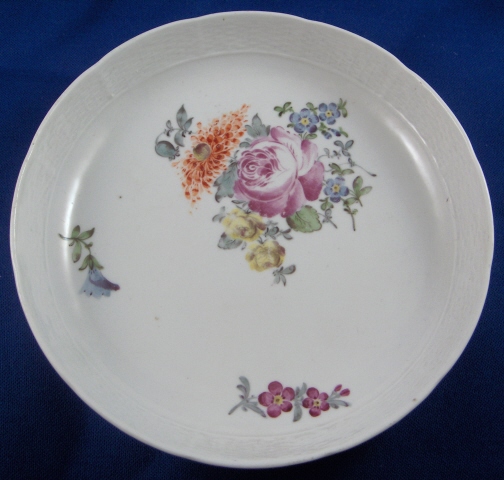 This is a cup and saucer made by Ansbach around 1765. They started making porcelain around 1758 and the factory flourished from 1758 through 1777 after which it closed somewhere around 1860. The factory was already in private hands since 1807. The set is marked with the underglaze blue A over the shield mark underneath. The cup has a 5 impressed on the inside footring. Both pieces are handpainted with colorful flowers of good quality and they both have a relief basketweave design to the rim. The cup is 1.875 inches tall and 3.25 inches in diameter. The saucer is a bit over 1 inch tall and 5 inches in diameter. The set is in good condition with the cup having some very small chips on the top rim. Please email me for more information or photos.