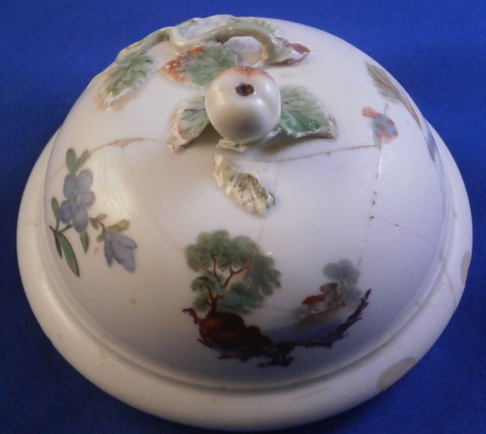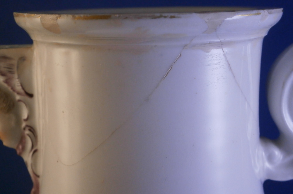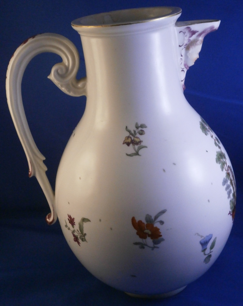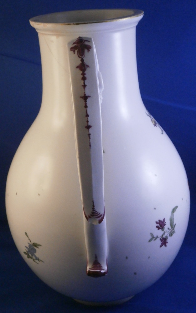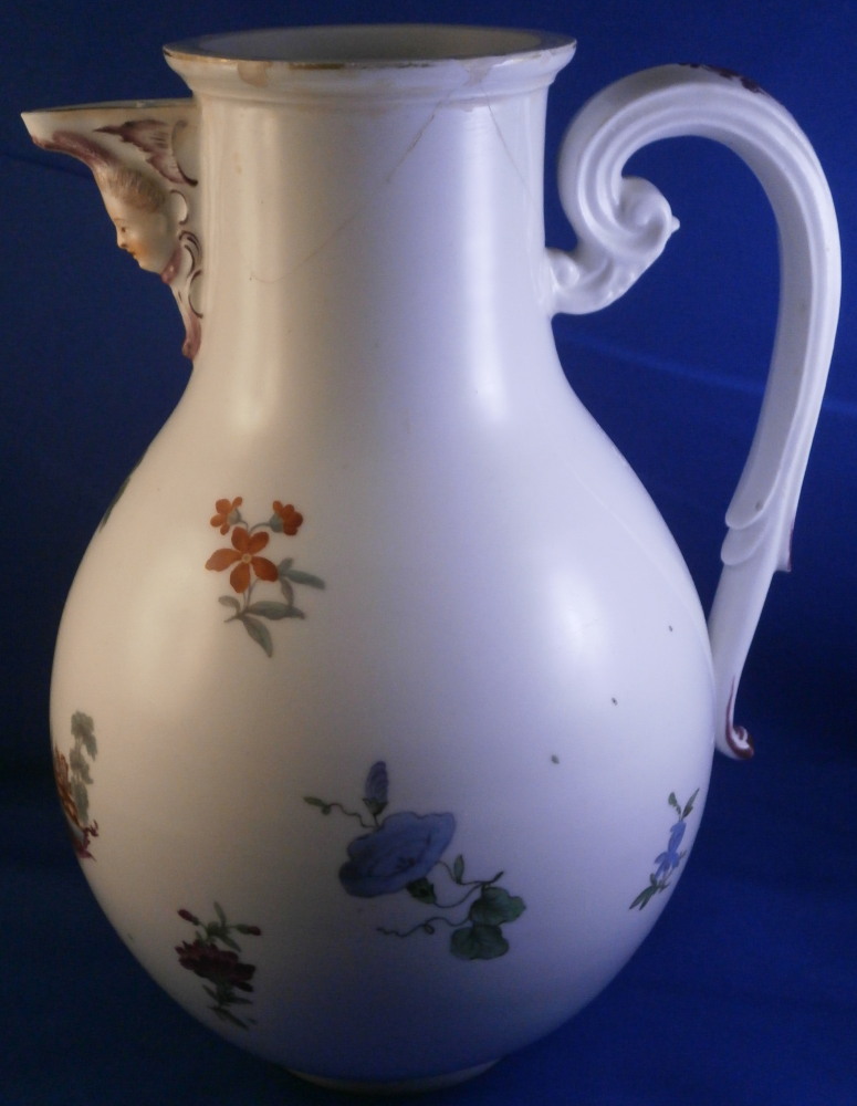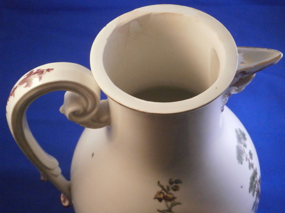 This is a large coffee pot with its lid made by Ansbach in the 18th century in their early days around 1760. They started making porcelain around 1758 and flourished from 1758 through 1777. Ansbach closed somewhere around 1860 but was already in private hands since 1807. The pot is marked is unmarked but the style of pot as well as that characteristic maskaron / lady's head under the spout, that fancy fruit finial with all those leaves and the handle shape give it away as having been made by this maker. Not a common maker to find at all and this scenic pieces is a very early example. It has a nice hand painted scene to the front of the pot with some puce scrollwork under it with lots of flowers scattered around the rest of the piece. Lots of green spots to cover flaws in the porcelain from when it was made. Normally maker's did tiny leaves or flowers but on this early example they just added a spot of green color. Gold trim to the spout and top edge and a puce trim to the handle. The lid has a pear fruit finial to it with a long branch coming off it with lots of leaves. More elaborate than all other finials in the porcelain world I think. There is also a small scene with puce scrolls under it on the lid and some flowers. The pot including lid is about 10.75 inches tall and 5.5 inches in diameter. It is about 6.375 inches from handle to spout. The piece displays nicely but has had a museum repair to it. So it is still visible. There is a chip to the point coming off the handle as shown, there is a large chunk that come out of the top with a hairline going into the piece in the other direction from that and the lid has been in pieces and repaired with a piece of the branch missing from the finial and some of the leaves are chipped as well. The repair does the trick but off course it could be done much better if one wanted to hide it perfectly. A good restorer could do that easily. Still an amazing example! Please email me for more information or photos.