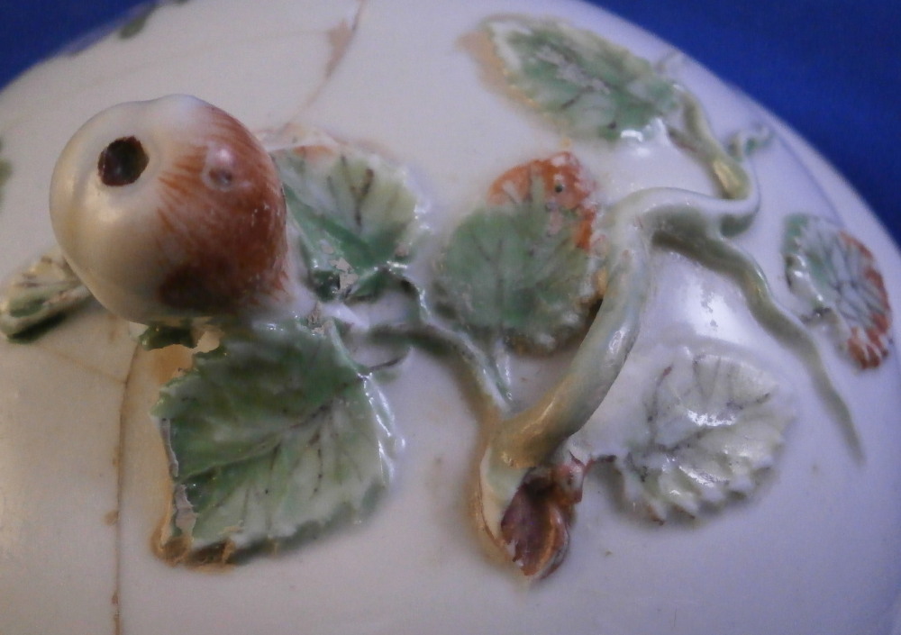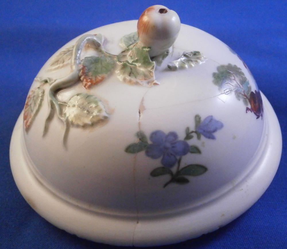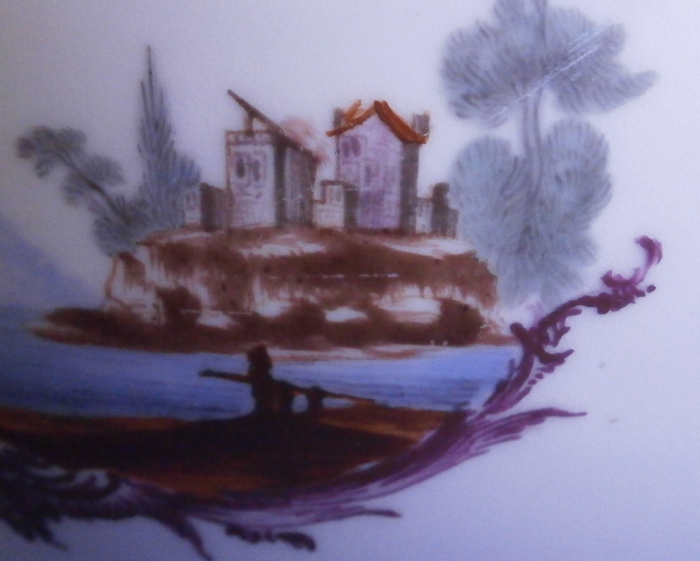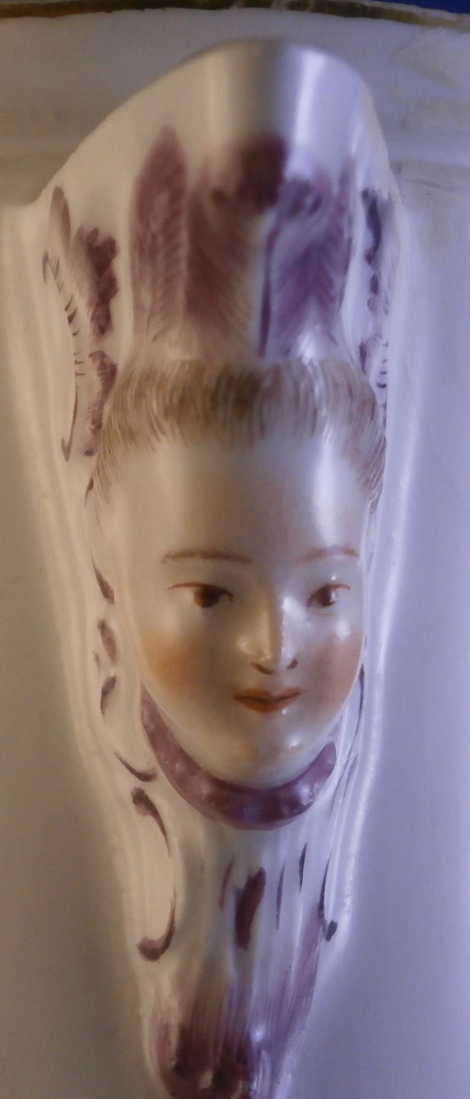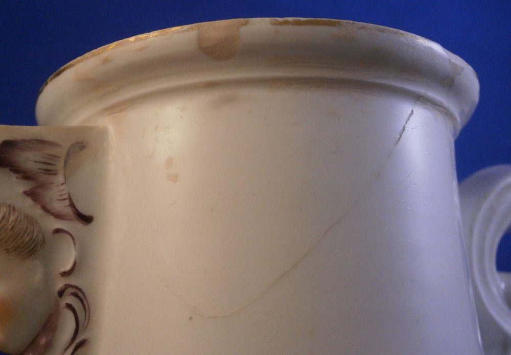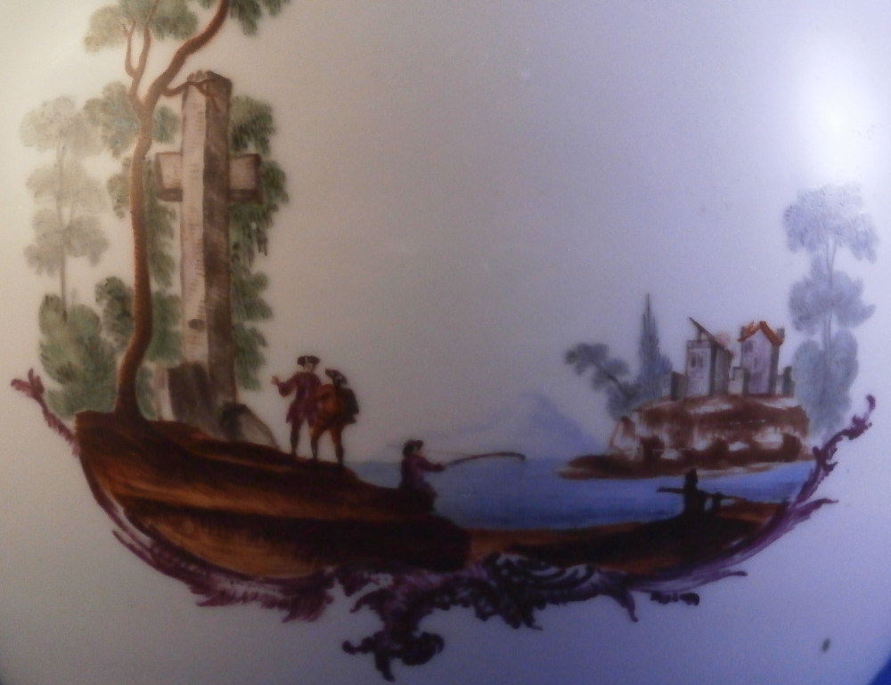 This is a large coffee pot with its lid made by Ansbach in the 18th century in their early days around 1760. They started making porcelain around 1758 and flourished from 1758 through 1777. Ansbach closed somewhere around 1860 but was already in private hands since 1807. The pot is marked is unmarked but the style of pot as well as that characteristic maskaron / lady's head under the spout, that fancy fruit finial with all those leaves and the handle shape give it away as having been made by this maker. Not a common maker to find at all and this scenic pieces is a very early example. It has a nice hand painted scene to the front of the pot with some puce scrollwork under it with lots of flowers scattered around the rest of the piece. Lots of green spots to cover flaws in the porcelain from when it was made. Normally maker's did tiny leaves or flowers but on this early example they just added a spot of green color. Gold trim to the spout and top edge and a puce trim to the handle. The lid has a pear fruit finial to it with a long branch coming off it with lots of leaves. More elaborate than all other finials in the porcelain world I think. There is also a small scene with puce scrolls under it on the lid and some flowers. The pot including lid is about 10.75 inches tall and 5.5 inches in diameter. It is about 6.375 inches from handle to spout. The piece displays nicely but has had a museum repair to it. So it is still visible. There is a chip to the point coming off the handle as shown, there is a large chunk that come out of the top with a hairline going into the piece in the other direction from that and the lid has been in pieces and repaired with a piece of the branch missing from the finial and some of the leaves are chipped as well. The repair does the trick but off course it could be done much better if one wanted to hide it perfectly. A good restorer could do that easily. Still an amazing example! Please email me for more information or photos.