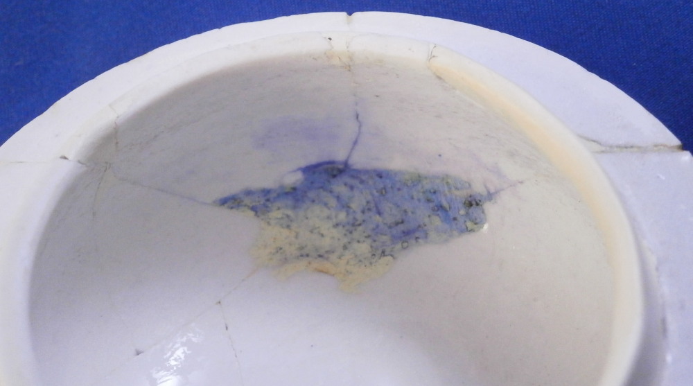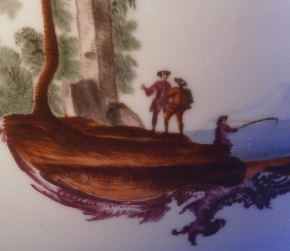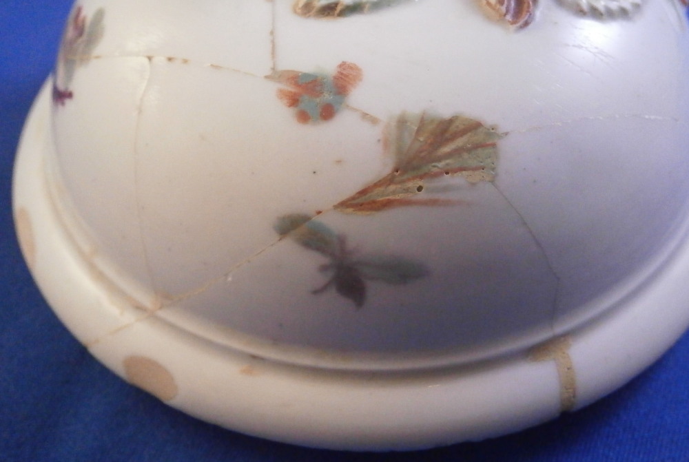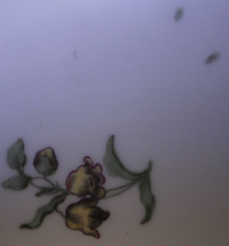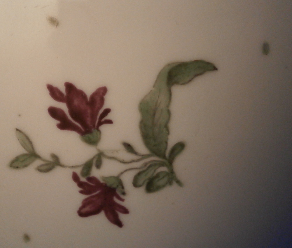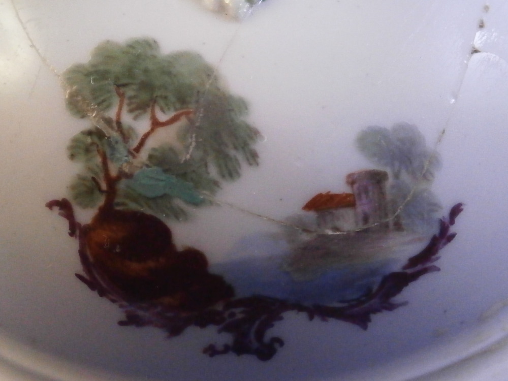 This is a large coffee pot with its lid made by Ansbach in the 18th century in their early days around 1760. They started making porcelain around 1758 and flourished from 1758 through 1777. Ansbach closed somewhere around 1860 but was already in private hands since 1807. The pot is marked is unmarked but the style of pot as well as that characteristic maskaron / lady's head under the spout, that fancy fruit finial with all those leaves and the handle shape give it away as having been made by this maker. Not a common maker to find at all and this scenic pieces is a very early example. It has a nice hand painted scene to the front of the pot with some puce scrollwork under it with lots of flowers scattered around the rest of the piece. Lots of green spots to cover flaws in the porcelain from when it was made. Normally maker's did tiny leaves or flowers but on this early example they just added a spot of green color. Gold trim to the spout and top edge and a puce trim to the handle. The lid has a pear fruit finial to it with a long branch coming off it with lots of leaves. More elaborate than all other finials in the porcelain world I think. There is also a small scene with puce scrolls under it on the lid and some flowers. The pot including lid is about 10.75 inches tall and 5.5 inches in diameter. It is about 6.375 inches from handle to spout. The piece displays nicely but has had a museum repair to it. So it is still visible. There is a chip to the point coming off the handle as shown, there is a large chunk that come out of the top with a hairline going into the piece in the other direction from that and the lid has been in pieces and repaired with a piece of the branch missing from the finial and some of the leaves are chipped as well. The repair does the trick but off course it could be done much better if one wanted to hide it perfectly. A good restorer could do that easily. Still an amazing example! Please email me for more information or photos.