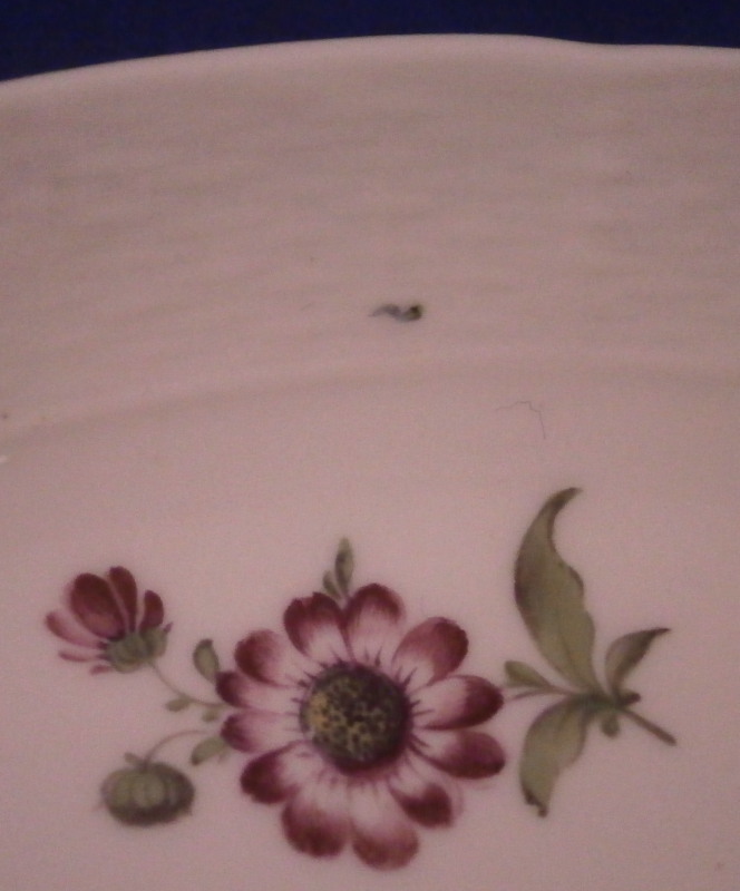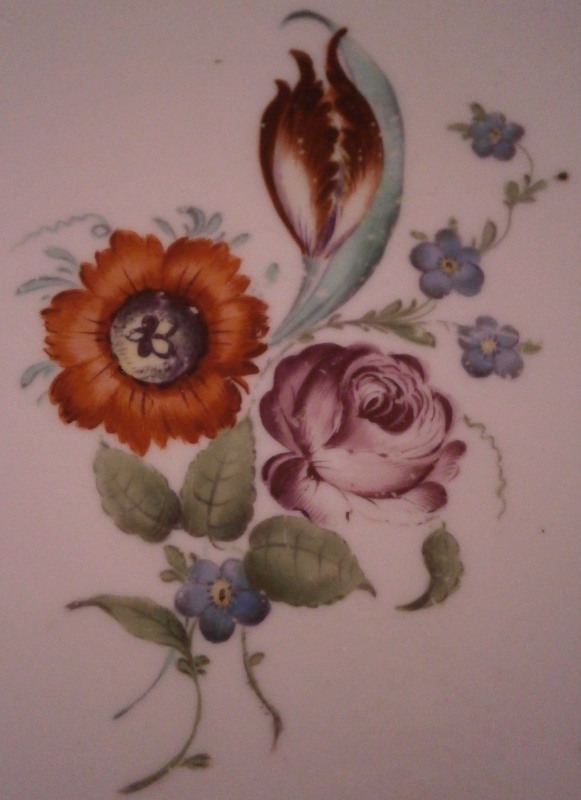 This is a nice saucer made by Ansbach around 1765. They started making porcelain around 1758 and the factory flourished from 1758 through 1777 after which it closed somewhere around 1860 after being in private hands since 1807. The saucer is nicely hand painted with a floral arrangement in the center as well as two single flowers and a few tiny leaves to hide some firing flaws. Basket weave design to the paste along the rim. The piece is marked with their early impressed shield mark which until now I had only seen on figures so this was a first for me. A nice example to own. The saucer is 1 inch tall and 5.5 inches in diameter. It is in great condition with a tiny bit of wear and a tight stable hairline to the rim as shown. It still rings like a bell so it's nothing to worry about. Please email me for more information or photos.