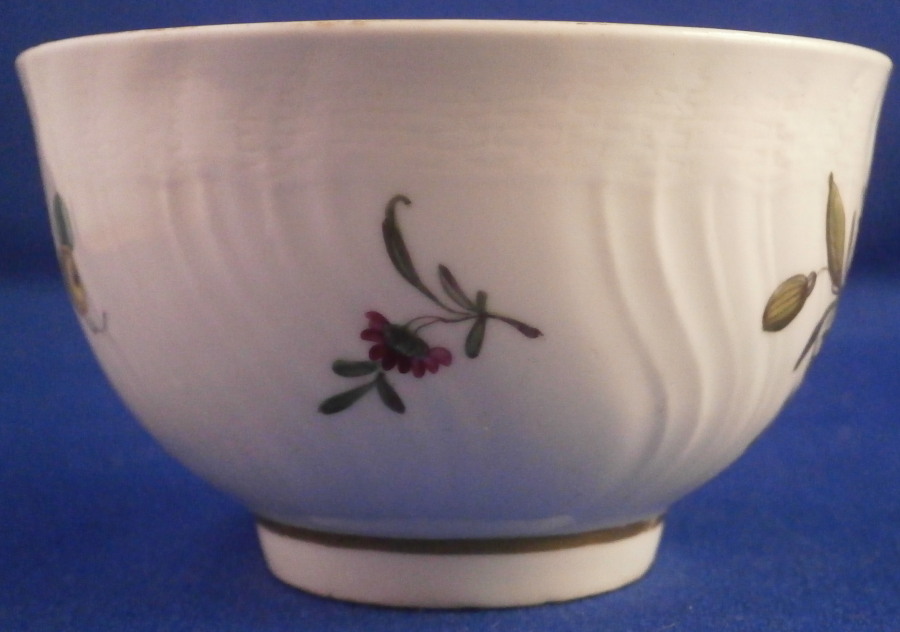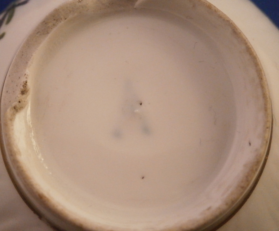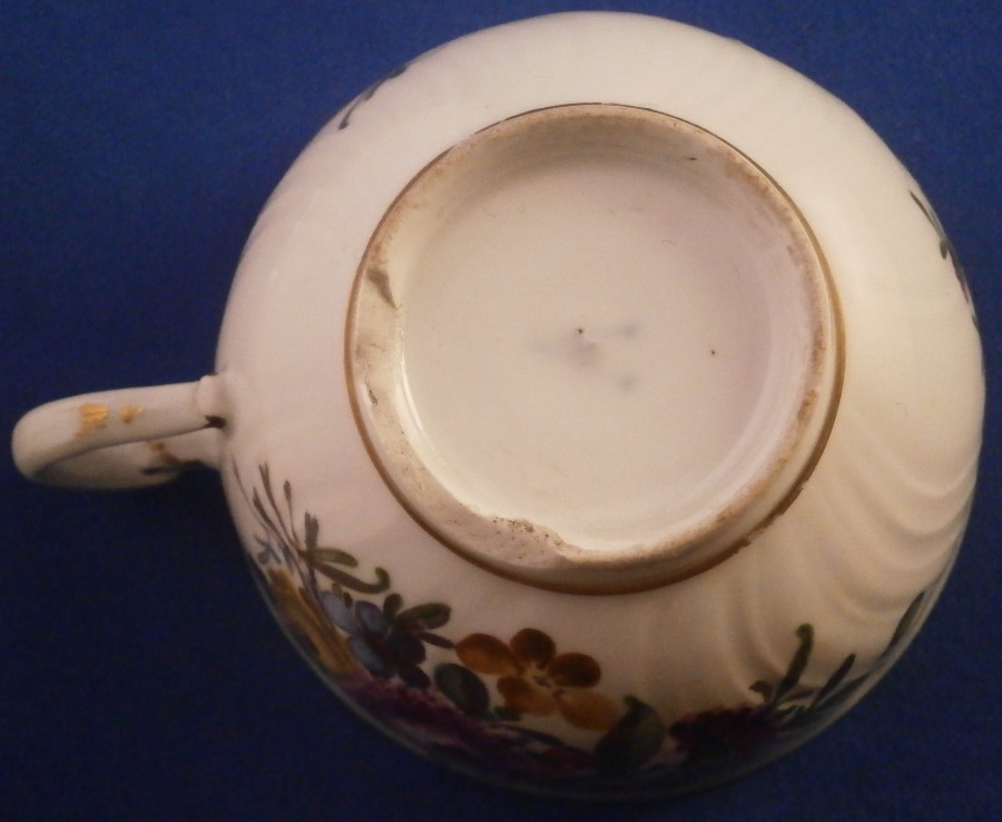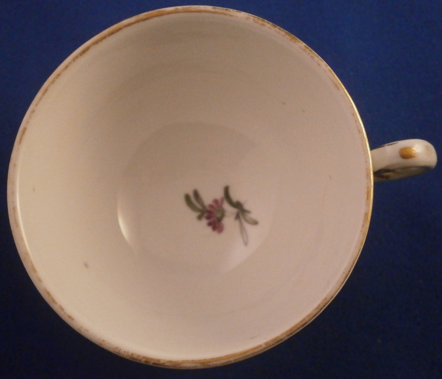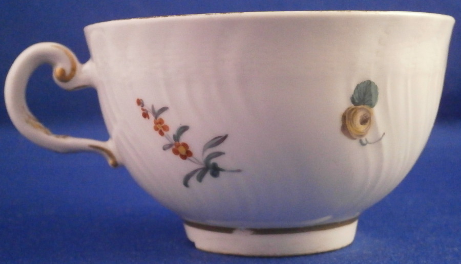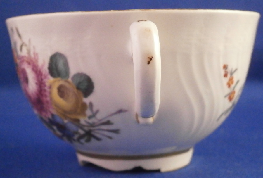 This is a nice single cup made by Ansbach around 1770. They started making porcelain around 1758 and the factory flourished from 1758 through 1777 after which it closed somewhere around 1860. The piece is marked with the under glaze blue A mark underneath as shown. The cup is hand painted with a nice colorful floral arrangement on one side and small single flowers to the other side as well as inside bottom. Typical handle shape and it also has a relief to the paste which looks superb! Gold trim to the handle and top and bottom. The cup is 1.875 inches tall and 3 inches in diameter. It is in good condition but has some chipping along the footring which is not overly distracting when on display and wear to the gold trim along the top edge. Please email me for more information or photos.