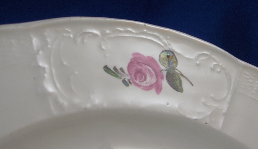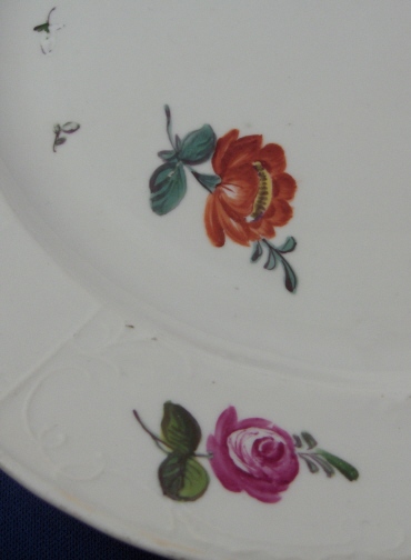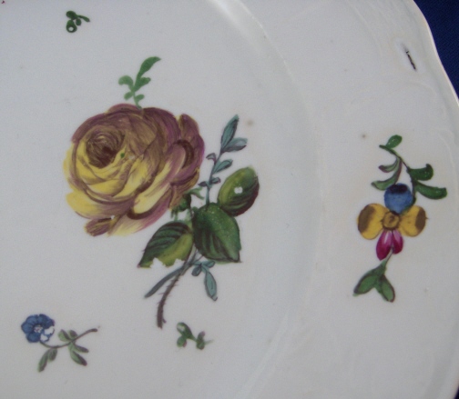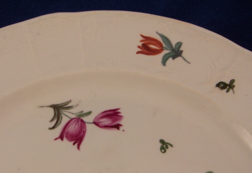 This is a plate made by Ansbach in about 1770. Ansbach started making porcelain around 1758. The factory flourished from 1758 through 1777 and closed somewhere around 1860 but was already in private hands since 1807. The plate is marked with the underglaze blue A. mark underneath. It also has an incised N near the footring. The plate is handpainted with colorful flowers all around as well as a nice relief pattern on the rim. It is a bit over 1 inch tall and 9.375 inches in diameter. The plate is in great condition with a factory flaw on the rim (a black line where there must have been an impurity during the firing) and a little wear to some flowers but nothing major. Please email me for more information or photos.