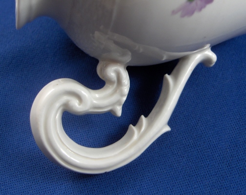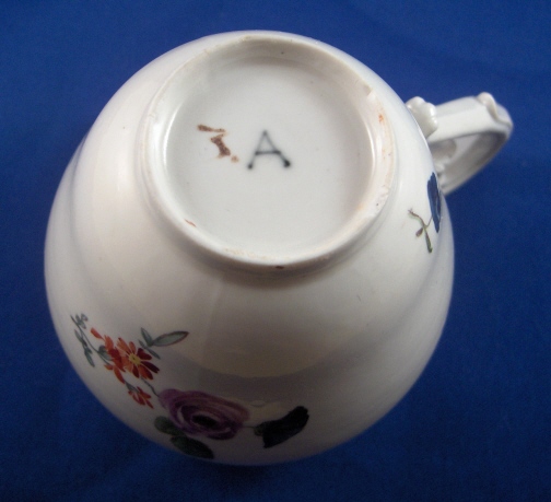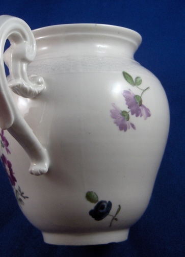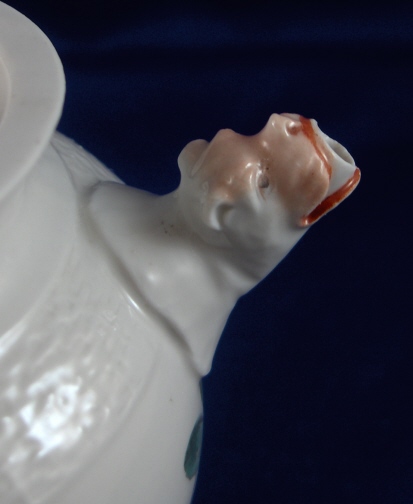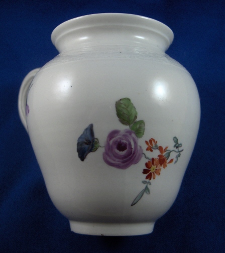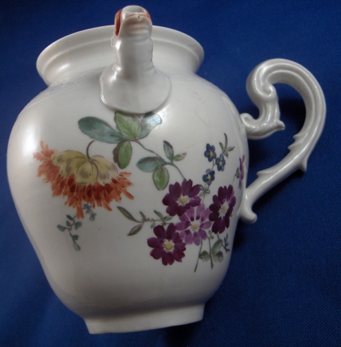 This is a small lidded teapot or large creamer made by Ansbach in the 18th century around 1770. They started making porcelain around 1758 and flourished from 1758 through 1777. Ansbach closed somewhere around 1860 but was already in private hands since 1807. The pot is marked with the underglaze blue A mark underneath and maybe a brown 3. but it might just a dirt mark that happened during the firing. The pot is nicely handpainted with a larger flower arrangement in the front a smaller one in the back and two single flowers as well. The lid has three tiny flowers painted on it. The nicest thing about this pot is the figural spout shaped like the head of a pug dog, the superbly molded handle and basketweave trim. The finial is very nice as well being a single flowers with three leaves. The pot including lid is 4.75 inches tall and 3 inches in diameter. The side handle sticks out 1.375 inches and the spout about one inch. The piece is in great condition with a teeny firing flaw or chip to the underside of the spout, a firing crack to the inside bottom of the pot which does not go through, a small chip to the footring and the stem of the flower on the finial is missing. Nothing that matters much on a superb and rare piece like this. Please email me for more information or photos.