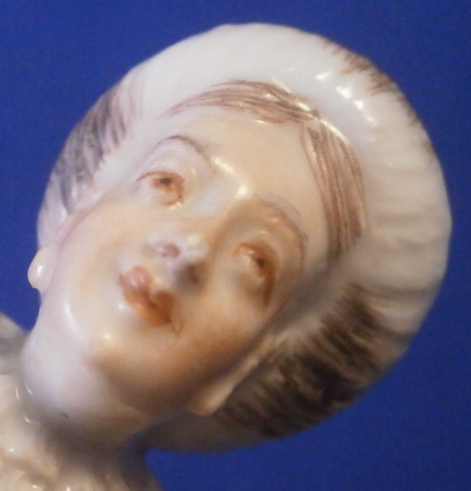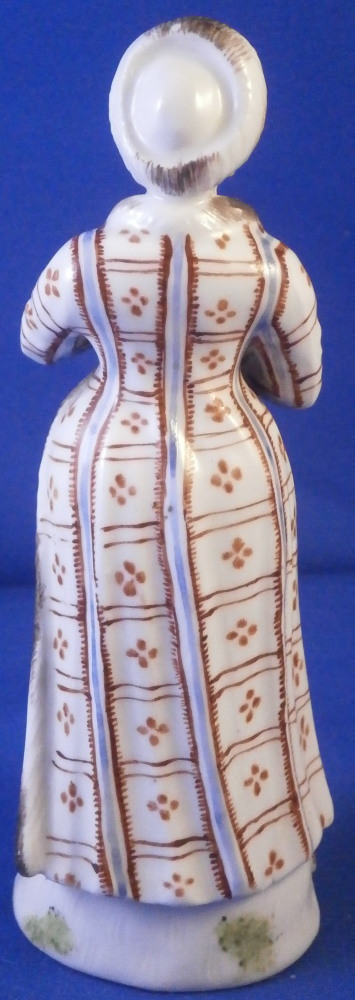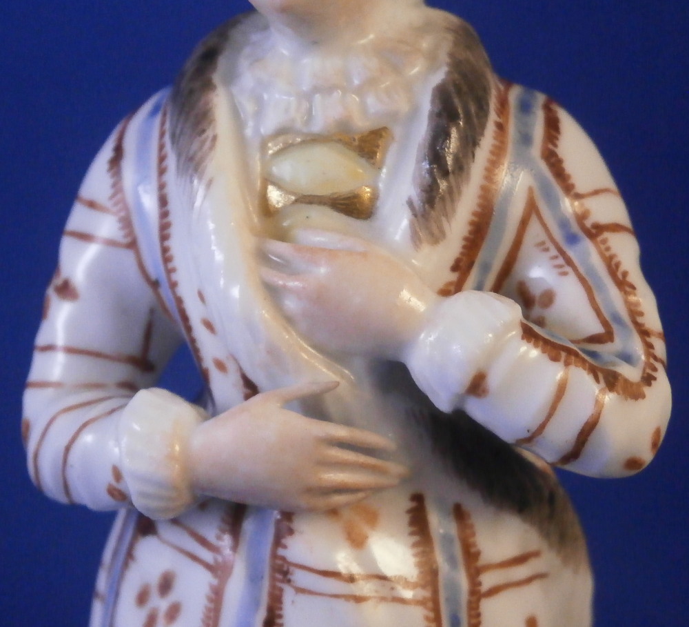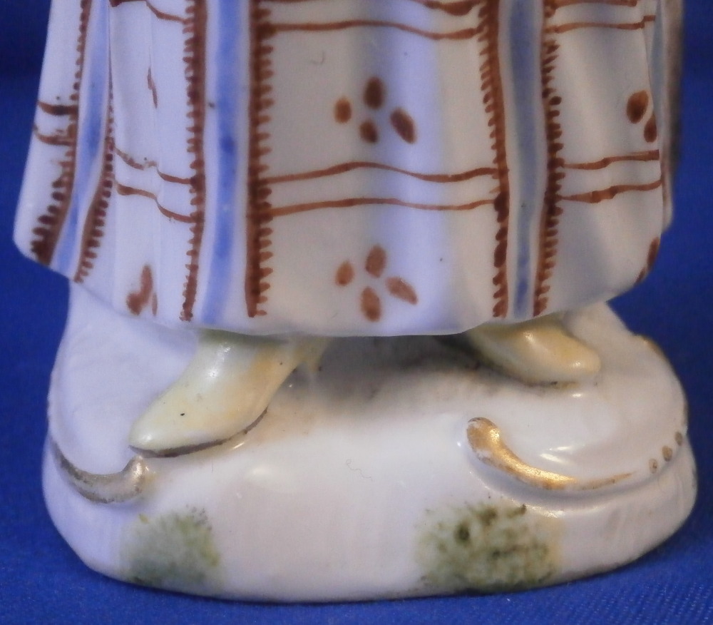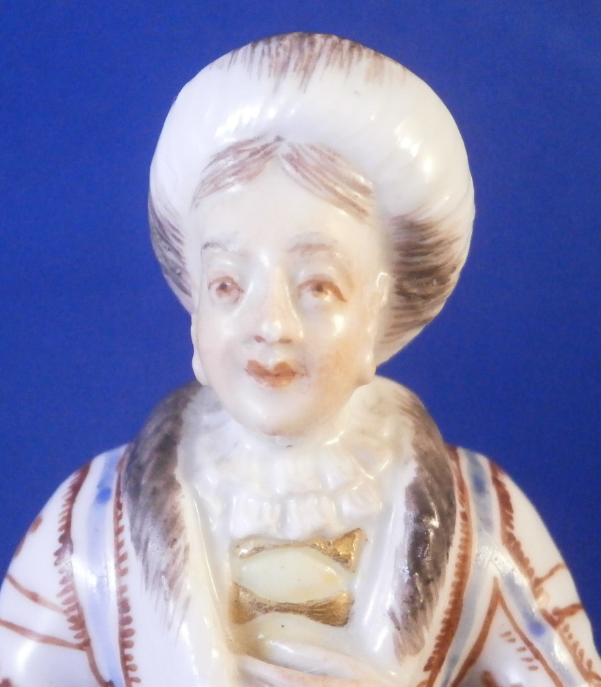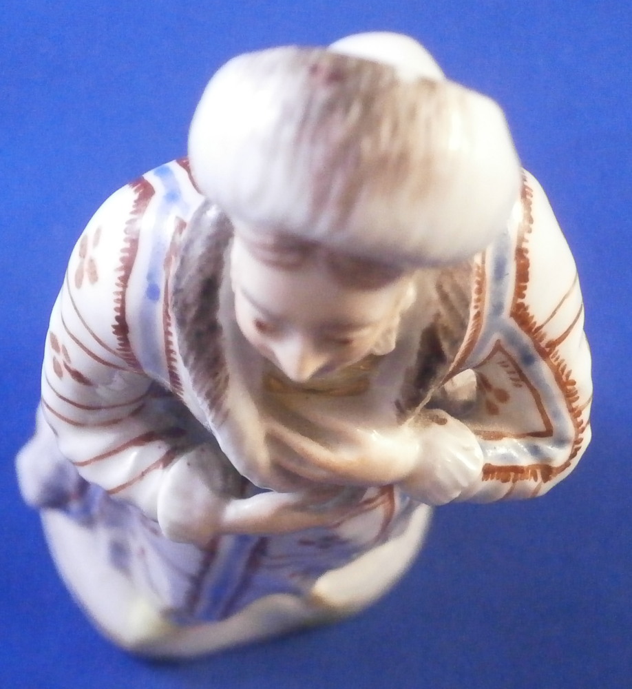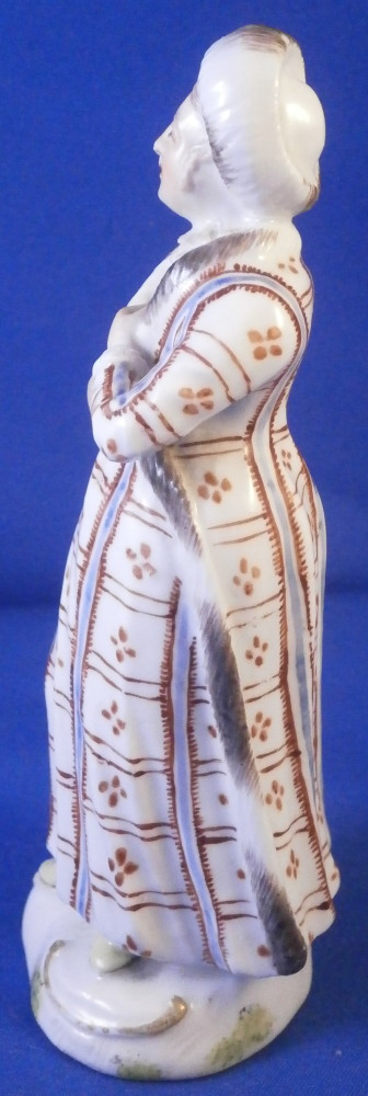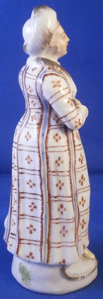 This is a rare figurine made made by Ansbach in the 18th century.The figure is from their Nations du Levant series from about 1767 and represents a Wallachian Princess. Wallachia is a region of modern day Romania. The figurine is of a nicely dressed lady wearing a fur hat and fur lines coat that is painted with a red and blue design. Typical base for this maker with a touch of green to it and simple gilded scrolls. Ansbach started making porcelain around 1758 and the factory flourished from 1758 through 1777. They closed somewhere around 1860 but the factory was already in private hands since 1807. The figurine is not marked underneath which is also typical of Ansbach since their figures where never marked with the factory marks. Another typical thing is that their figurines are pretty lightweight and this piece is no exception. The figurine is 4.625 inches tall,1.75 inches wide and 1.5 inches deep. The figure is in great condition with a small rough spot to the tip of her nose. A very rare piece that is in great shape! Please email me for more information or photos.