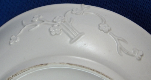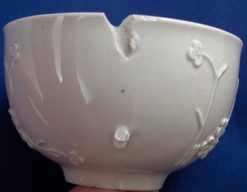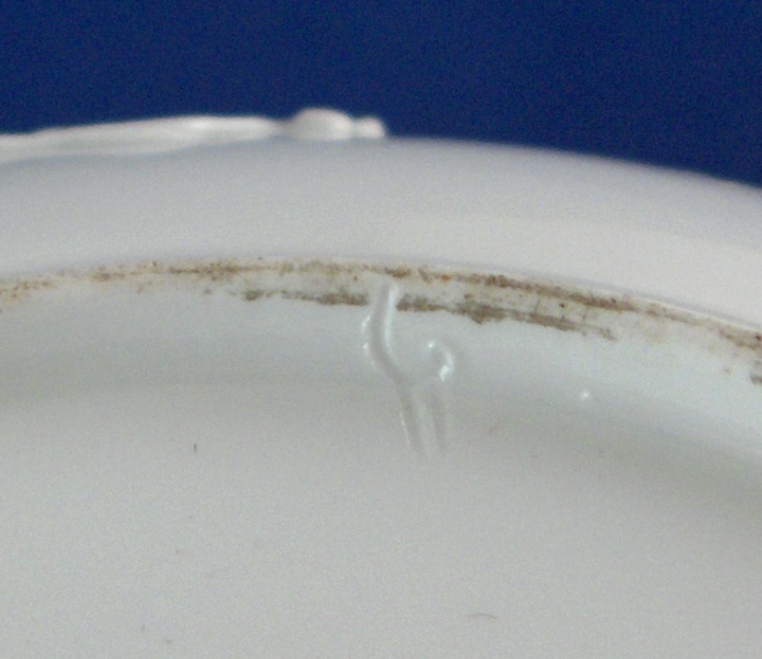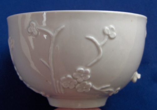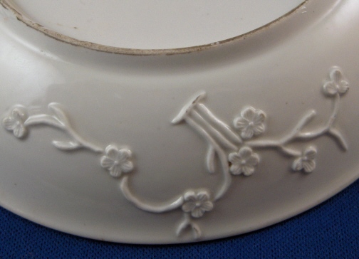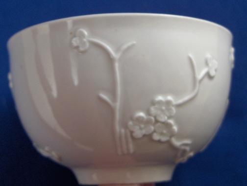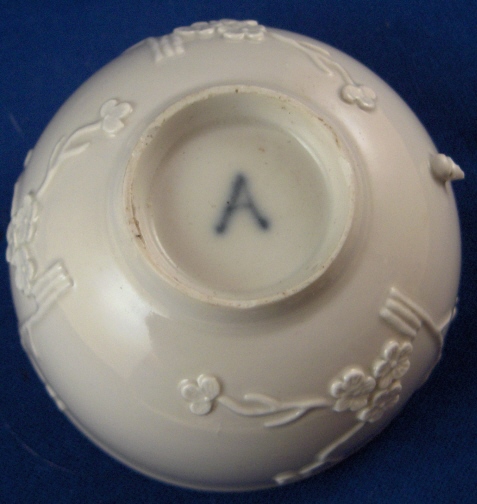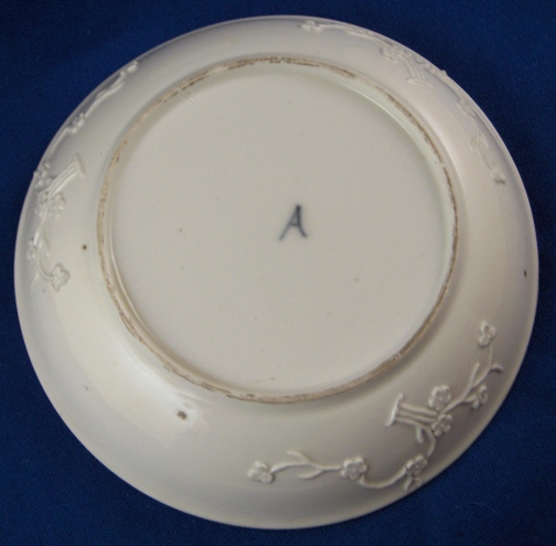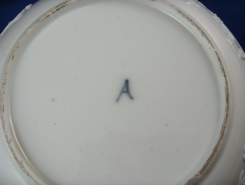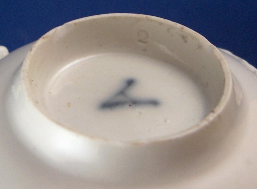 This is a cup and saucer made by Ansbach around 1760. Ansbach started making porcelain around 1758 and the factory flourished from 1758 through 1777 after which it closed somewhere around 1860. Both pieces are decorated with an applied prunus blossom design. I think it is actually applied rather than part of the mold in this case pointing to a very early manufacturing date. The set is marked with the underglaze blue A mark underneath with the cup having an impressed 2 and the saucer some hard to read incised mark on the footring. The cup is 1.75 inches tall and 2.875 inches in diameter. The saucer is a bit under 1 inch tall and 5.25 inches in diameter. Both pieces have some manufacturing flaws like black firing spots otherwise the saucer is in great condition but the cup sadly lacks its handle and has two minor chips to the footring. Still a nice example an not one you will find again anytime soon! Please email me for more information or photos.