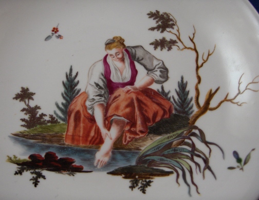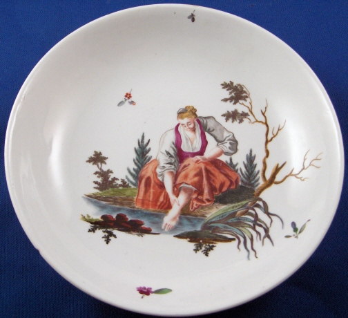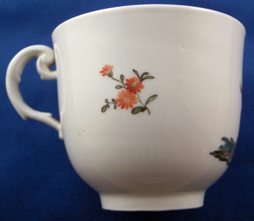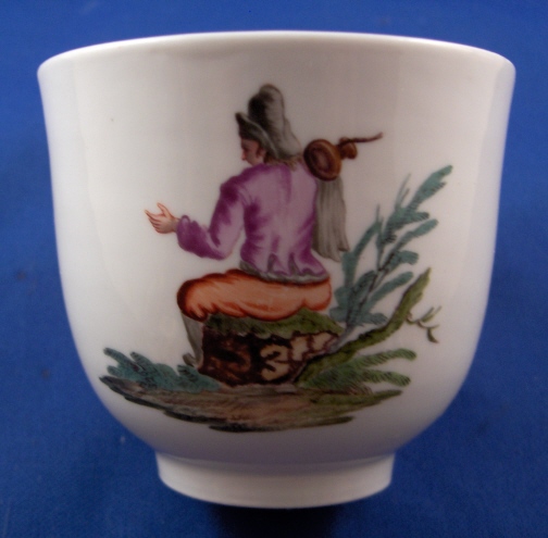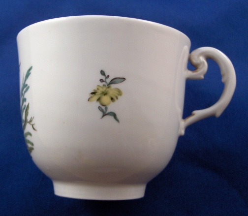 This is a superb cup and saucer made by Ansbach around 1765. It is handpainted with two amazing scenes in polychrome and the cup has their typical fancy handle shape as well. Ansbach started making porcelain around 1758 and the factory flourished from 1758 through 1777 after which it closed somewhere around 1860. The factory was already in private hands since 1807. The set is marked with the underglaze blue A mark underneath as well as an incised 10 (or something like that) on the saucer. The cup is 2.5 inches tall and 2.75 inches in diameter. The saucer is a bit over 1 inch tall and 5.25 inches in diameter. The set is in good condition with the cup being perfect and the saucer three footring chips all of which are least partially glazed and thus from the making and three very small rim chips that are mostly underneath and don't take away from the piece. Please email me for more information or photos.