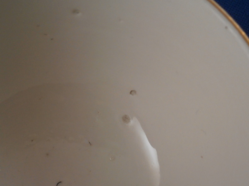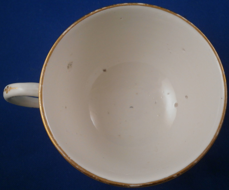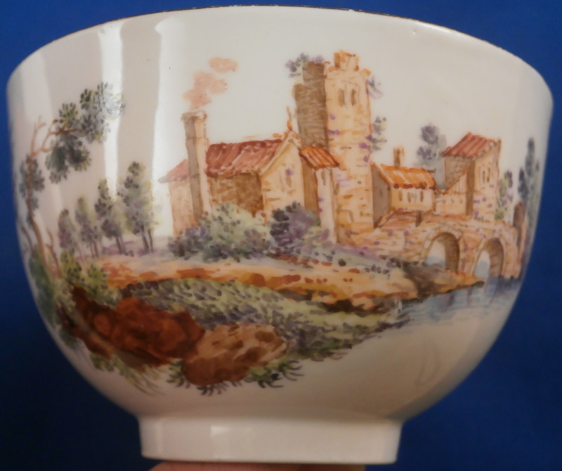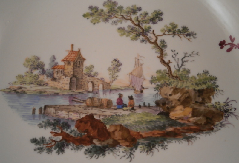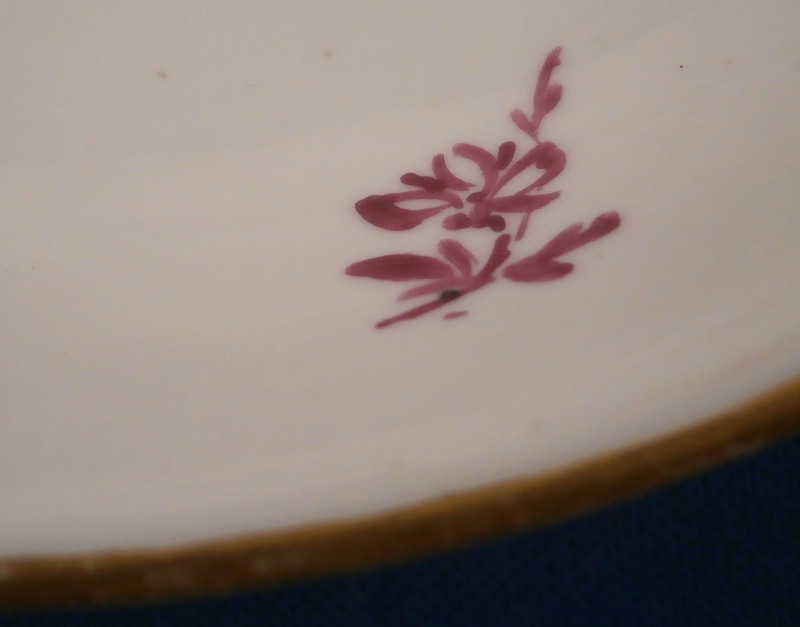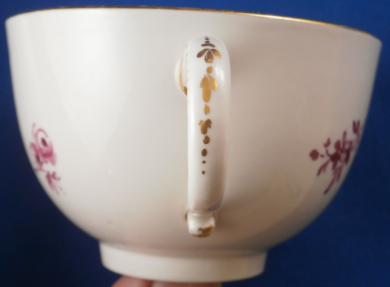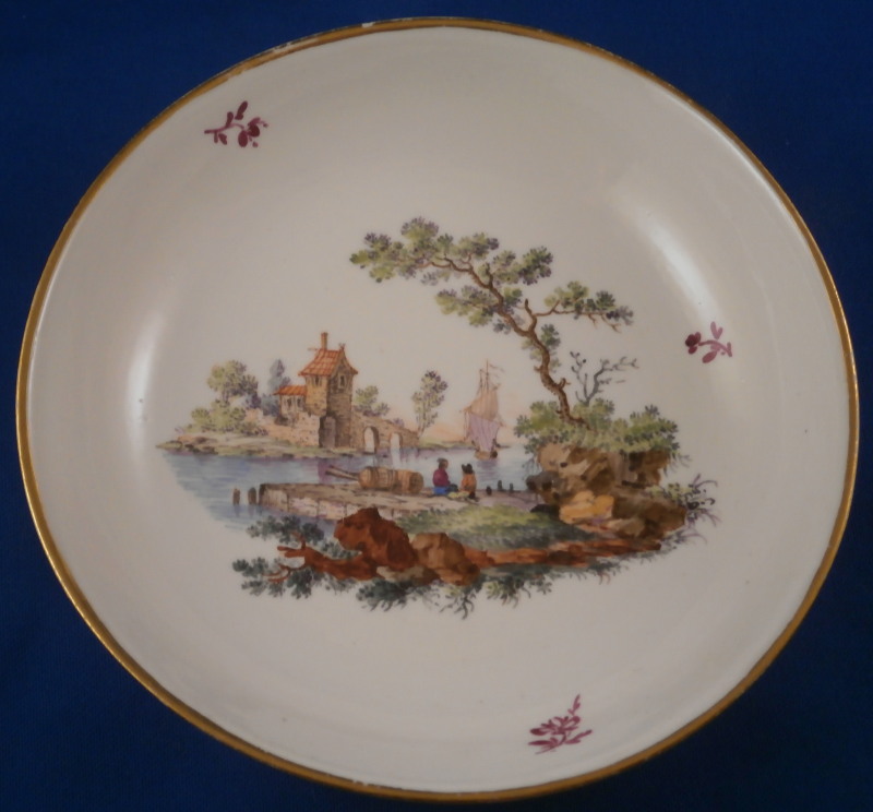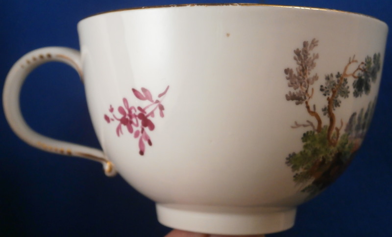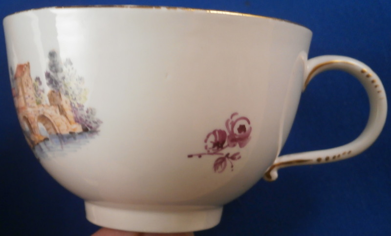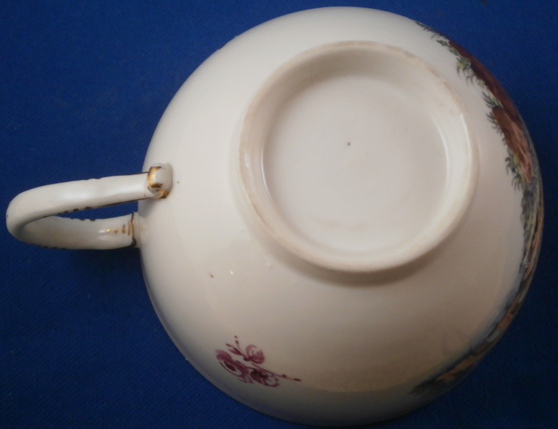 This is a nice cup and saucer made most likely by Ansbach and definitely in the 18th century. The set is hand painted with a superb polychrome scene to each piece as well as some puce small flowers and some gold trim. I have looked at this set for a long time trying to figure out the exact maker and I finally decided it had to be made by Ansbach. They started making porcelain around 1758 and the factory flourished from 1758 through 1777 after which it closed somewhere around 1860. The factory was already in private hands since 1807. The set is definitely German and from the 18th century but not by one of the major makers. And with the shape of the handle and those puce flowers it had to be by them. The set is unmarked except for a line to the foot ring which doesn't help too much. The cup is 2 inches tall and 3.125 inches in diameter. The saucer is 1.375 inches tall and 5.25 inches in diameter. The set is in great condition with some minimal wear to the gold trim and a bunch of factory flaws to the inside of the cup as shown plus a very ahrd to see hairline to the bottom end of the handle which is stable. Please email me for more information or photos.