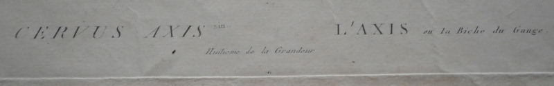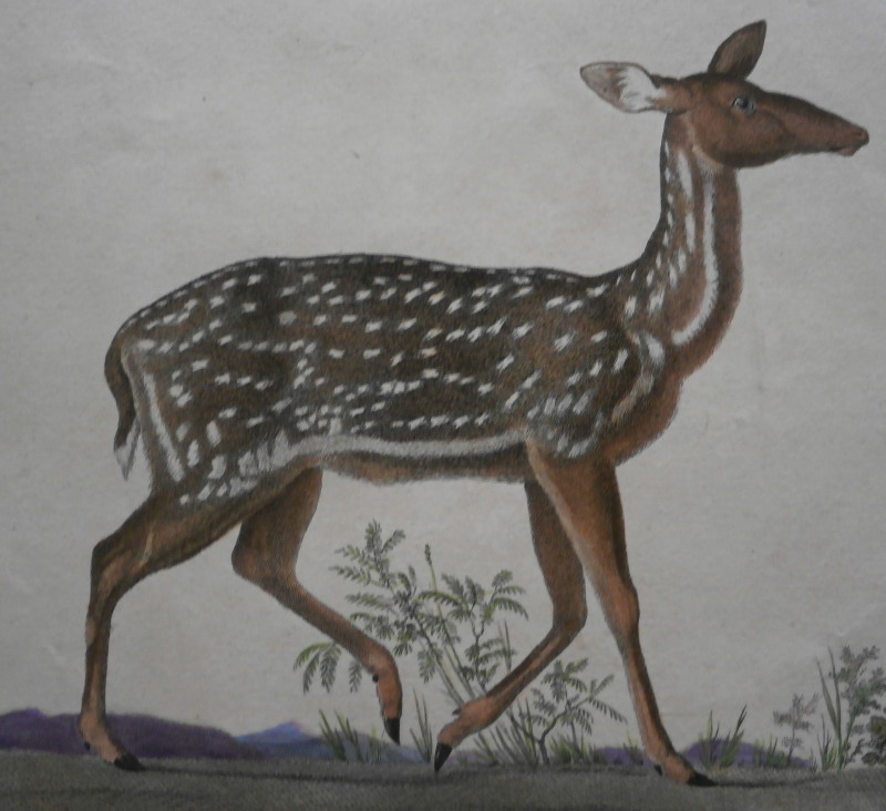 This is a great color printed copper engraving on woven paper made in Paris around 1800. A fun plate with superb early color from from Lacépède's " La Menagerie du Museum National d'Histoire Naturelle " an important scholarly work of the time and one of the finest examples of 18th century French natural history illustrations. Can't be a common thing to find these days after over 200 years and it being paper. The piece shows a Cervus Axis which is the Axis Deer a native to India. It is strolling through a nice landscape of rocks and some small flowers and plants that make this a very nice look. The piece is in decent condition and I took lots of pictures since I don't know much about this sort of thing. The edges are rough but once it is framed with a nice mat it will look superb. None of the damage will show then as none enters the part framed by a thin black line. The paper size is about 13 inches wide by 20 inches tall. The plate mark size is 10.625 inches wide by 16.75 inches and the thin black framed area is 9.5 inches wide by 14 inches plus another inch underneath where all the info is written. It has Cervus Axis L'Axis ou la Biche du Gange as well as Huilieme de la Grandeur under it and the artist infos are Peinte par Marechal, Grave par Miger and something in the center I cannot quite make out see pics. That is all the info I have. Superb and fun piece that needs a good home :) Please email me for more information or other pictures.