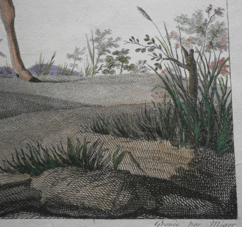 A bit more about the artists and the original work: A professor of zoology at the Museum of Natural History, the French naturalist Bernard-Germain-Étienne Delaville, Comte de Lacépède (1756-1825) was a versatile and precocious scholar who published a number of books on zoology, physics, and music. He was greatly influenced by the pioneering naturalist Georges Louis Marie Leclerc, comte de Buffon, whom he succeeded as Intendant at the Jardin du Roi, which later became the Musée d'Histoire Naturelle in 1793. During his tenure, Lacépède completed a comprehensive study of amphibians and reptiles, Historie Naturelle des Quadrupèdes Ovipares et des Serpens , which was published as a supplement to Buffon's magnum opus on animal classification Histoire Naturelle, Générale et Particulière . In 1800-1, he published the first edition of La Menagerie du Museum National d'Histoire Naturelle , a thorough survey of the various species of quadrupeds, reptiles and amphibians in the impressive collection of the Museum of Natural History. This magnificent work was comprised of descriptive text written by Lacépède and his colleague Georges L. C., Baron Cuvier (1769-1832) as well as a number of finely rendered plates after the most eminent natural history artists of the period, Nicolas Maréchal (1753-1803), Nicolas Huet (1770-1830) and Léon de Wailly (1801-1824). Painted from life on vellum, these beautifully detailed illustrations faithfully captured the appearance of the wondrous animals in the Paris menagerie. A pupil of J. G. Wille and C. N. Cochin, Simon Charles Miger (1736-1820) was a royal academician and a talented engraver, who executed numerous portraits and natural history plates.