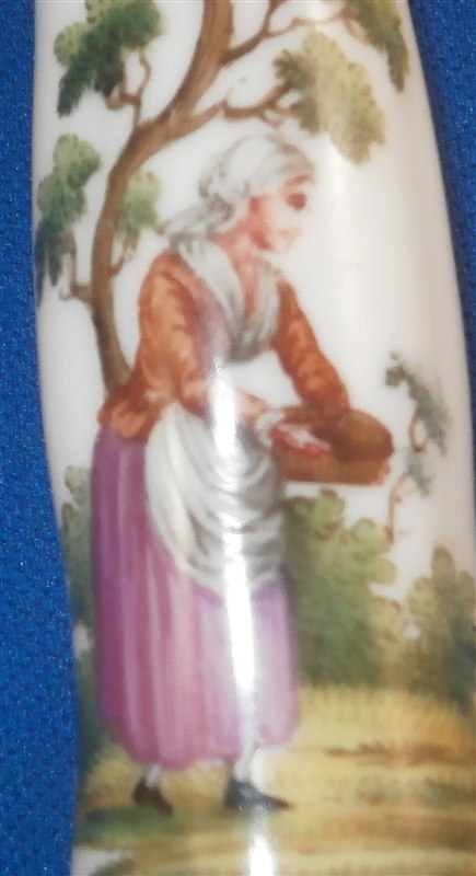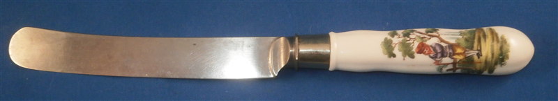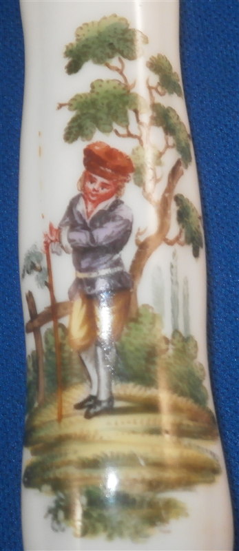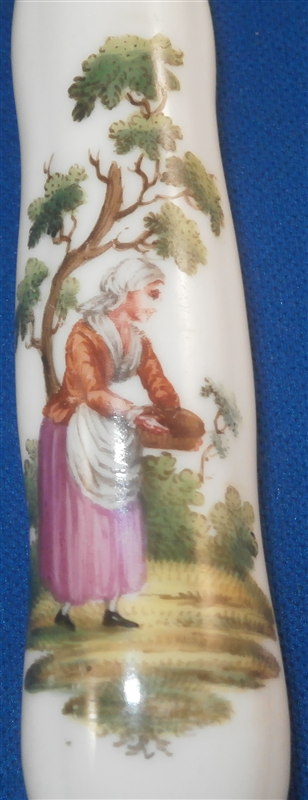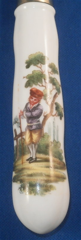 This is a superb knife most likely made in Germany in the late 18th century or early 19th century. I am not sure by whom but it might be from the Thuringia region or Ludwigsburg or possibly Swiss. The knife handle is made of hard paste porcelain and is handpainted with two superb scenes. The porcelain itself has four sections with grooves in between. The quality of the painting is top notch. The metal parts are steel but they are later replacements! The metal does not go all the way through the handle which is a good clue to figure out the maker. The knife is in perfect condition. The piece is unmarked or at least not visibly marked which is always the case. The knife is 8.5 inches long of which the handle is about 3.375 inches. Please email me for more information or other pictures.