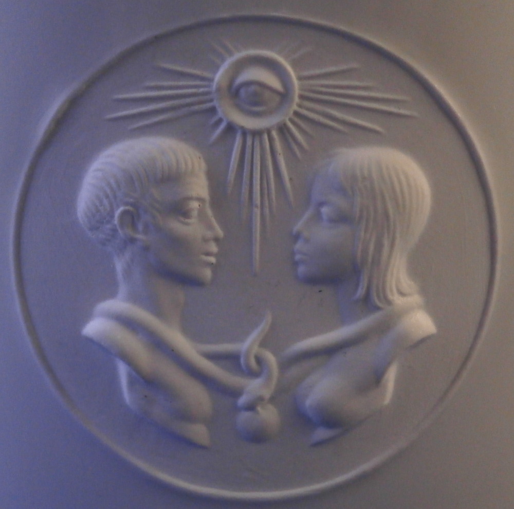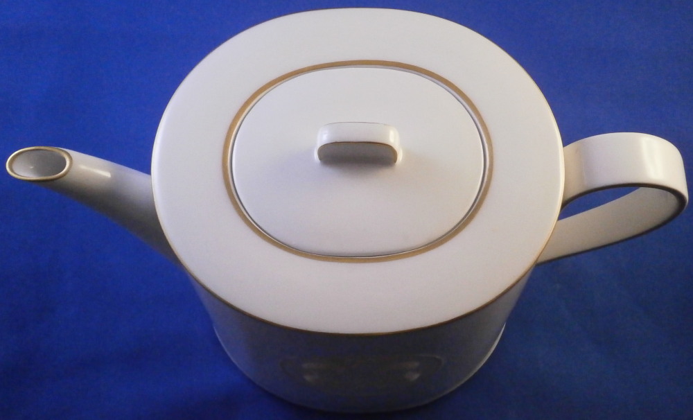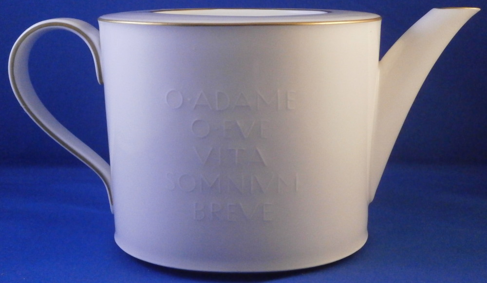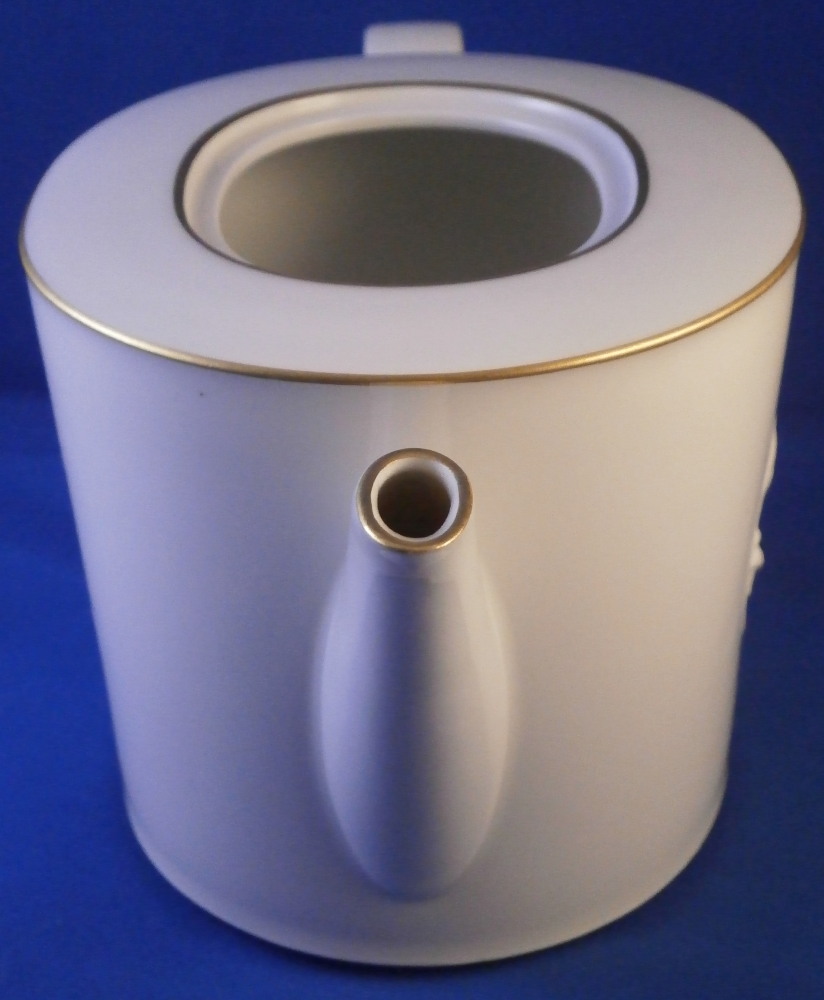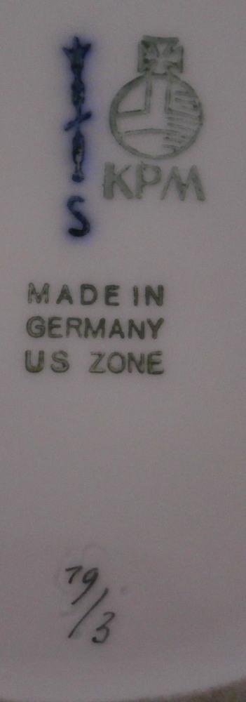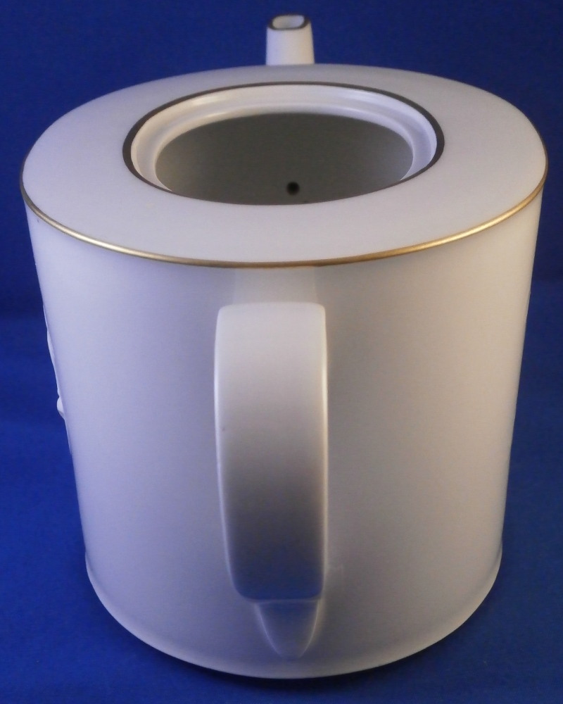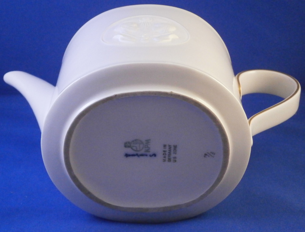 This is a small teapot from the Arkadia series made by KPM in the mid 20th century right after WWII. Meant for a tete a tet type service so it is for two people in terms of size. The pot has the typical shape for the Arkadia series with a flat top with an oval lid and the really nice medallion on the one side with Adam and Eve under a sun with an eye in the center and a snake around their necks with an apple in its mouth. The mdeallion is unglazed porcelain while the rest of the tea pot is glazed. The other side has the saying in relief stating "O ADAME O EVE VITA SOMNIUM BREVE" meaning Adam & Eve Life is bit a short dream. This is the version with the gold trim which I think is much nicer than the plain white one. A really nice looking piece! The pot is in perfect condition with the lid missing its small pin on the underside to hold it in place while pouring. Not the end of the world as one can jsut hold it in place like on so many teapots with ones other hand :) The tea pot is marked underneath with the under glaze blue scepter with the S under it for the Selb location as well as the green orb for the gilding work, the usual other marks from this period as shown and Made in Germany US zone as shown. This was only used for a short time after the war. The pot is 4.5 inches tall, 7.75 inches from handle to spout tip and 4.125 inches in deep. Please email me for more information or other pictures.