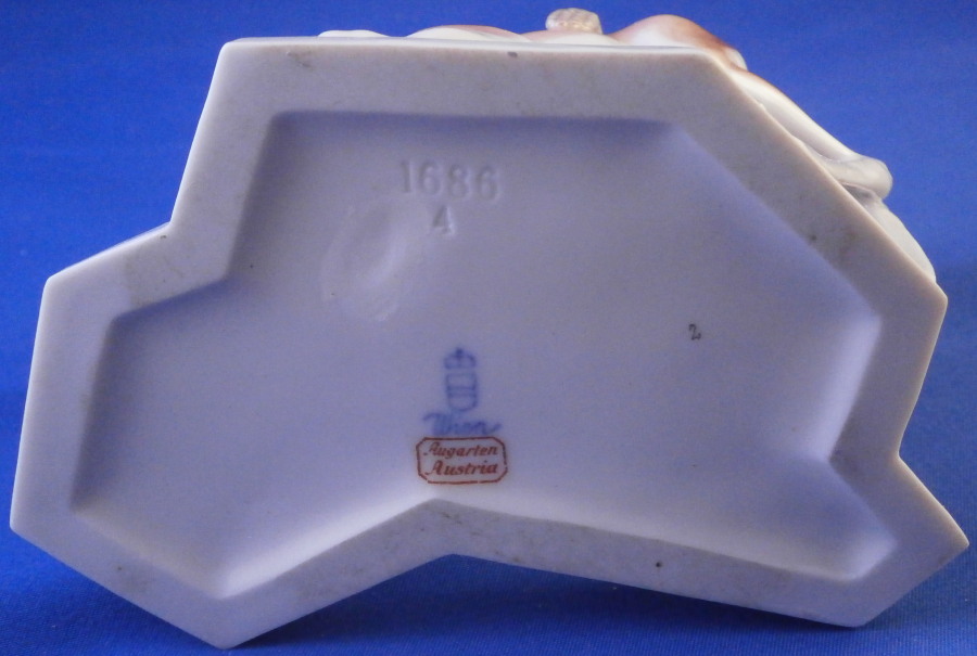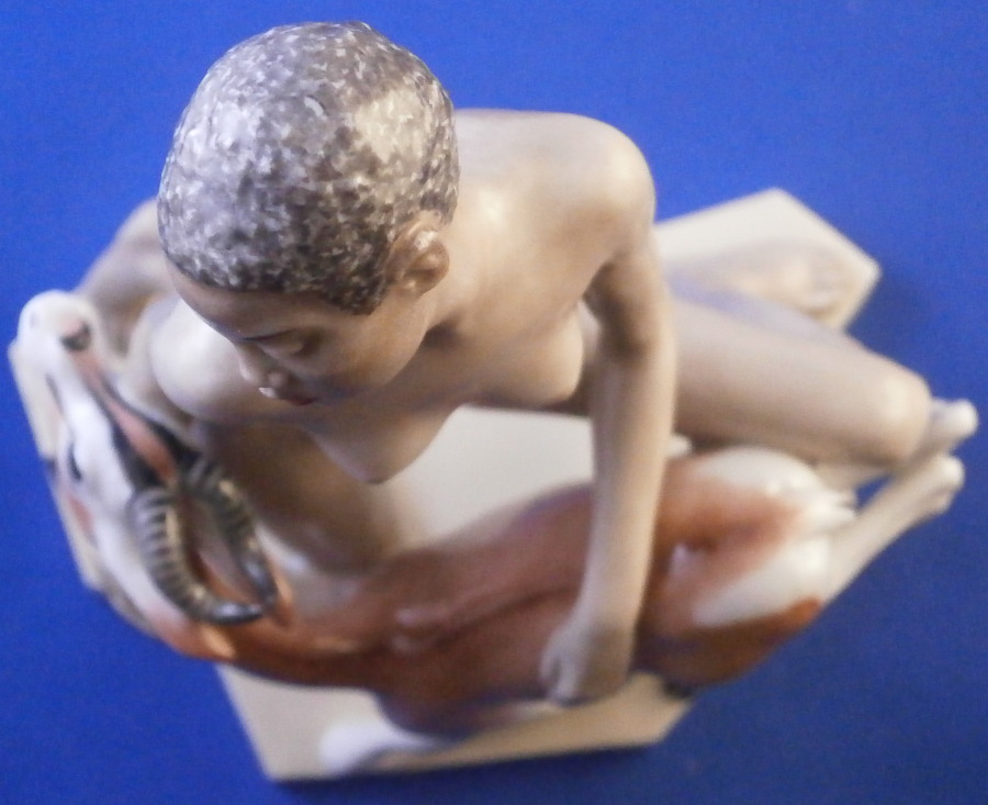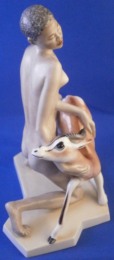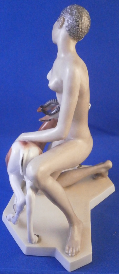 This is a stunning and rare figurine of a nude African lady holding a gazelle which was designed by Robert Ullmann in 1931 and made by Augarten during this period. This has to be one of the greatest figures from this period by any maker! It is a very rare piece especially the painted version. The lady is totally nude and is painted superbly but the gazelle is amazing and perfect for the Art Deco period. The lady is holding / petting the gazelle while kneeling on a nicely shaped base painted in a simple sand color. A superbly modeled and hand painted figure! The figurine is in perfect condition which is another plus :) The piece is 6 inches tall, 4.5 inches wide and 3 inches deep. Marked underneath with the blue shield with the crown on top as well as the word Wien underneath, Augarten Austria in a red rectangle and the impressed number 1686 over 4. Painter's mark 2 in black. The top of the base has the modeler's name impressed as well as the year 1931. It really does not come better than this figure! Please email me for more information or photos.