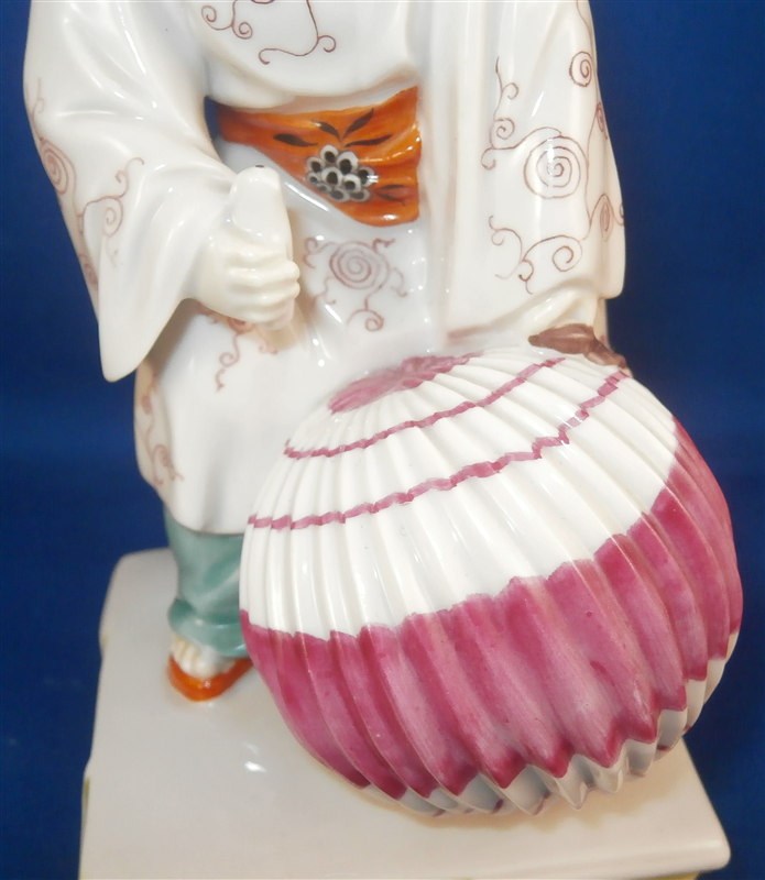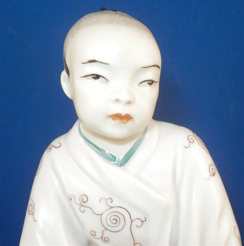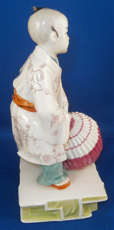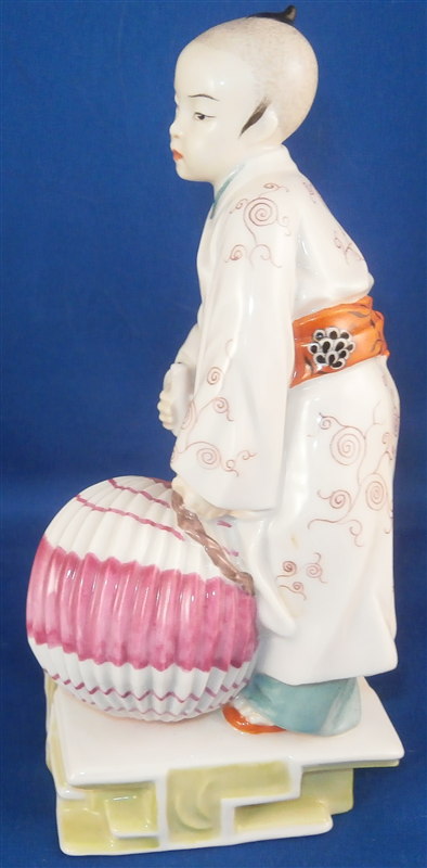 This is a superb figurine which was designed by Mathilde Jaksch and was made by Augarten during the original period in the early 20th century. Hard to find the versions from the original period! It is of an Asian boy with a paper lantern in one hand and a candle in his other hand. The peice is superbly modled and handpainted with lots of detail. The figure is in perfect condition. The piece is 6.125 inches tall, 2.75 inches wide and 2.75 inches deep. Marked underneath with the blue shield with the crown on top as well as the word Wien underneath, the remnants of the Augarten Austria in a red rectangle mark and the impressed number 1691 as well as the painters number 27 in green. Please email me for more information or photos.