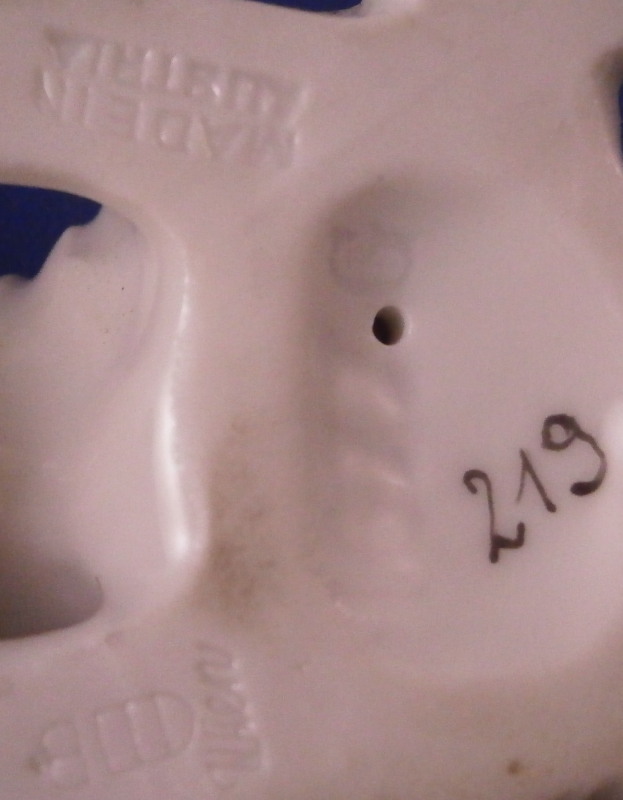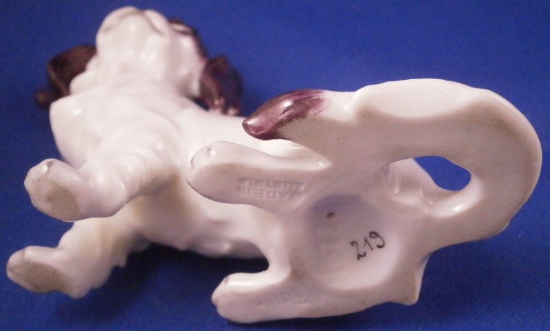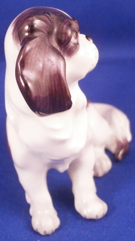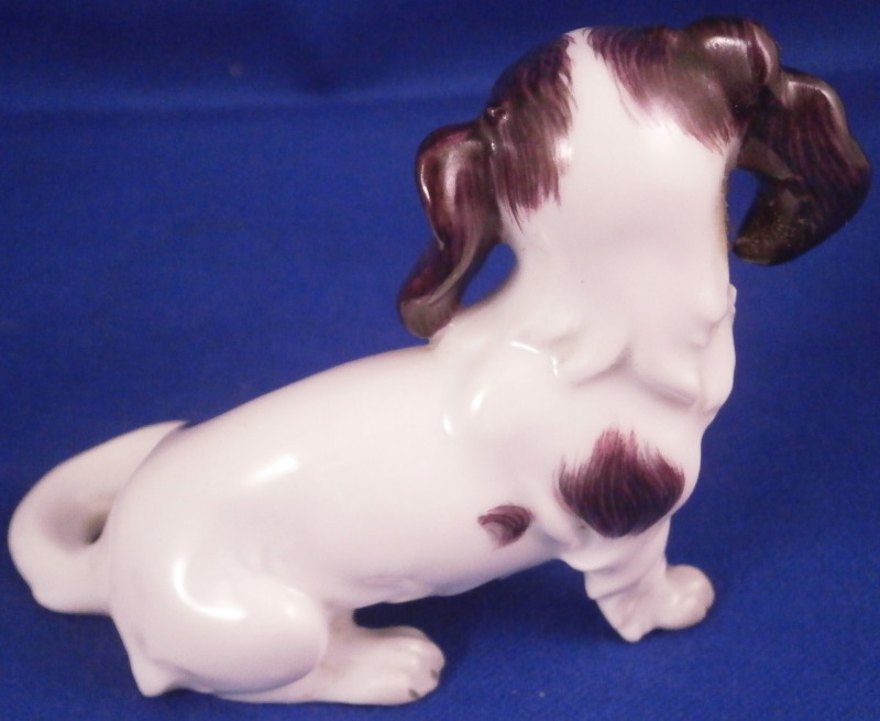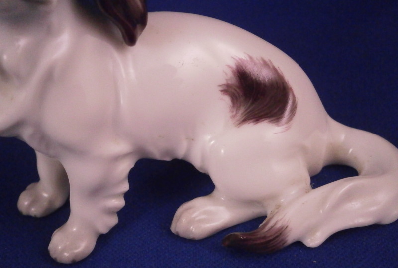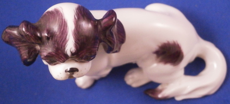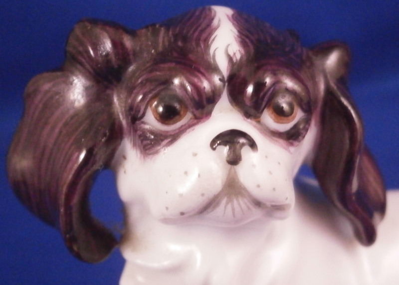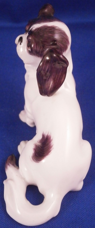 This is a figurine of a Japanese Chin / Some sort of Spaniel like the King Charles Spaniel or Pekinese dog (and yes I suck at my dog breed identification) made by Augarten in the mid 20th century. This is the black version but a brown version also exists of this model. Superbly modeled with lots of detail and hand painted to perfection! The dog is 2.5 inches tall, 3.25 inches long and 1.625 inches deep. The figure is in perfect condition and is marked underneath with the impressed shield with the crown on top as well as the word Wien underneath, a black number 219, impressed numbers 1677 and the letter G and Made in Austria as shown. Please email me for more information or photos.