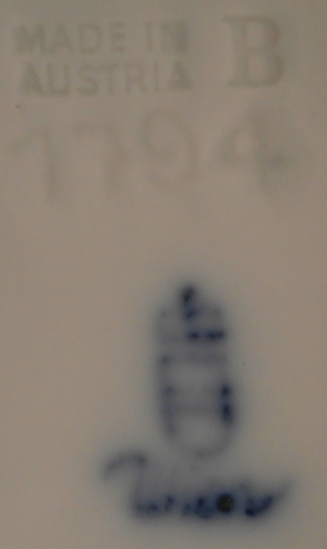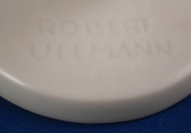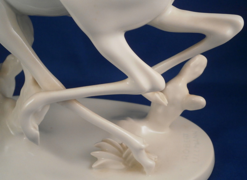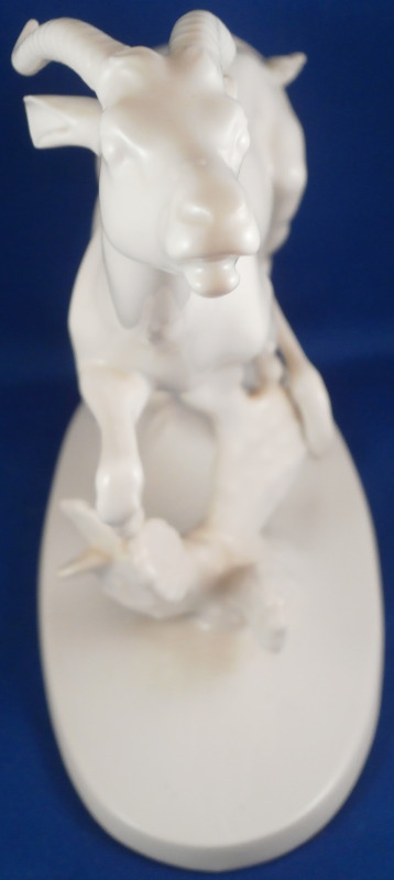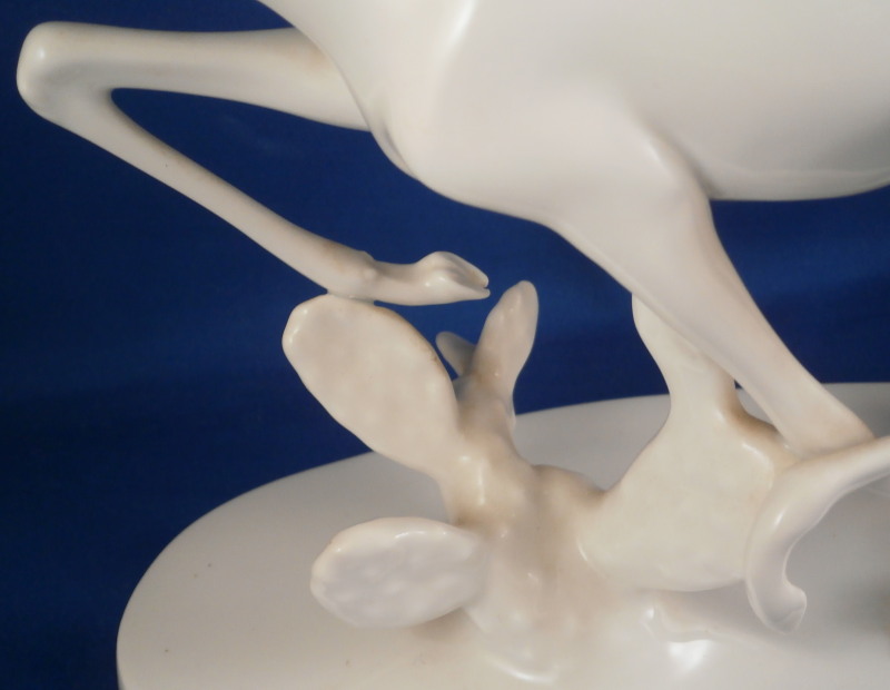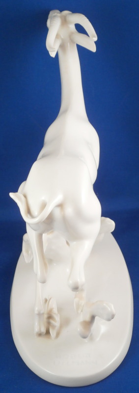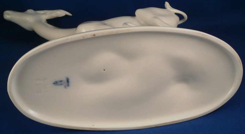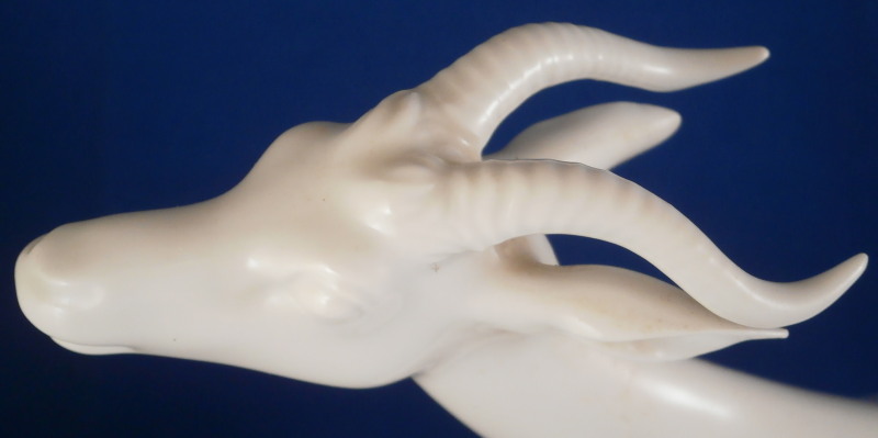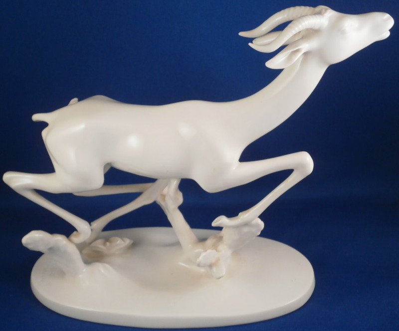 This is a neat blanc de chine figurine of a gazelle made by Augarten in the 20th century. A superbly modeled piece (am amazed those thing legs held up during the firing process) of a fleeing gazelle jumping over some cactus plants. Just an amazing piece and it is in perfect condition which is always ncie. The figure is 7.125 inches tall, 3.5 inches wide and 8.25 inches long. So a bit larger than many of their animals. Marked underneath with the blue shield with the crown on top as well as the word Wien underneath, impressed letter B, impressed number 1794, as well as Made in Austria impressed into the base. The back top of the base has the name Robert Ullmann impressed into it. He designed the piece. Please email me for more information or photos.