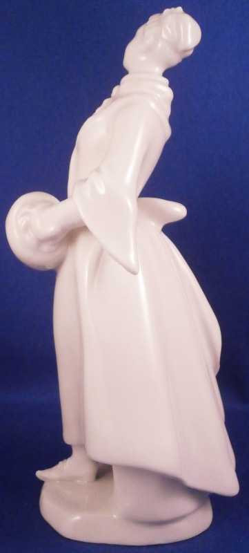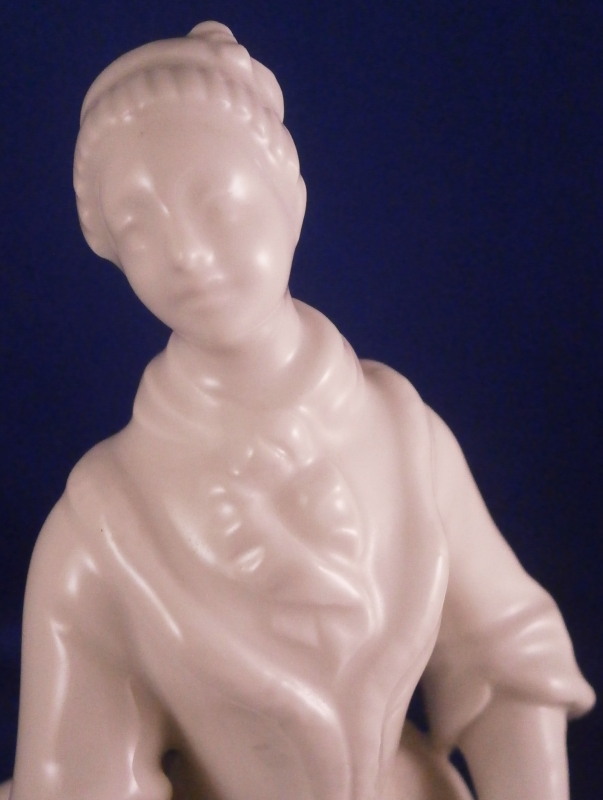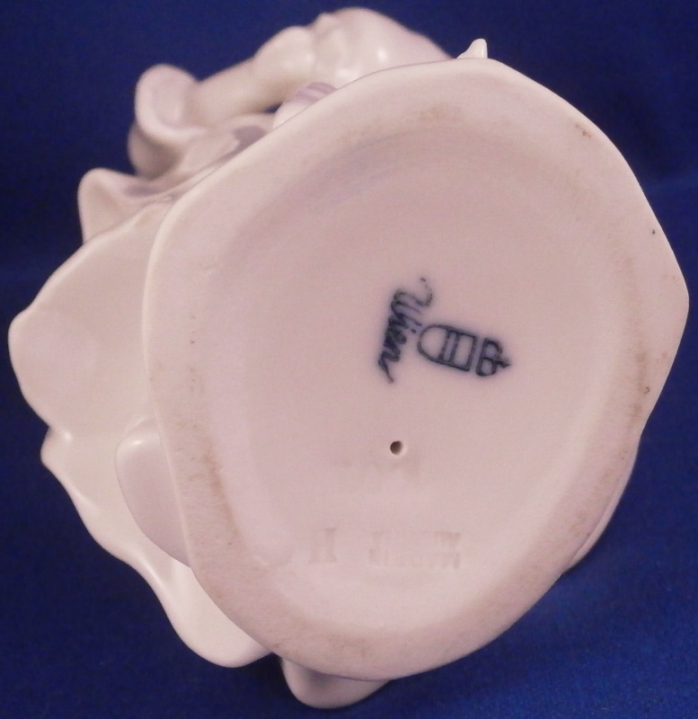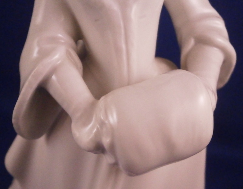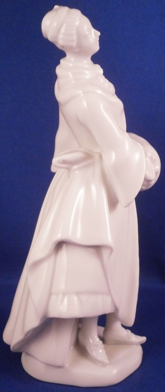 This is a nice figurine of a female ice skater made by Augarten in the 20th century. It is nicely modeled with the lady wearing a long coat over a dress with a scarf around her neck and a hat on her head. Her hands are in a muff in front of her and she has old shoe style skates on her feet and a smooth base to simulate the ice. A nicely modeled figure left in the white to show off all that detail without covering it up with paint. A superb model especially in perfect condition which is the case here. The figurine is 6.25 inches tall, 2.75 inches wide and 2.75 inches deep. Marked underneath with the blue shield with the crown on top as well as the word Wien underneath, impressed Made in Austria and the letter H and the model number 1002 I believe though it is hard to read. Not an easy model to find at all. Please email me for more information or photos.