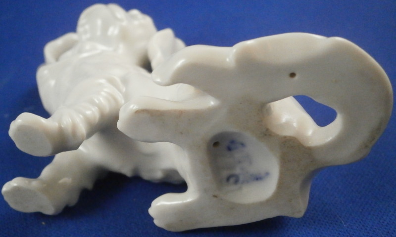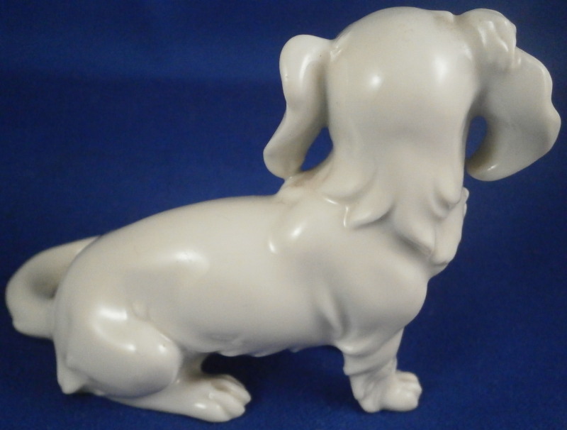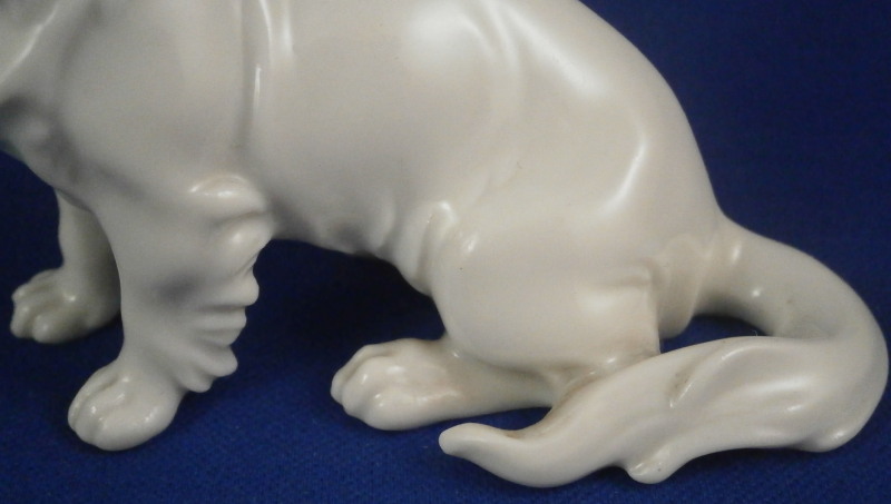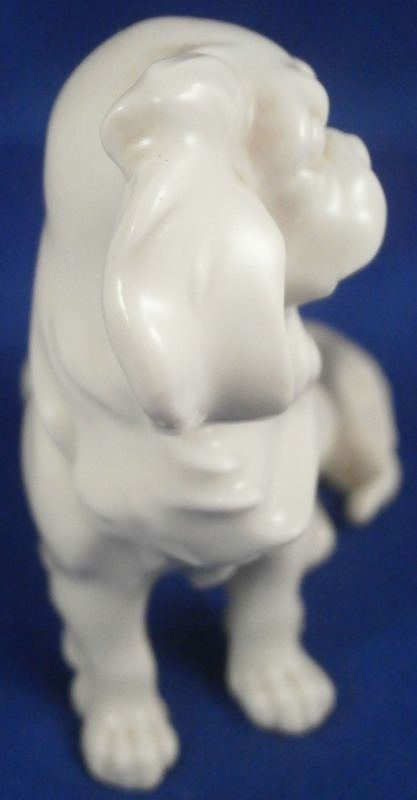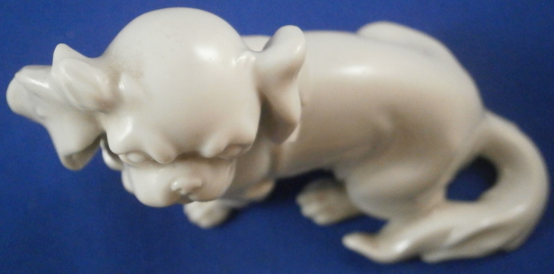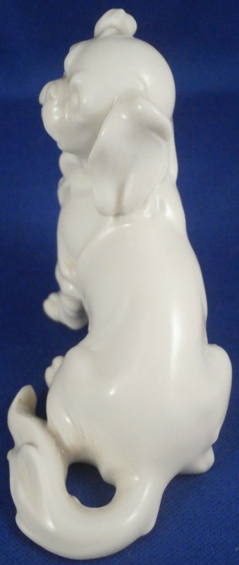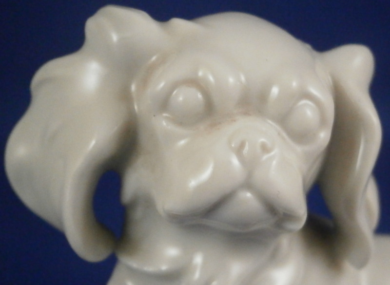 This is a figurine of a Japanese Chin or some sort of Spaniel or Pekinese dog (and yes I suck at my dog breed identification) made by Augarten in the mid 20th century. This is the blanc de chine version left in the white to show off all the nice modeling details. The dog is 2.5 inches tall, 3.25 inches long and 1.625 inches deep. The figure is in perfect condition and is marked underneath with the blue shield with the crown on top as well as the word Wien underneath and the impressed model number 1677. Please email me for more information or photos.