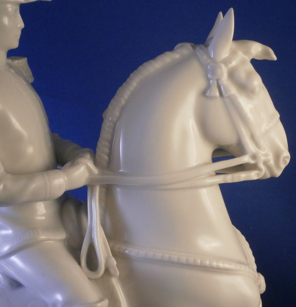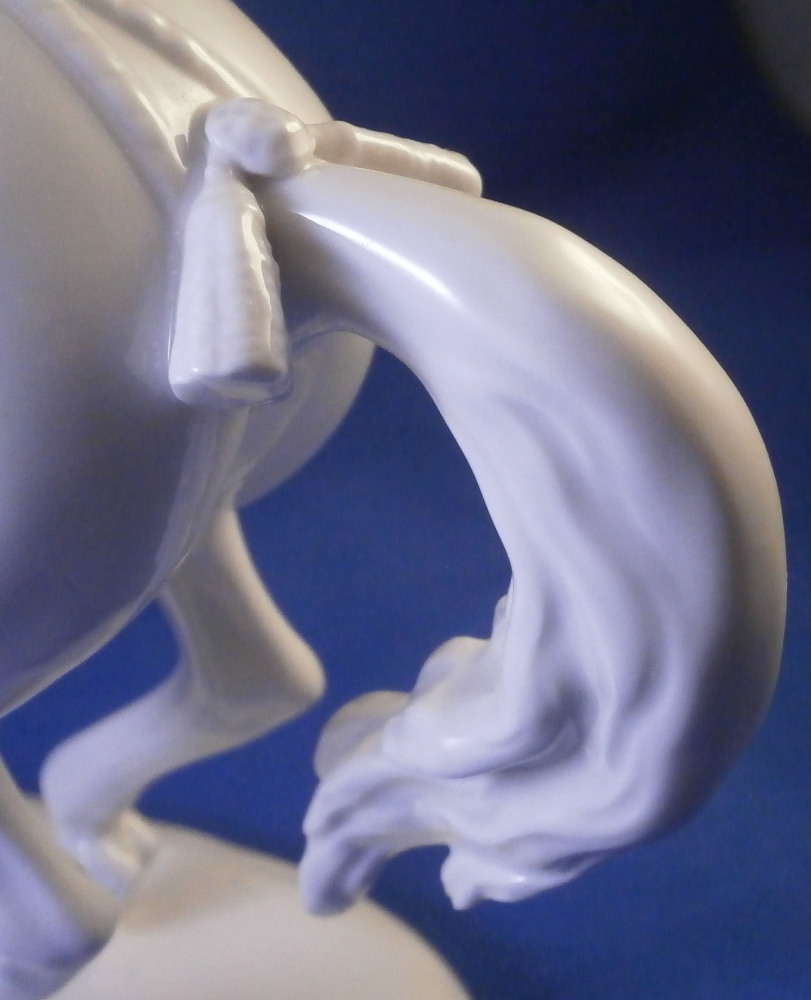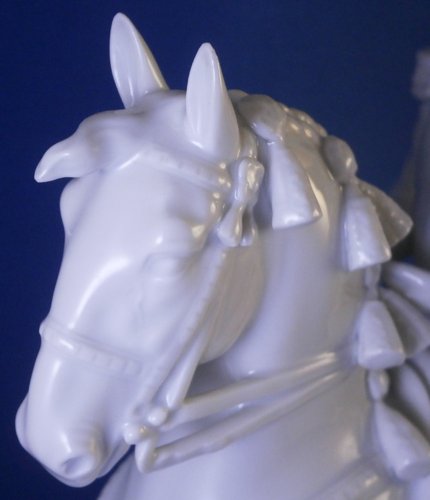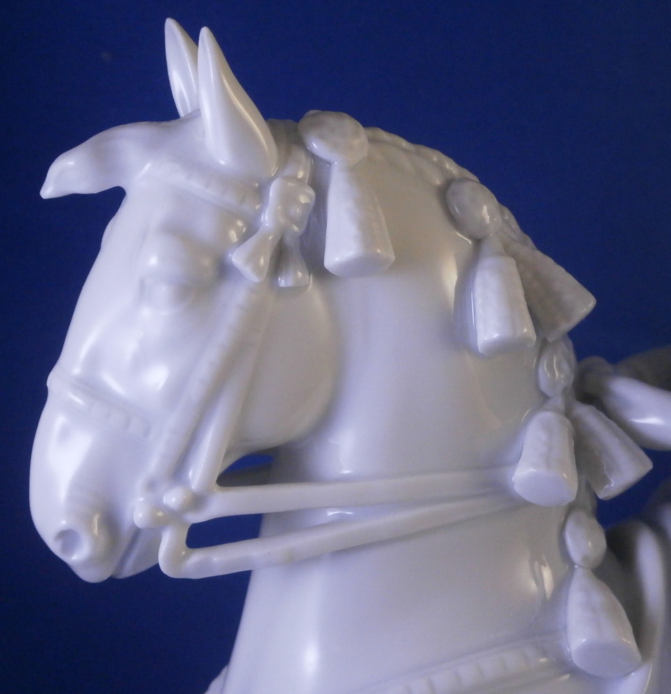 This is a figurine made by Augarten in the 20th century. The white version of the more common painted examples. The figure is from the series of figures depicting different pieces of the Spanish Riding School in Vienna this one being called Pirouette. Super modeling and left in the white you can see al that amazing detail that the painting usually coverns up like the veins in the skin, etc. Hard to find the white examples in perfect condition as is the case here! The figure is 9.5 inches tall, 3.5 inches wide and about 8.125 inches long. The piece is marked underneath with the blue shield with the crown on top as well as the word Wien underneath, impressed letter H, impressed 1668 and Made in Austria impressed. There is a line cut below the mark so it is a second choice piece though I do not know why. Please email me for more information or photos.