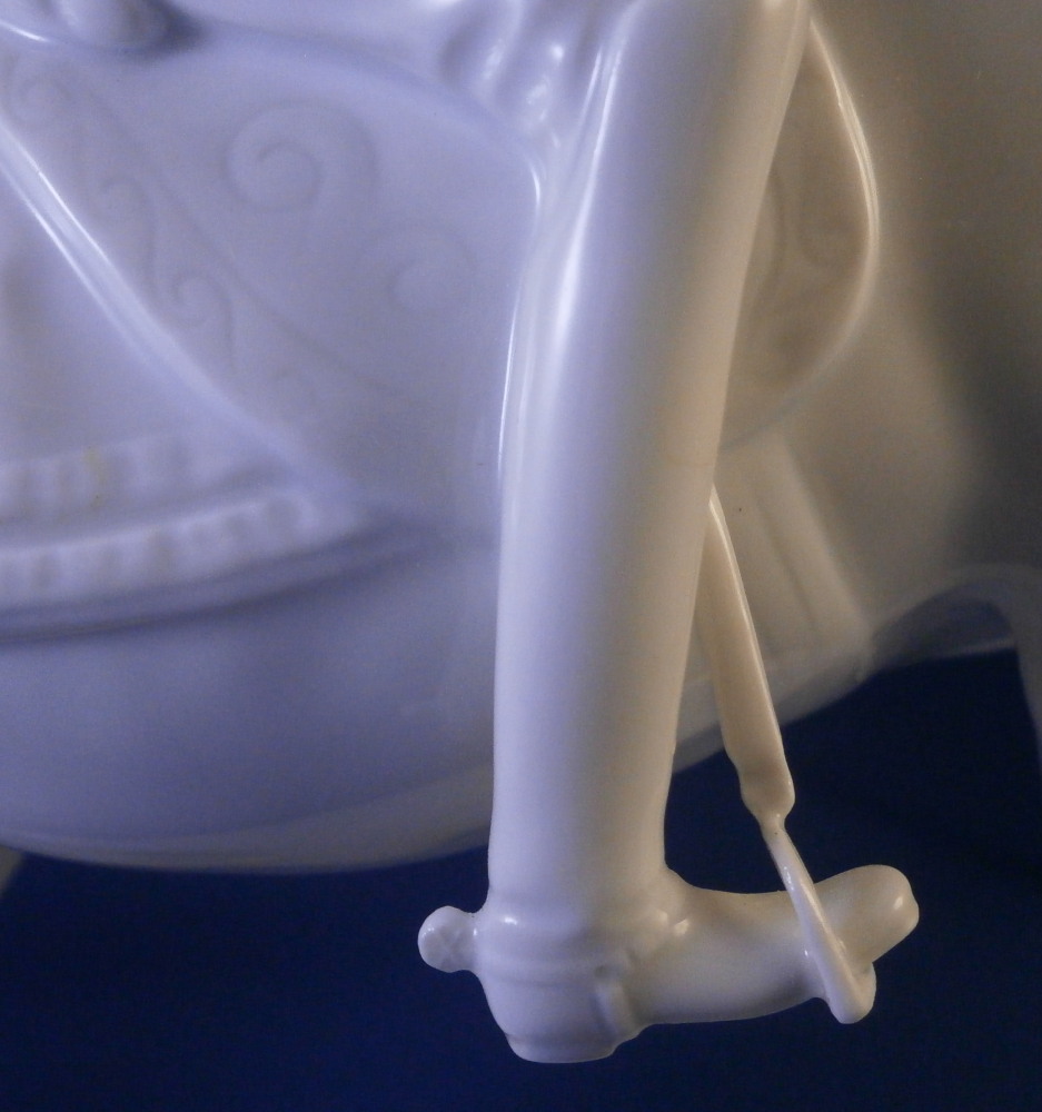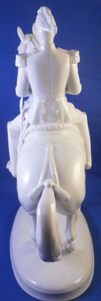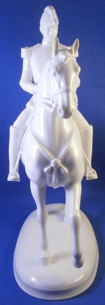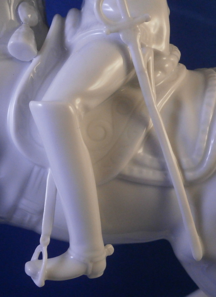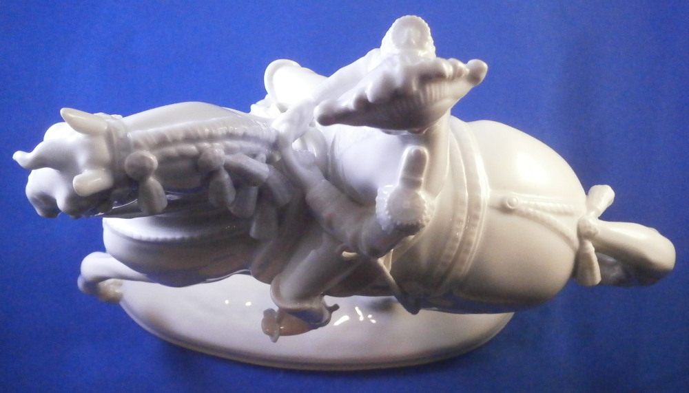This is a figurine made by Augarten in the 20th century. The white version of the more common painted examples. The figure is from the series of figures depicting different pieces of the Spanish Riding School in Vienna this one being called Pirouette. Super modeling and left in the white you can see al that amazing detail that the painting usually coverns up like the veins in the skin, etc. Hard to find the white examples in perfect condition as is the case here! The figure is 9.5 inches tall, 3.5 inches wide and about 8.125 inches long. The piece is marked underneath with the blue shield with the crown on top as well as the word Wien underneath, impressed letter H, impressed 1668 and Made in Austria impressed. There is a line cut below the mark so it is a second choice piece though I do not know why. Please email me for more information or photos.