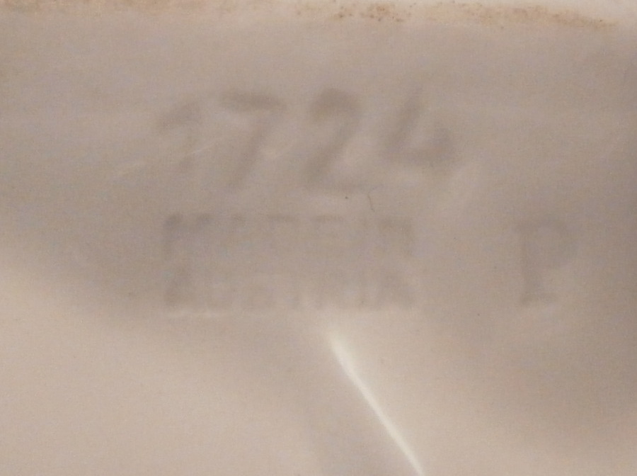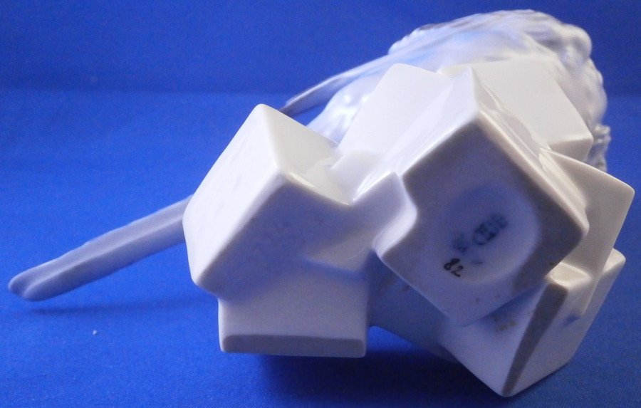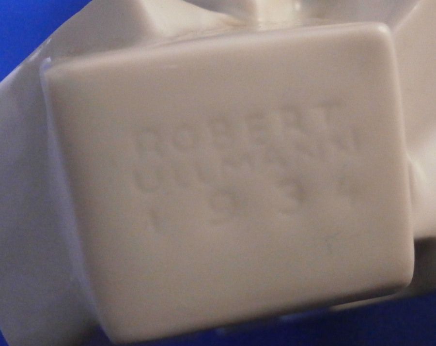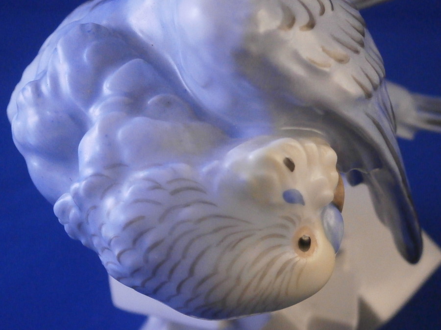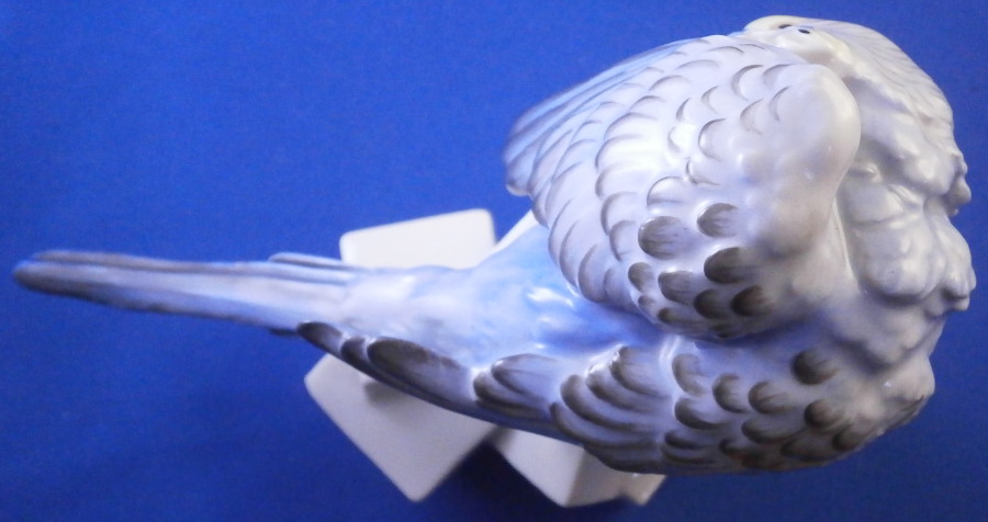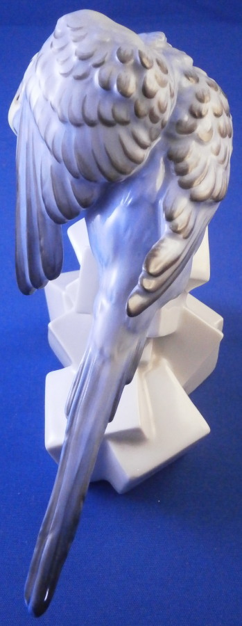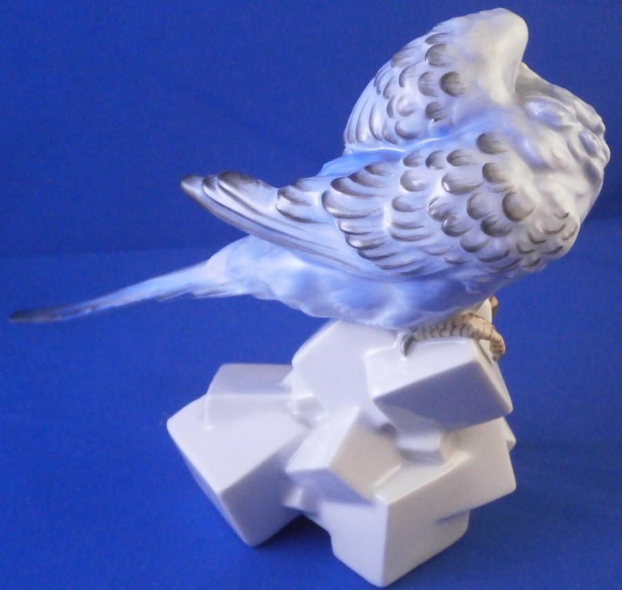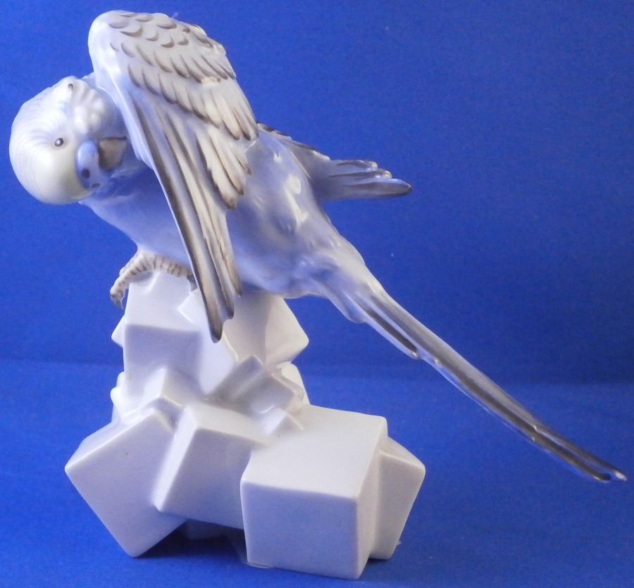 This is a very hard to find figurine of a blue parakeet bird first designed by Robert Ullmann in 1934 and made not much later than that. We had three of these little birds when I was a kid and they were a lot of fun! Quite smart really. The green one used to play Yahtzee with us which was the funniest thing. The figure is superbly modeled in the form of the bird grooming itself while sitting on some cubes - not sure what they are meant to be but they look rather Art Deco. A very realistic piece and quite a typical pose for these birds if you are familiar with them. The figurine is in perfect condition which is amazing given all the fragile parts to this figure , especially the tail. Nicely modeled and hand painted. The piece is 4.75 inches tall, 5.25 inches from head to tail and 2.375 inches deep. The figure is marked underneath with the blue shield with the crown on top as well as the word Wien underneath, a black 82 as the painter's mark as well as the impressed number 1724 and Made in Austria and on the side of the base it has Robert Ullmann 1934 impressed as shown. Please email me for more information or photos.