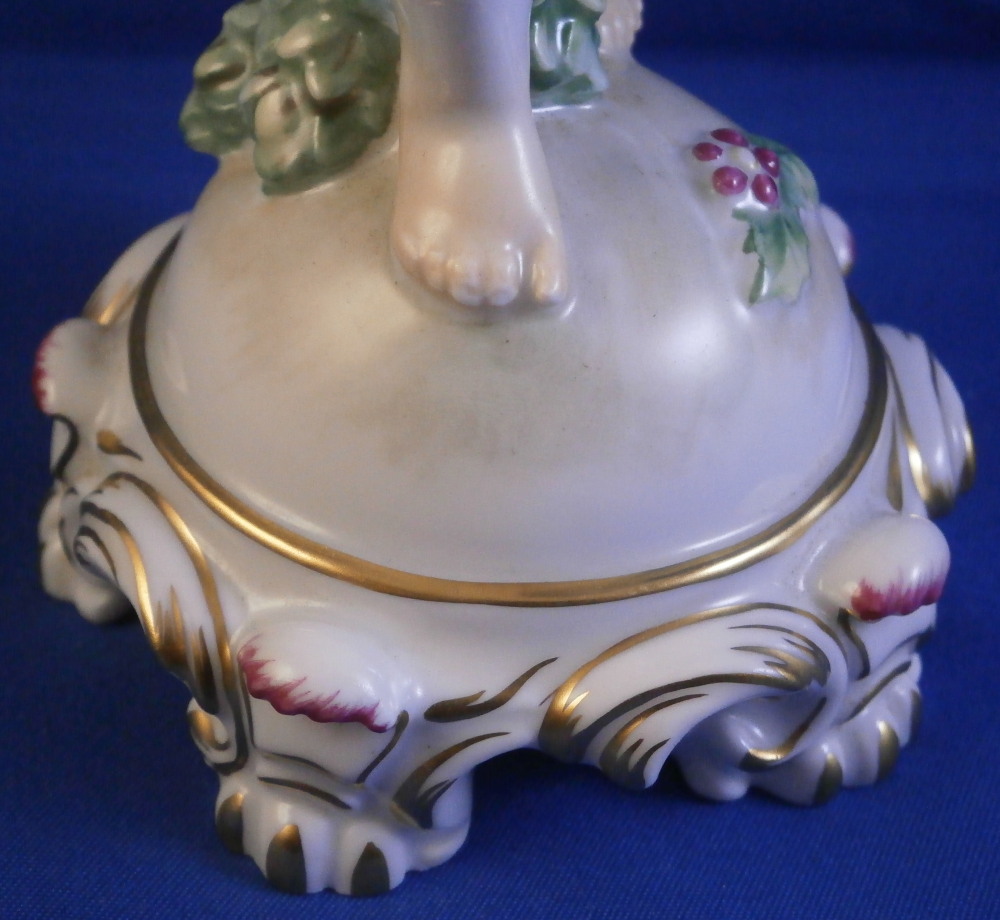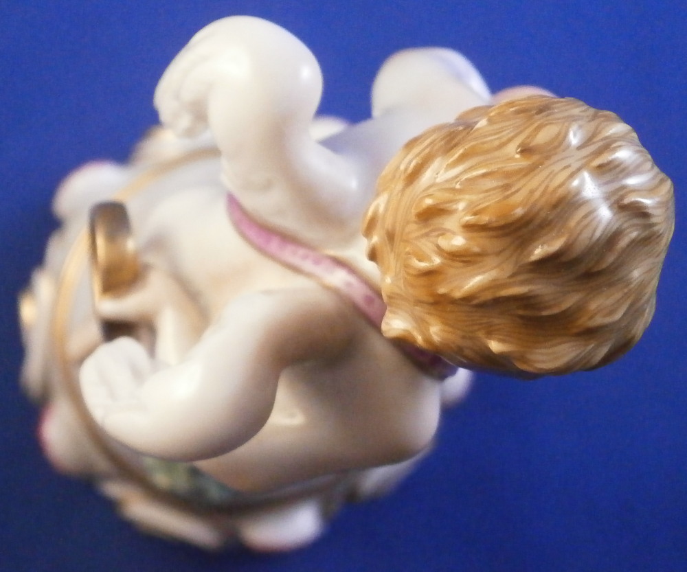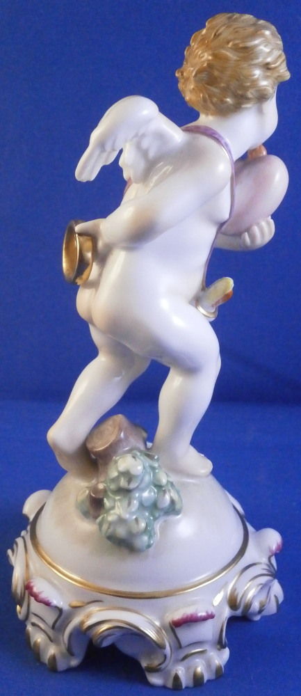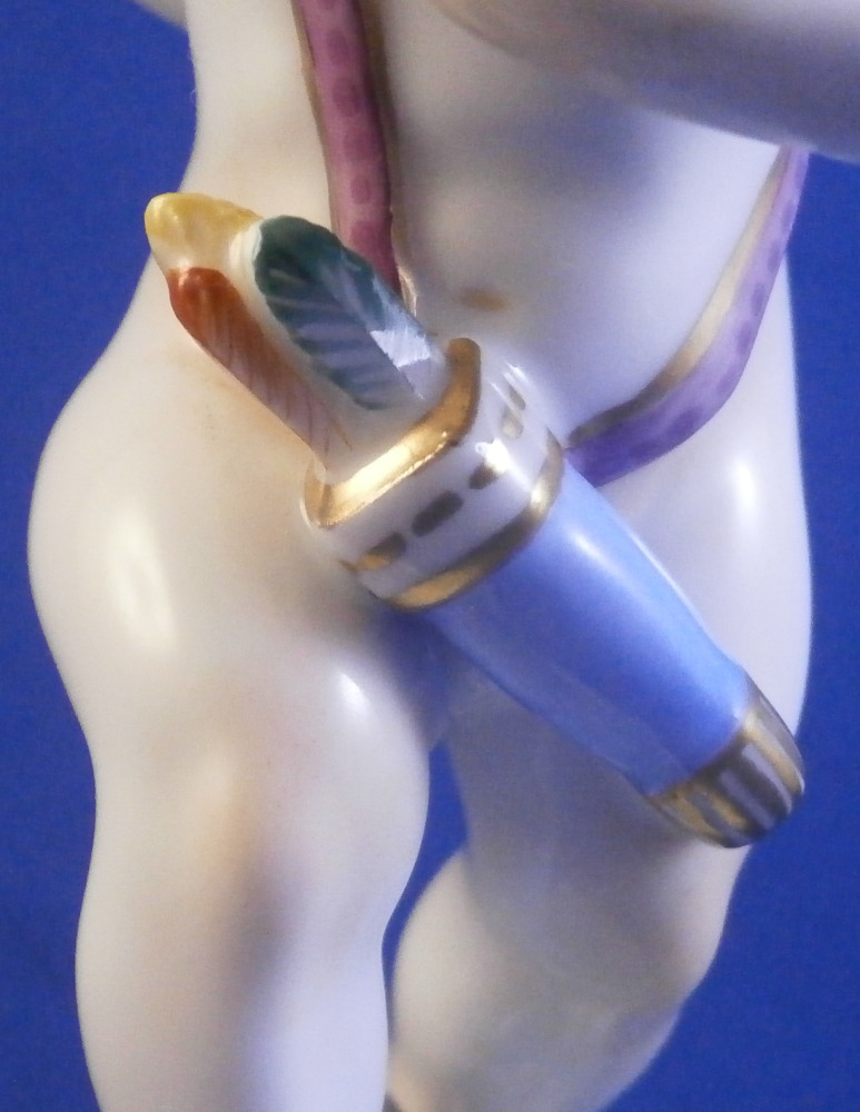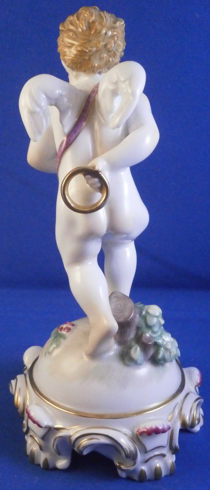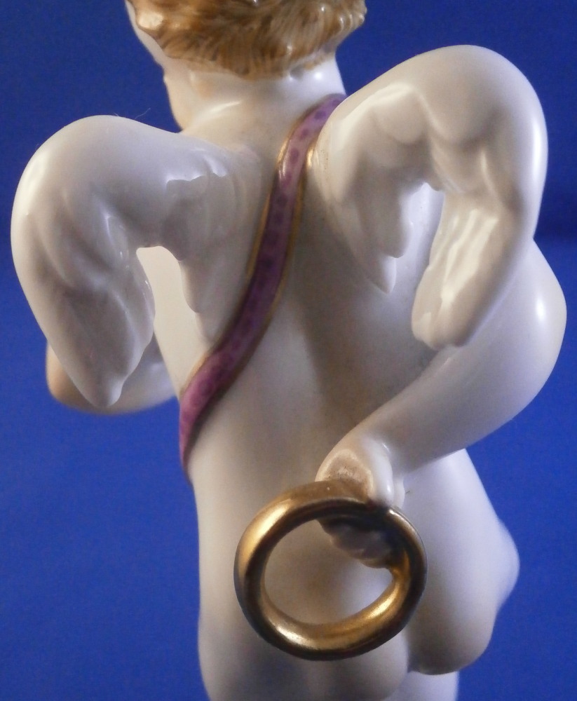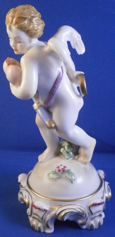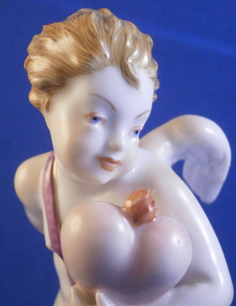 This is a superb figurine of a cupid / cherub / Amor made by Augarten during the the mid 20th century. The figure was designed by Mathilde Szendrö - Jaksch in 1926 and is meant to represent love with the cherub holding a heart in his left hand while holding a ring in his right hand behind his back. This would make a fun way to do your proposal to ask your girlfriend to marry you :) The figurine is superbly modeled with lots of details and hand painted to perfection. The cherub is holding the flaming heart in his left hand and the ring in his right hand behind his back. A quiver of arrows hiding his front mid section. The scroll work around the base has some nice puce and gold highlights and there is a flower and some greenery on the base. The figure is 5.875 inches tall and the base has a diameter of about 2.75 inches. It is in perfect condition. Marked underneath with the blue shield with the crown on top as well as the word Wien underneath, Agarten Wien Austria in red as well as a painter's mark 89 in puce as shown. The model number 1555 is also impressed. Please email me for more information or photos.