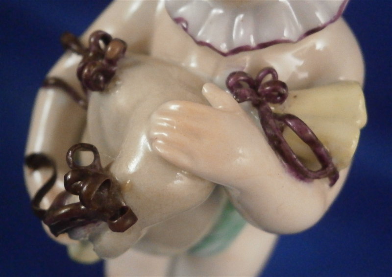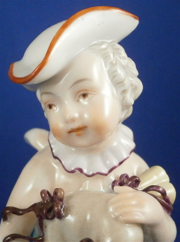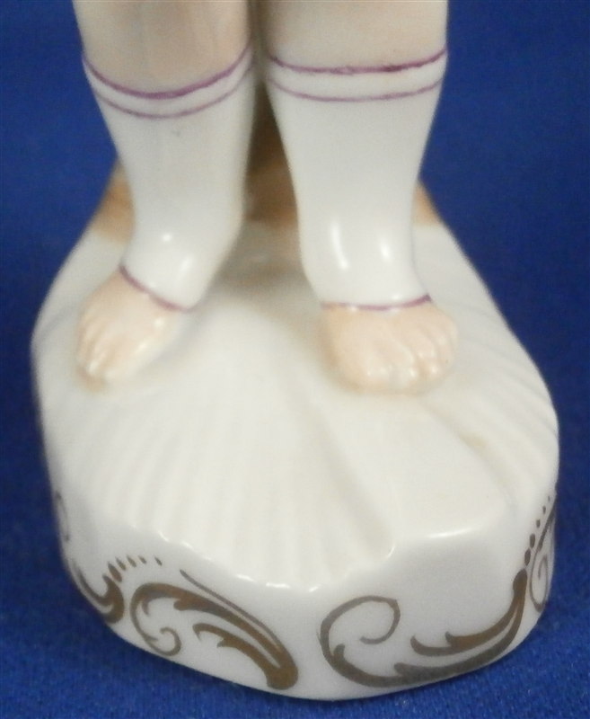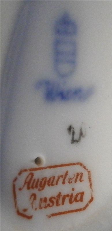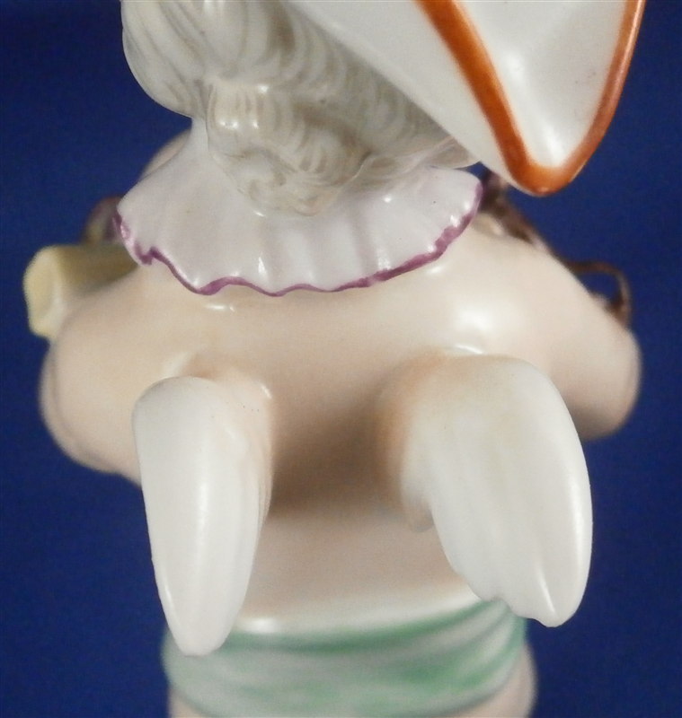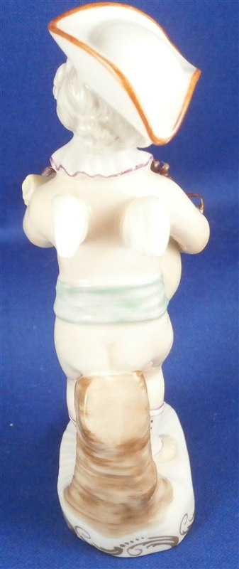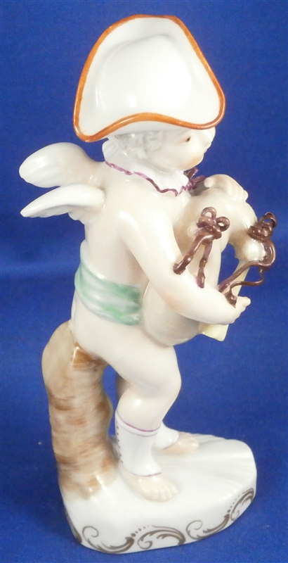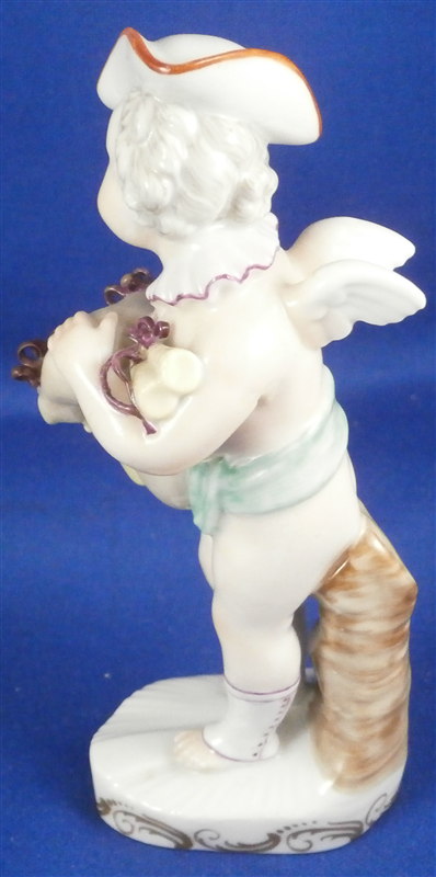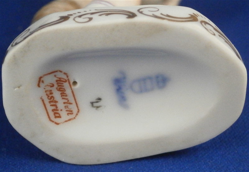 This is a fun figurine of a cherub playing the bagpipes made by Augarten during the original period in the early 20th century. The cherub is mostly nude, has two little wings to the back and is wearing a hat while holding the bagpipes that is adorned with three purple bows. Nice gold trim on the base edge. The figure is in superb condition and is 4.625 inches tall,1.25 inches wide and 1.75 inches deep. Marked underneath with the blue shield with the crown on top as well as the word Wien underneath, Augarten Austria in a red rectangle and the black painter's mark 21 as shown. Please email me for more information or photos.