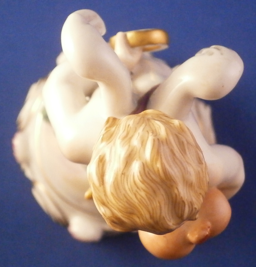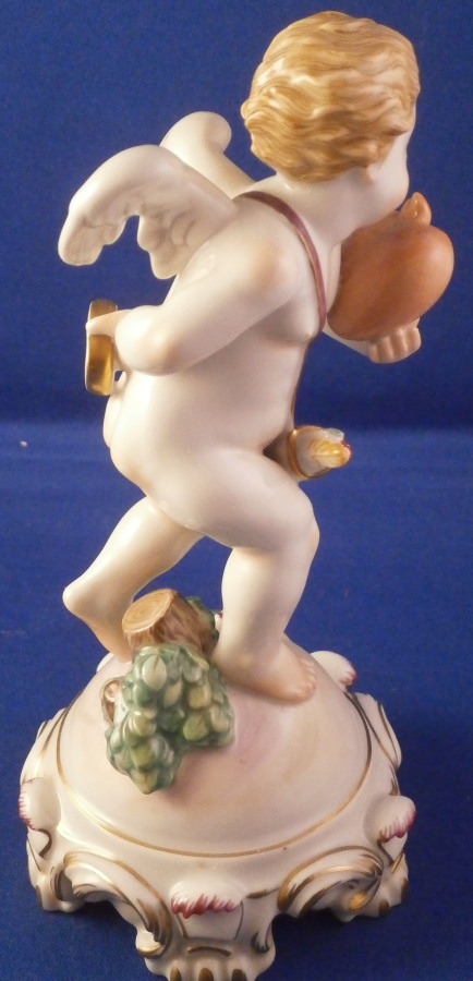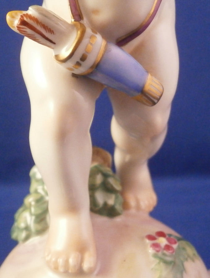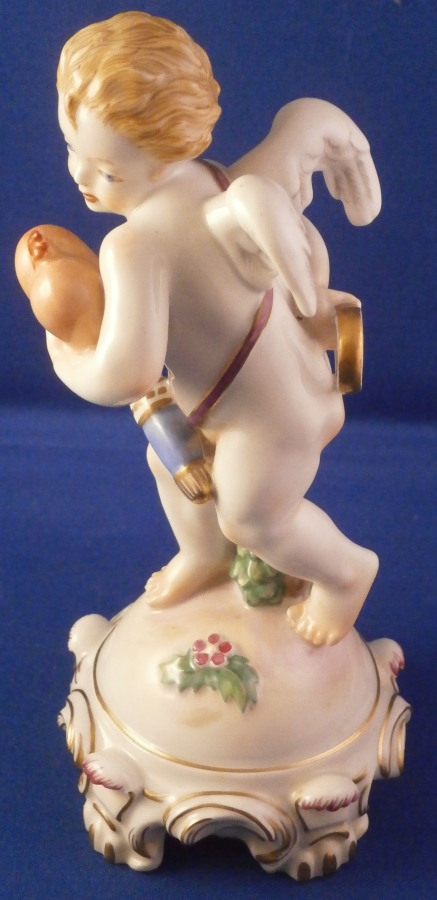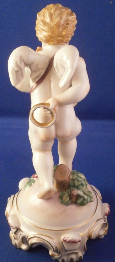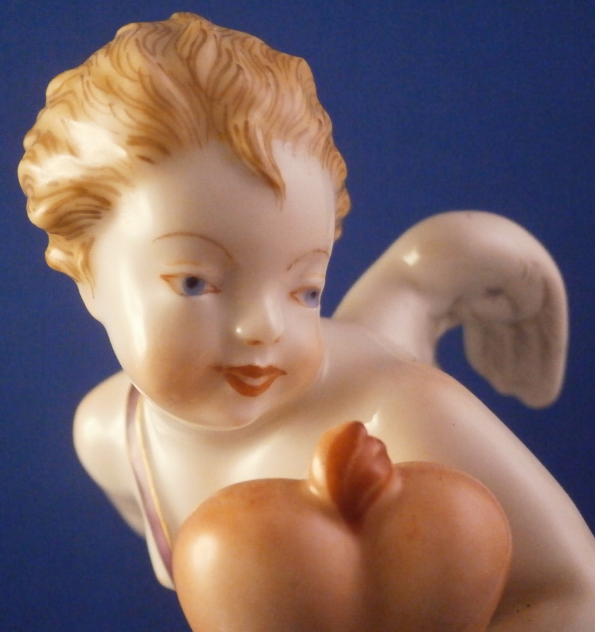 This is a rare original period figurine of a cupid / Amor made by Augarten during the the early 20th century. The figure was designed by Mathilde Szendrö - Jaksch in 1926 and this piece here is from the same period. Cupid is holding a heart in his left hand while holding a ring in his right hand behind his back. This would make a fun way to ask your girlfriend to marry you :) The figurine is superbly modeled with lots of details and hand painted to perfection. The scroll work around the base has some nice gold and puce highlights and his quiver is nicely placed to hide is front. The figure is 6 inches tall and the base has a diameter of about 2.875 inches. It is in perfect condition. Marked underneath with the blue shield with the crown on top as well as the word Wien underneath, Augarten Austria in a red rectangle as well as a painter's mark 27. as shown. The model number 1555 is also impressed. Please email me for more information or photos.