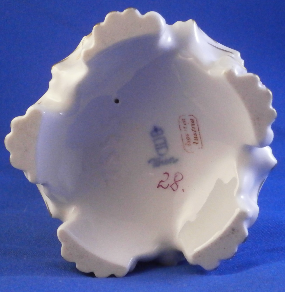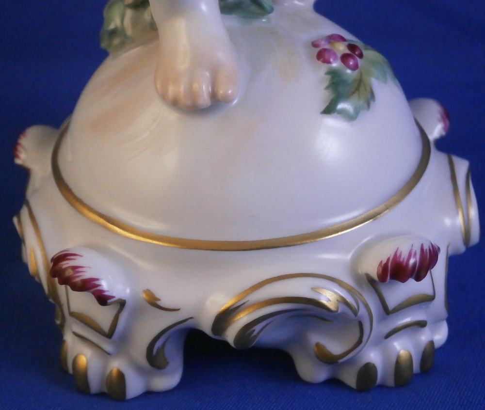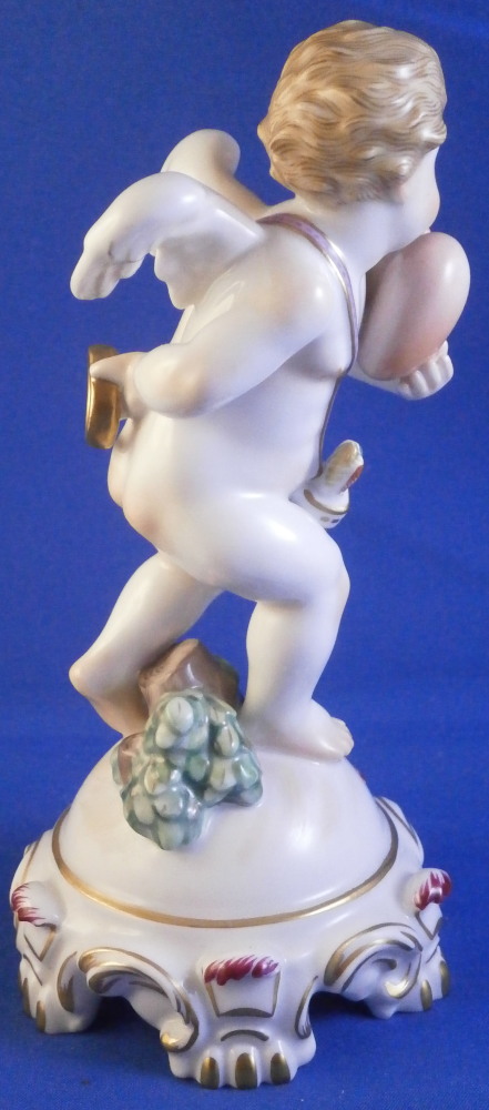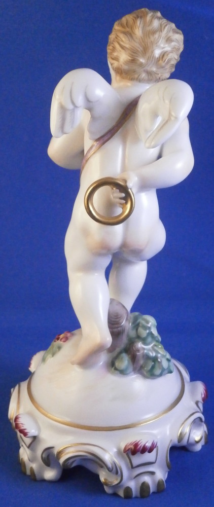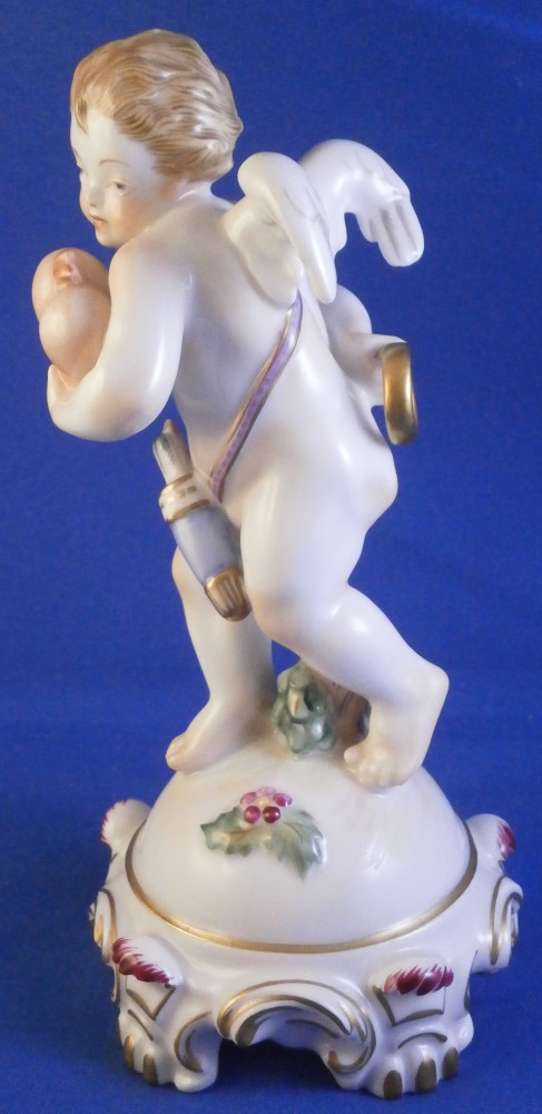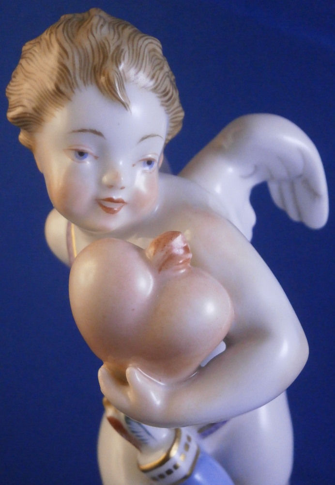 This is a superb figurine of a cupid / cherub / Amor made by Augarten during the the original period of the earlier 20th century. The figure was designed by Mathilde Szendrö - Jaksch in 1926 and is meant to represent love with the cherub holding a heart in his left hand while holding a ring in his right hand behind his back. This would make a fun way to do your proposal to ask your girlfriend to marry you :) The figurine is superbly modeled with lots of details and hand painted to perfection. The cherub is holding the flaming heart in his left hand and the ring in his right hand behind his back. A quiver of arrows hiding his front mid section. The scroll work around the base has some nice puce and gold highlights and there is a flower and some greenery on the base. The figure is 6 inches tall and the base has a diameter of about 2875 inches. It is in perfect condition. Marked underneath with the blue shield with the crown on top as well as the word Wien underneath, Augarten Austria in a red rectangle as well as a painter's mark 28. in puce as shown. The model number 1555 is also impressed. Please email me for more information or photos.