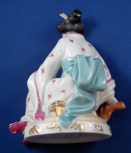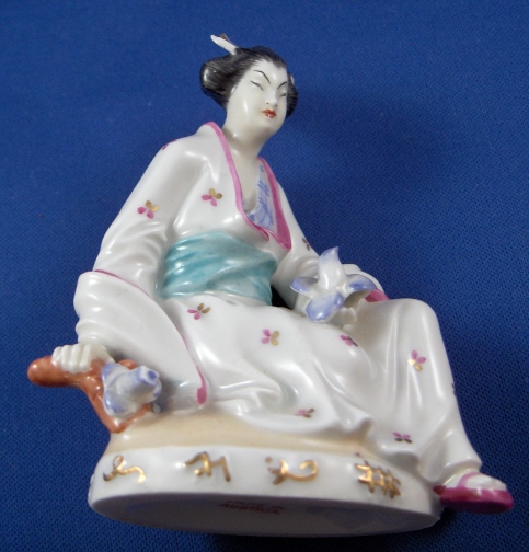 This is a figurine of a Chinese lady in the Art Deco style made by Augarten around 1930. She is 3.5 inches tall, 3 inches wide and 2 inches deep. The geisha is in good condition with the ends of the sticks in her hair being a bit rough but I am unsure if they are chipped or made that way as they are gilded. Also a tiny fleabite underneath one flower. Marked underneath with the blue shield with the crown on top as well as the word Wien underneath, impressed letter O, black number 30, as well as made in Austria in overglaze reddish brown. Please email me for more information or photos.