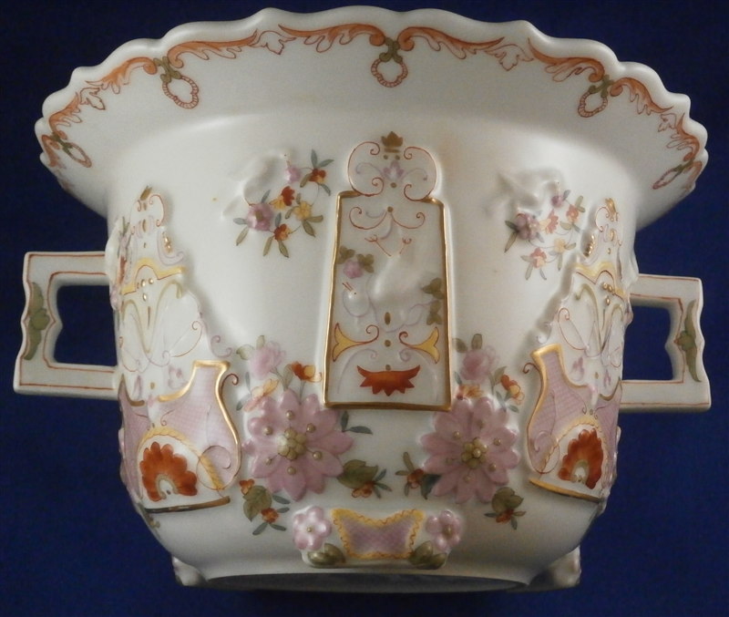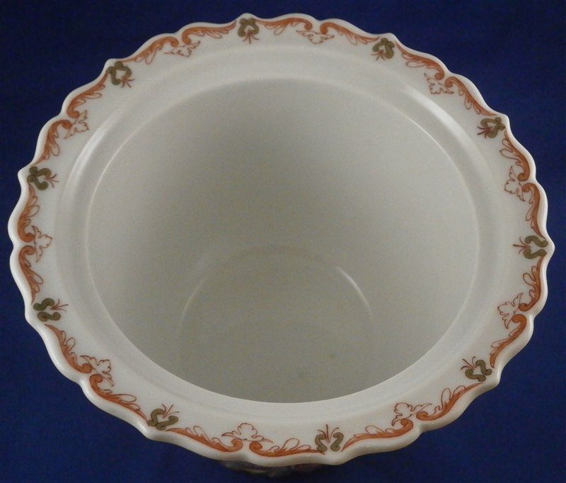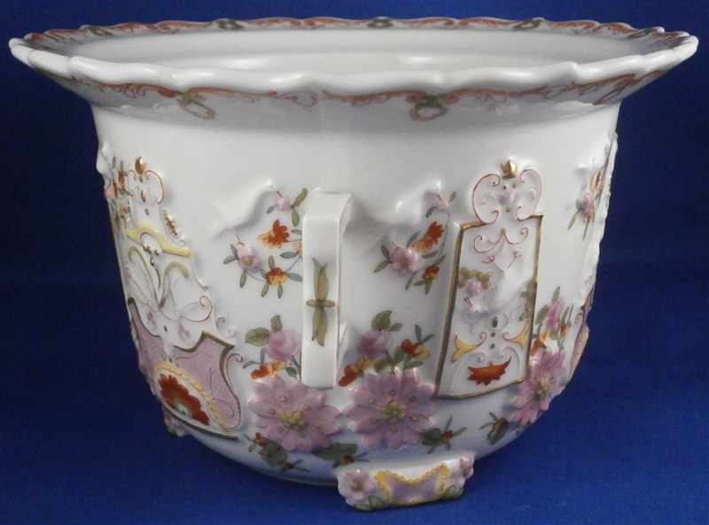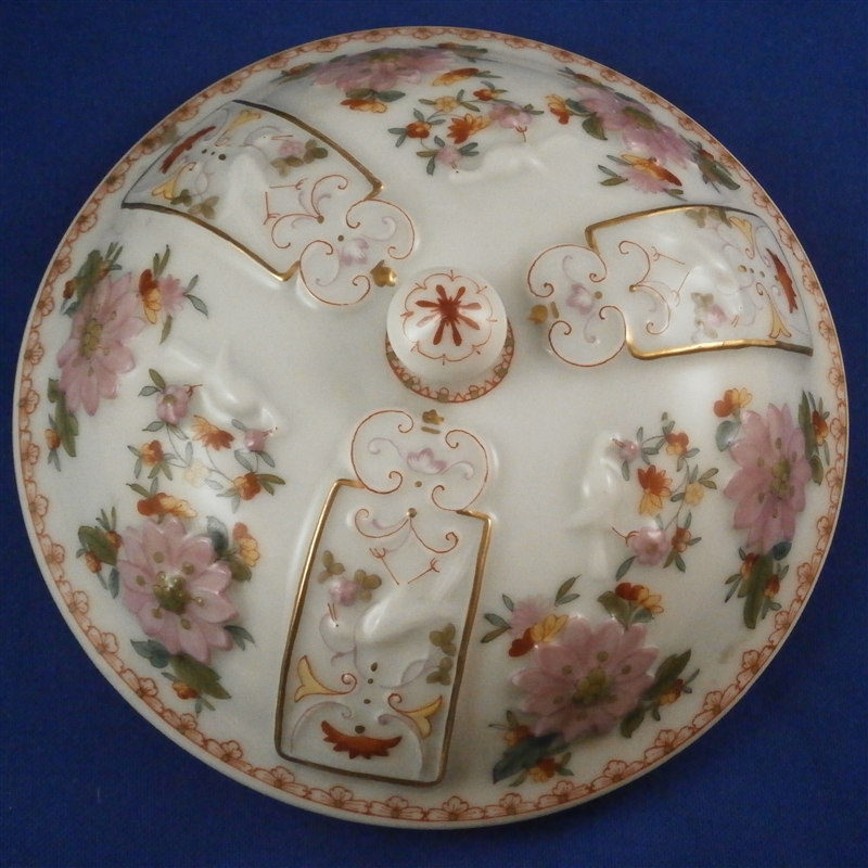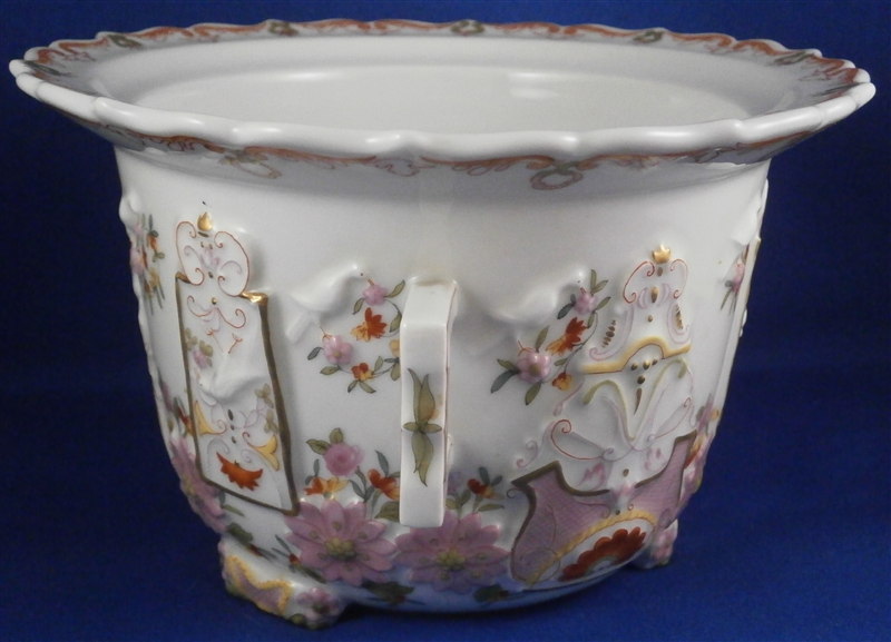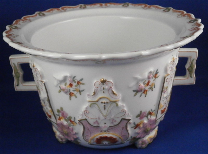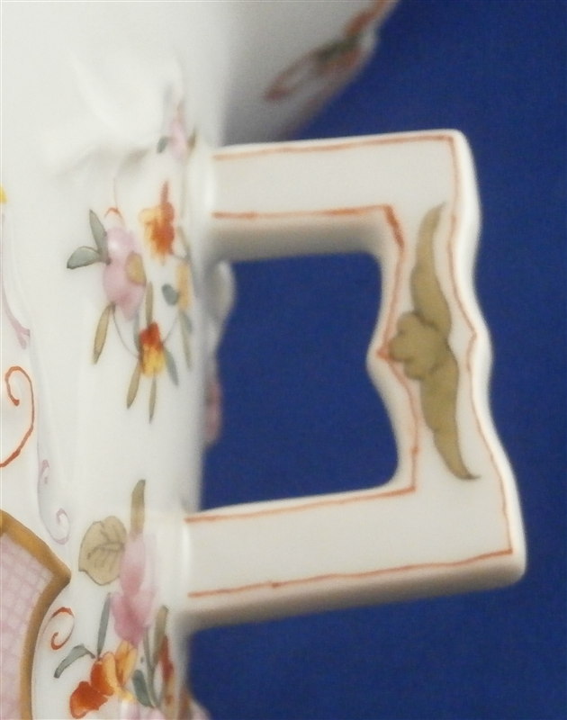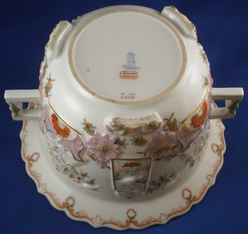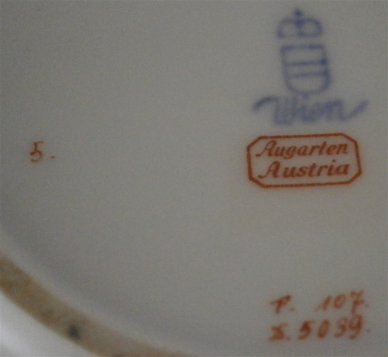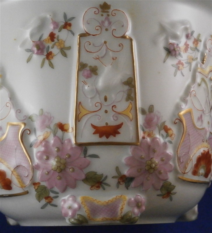 This is a fun lidded dish or box after an 18th century duPaquier Vienna factory original re- made by Augarten during their original period of the early 20th century. A superbly modeled dish with the decoration in relief and then hand painted in polychrome. Limited color palette just like the du Paquier pieces would ahve had. An iron red, pink, green and yellow plus a bit of gilding. I especially like the birds hidden in the flowers :) Not sure what kind of dish it was used as but probably sugar. The piece is 5.5 inches tall and has a diameter of 6.875 inches. It is in perfect condition and marked underneath with the blue shield with the crown on top as well as the word Wien underneath, Augarten Austria in a red rectangle as well as some red numbers as shown. An unusual piece and not something I have come across before. Please email me for more information or photos.