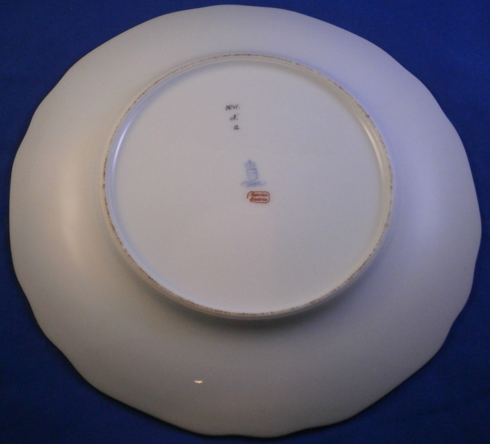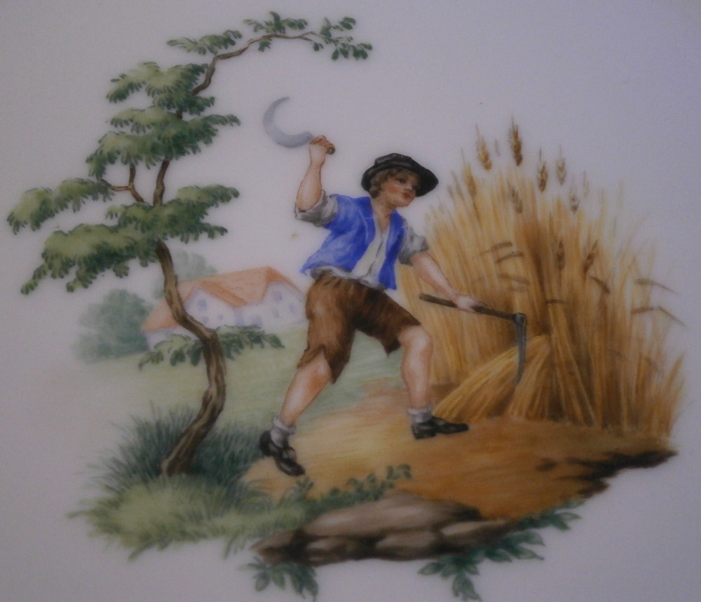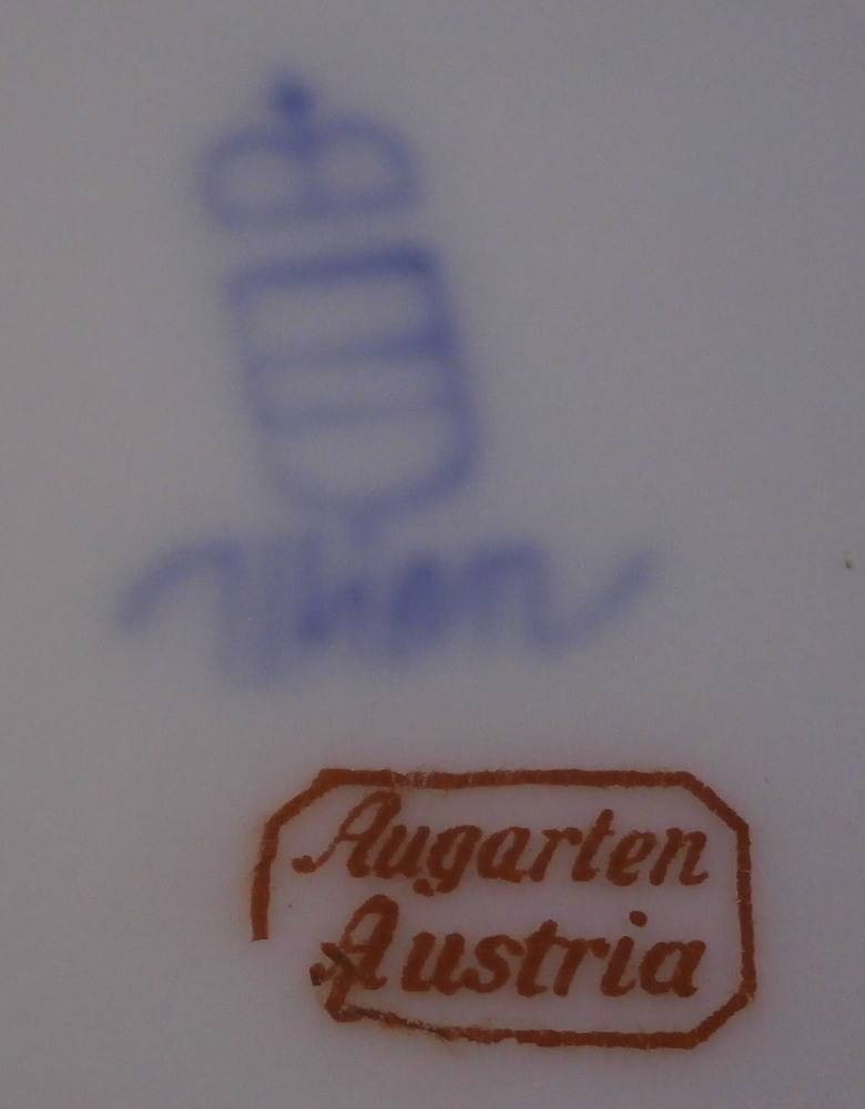 This is a nice scenic plate made by Augarten during the original period in the early 20th century. The center of the plate is hand painted with a superb scene of a farmer harvesting wheat with a tree to the side and a house in the background. Thin gold band around the well edge and a nice typically Vienna gold trim to the rim. The plate is 1.125 inches tall and 9.75 inches in diameter. It is in perfect condition with just the tiniest of use marks. It displays perfectly! The piece is marked underneath with the blue shield with the crown on top as well as the word Wien underneath, some black numbers and letters as well as the red rectangular Augarten Austria mark as shown. A superb piece from their original period that looks great especially with the matching one I also ahve up on the site if anyone is interested in a pair. Please email me for more information or photos.