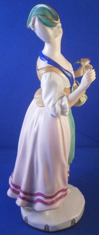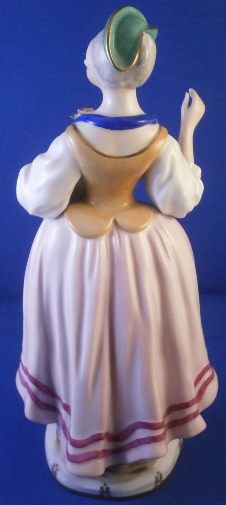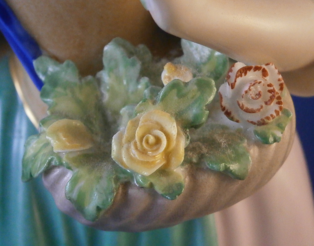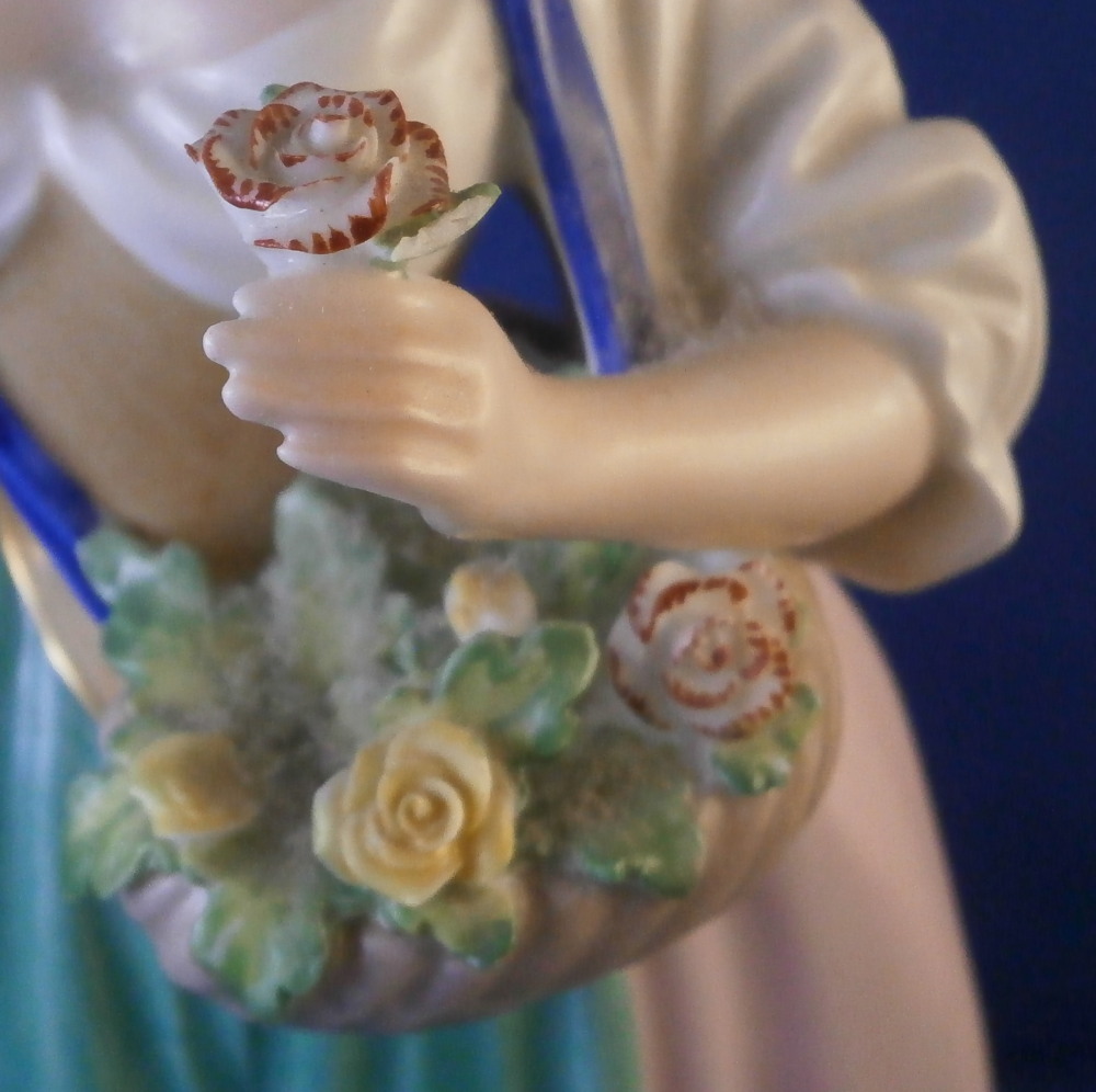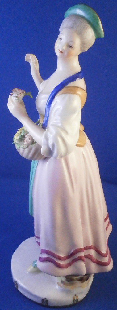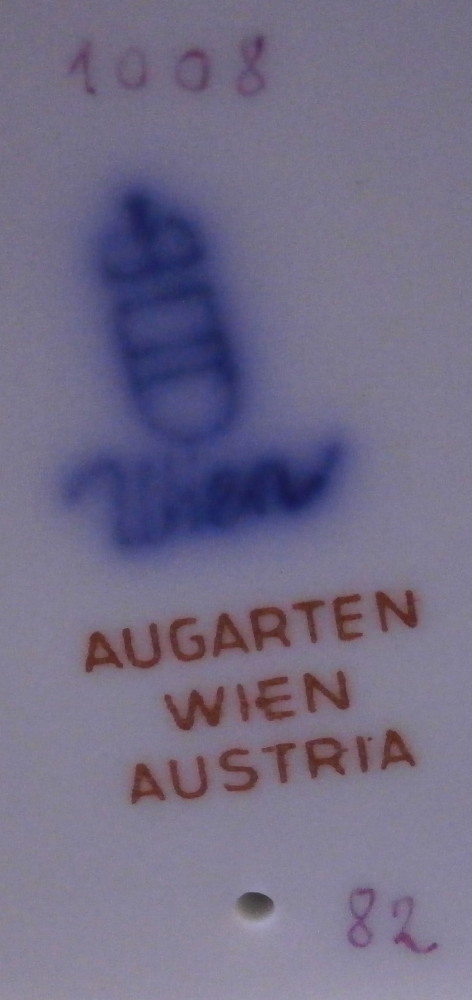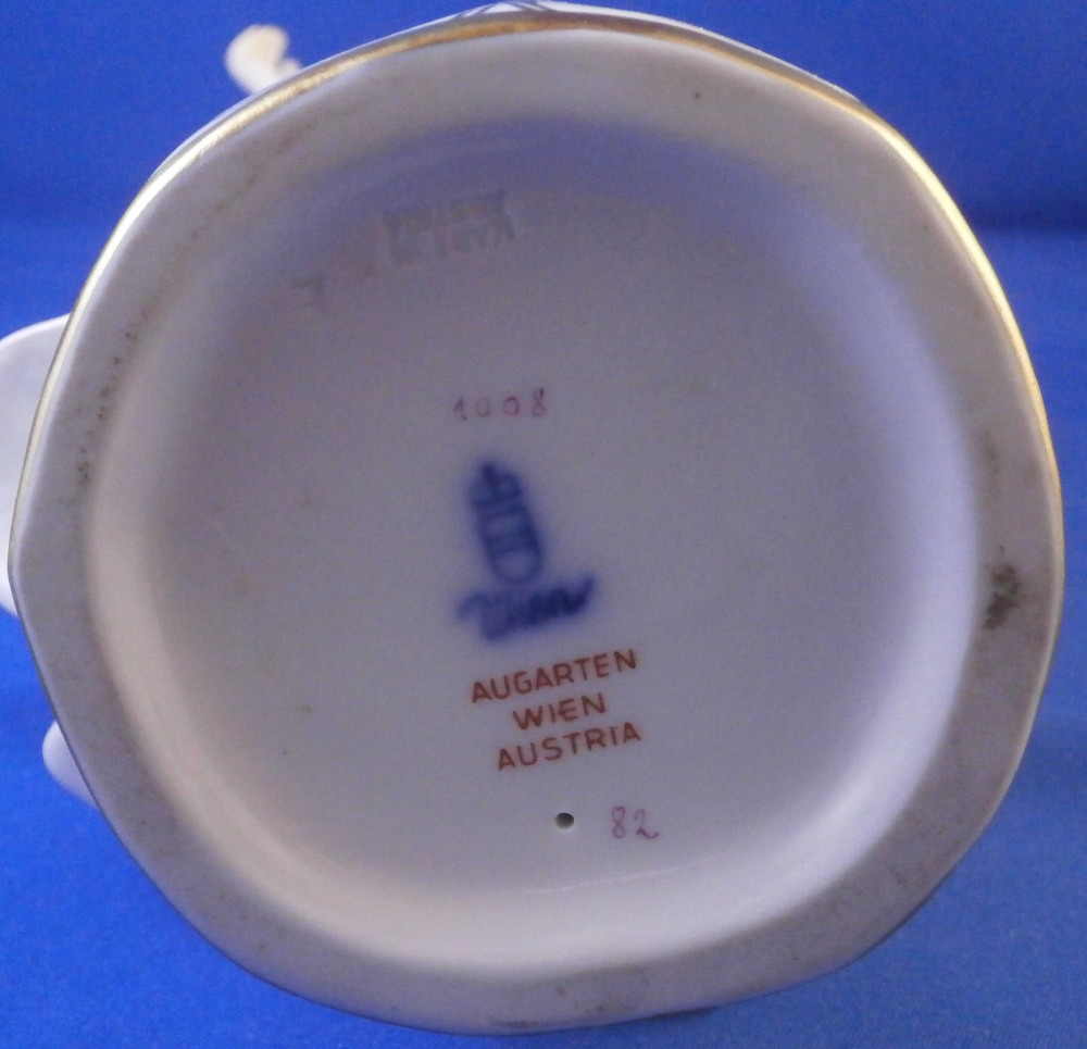This is a nice figurine of a lady holding a basket of flowers made by Augarten in the mid 20th century. The figure was made after an original Royal Vienna model of the 18th century. The figurine is nicely modeled and haind painted with lots of detail and nice colors and even has the old style gilding on the base that was a tell tale sign for Royal Vienna. Wish I had the 18th century original to stand them side by side but I am not that lucky. The piece is in great condition with a leaf of the flower in her hand broken off as well as one in the basket but it doesn't take away from the piece! She is 9 inches tall, 4 inches wide and 3.375 inches deep. Marked underneath with the blue shield with the crown on top as well as the word Wien underneath, Augarten Wien Austria in red, impressed made in Austria as well as a letter Land a painter's mark 82 plus the model number 1008 painted over the shield mark as shown.A really nice figurine! Please email me for more information or photos.