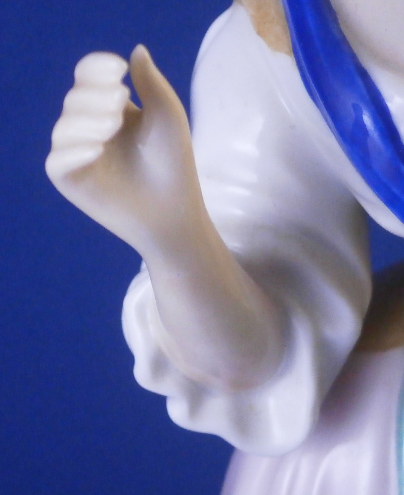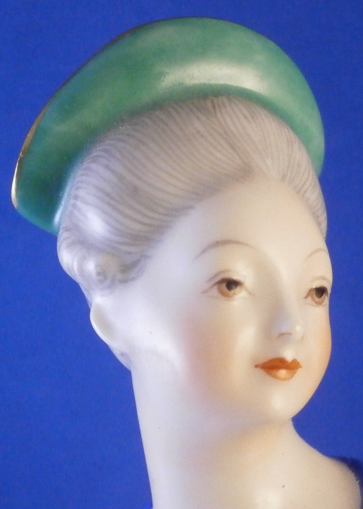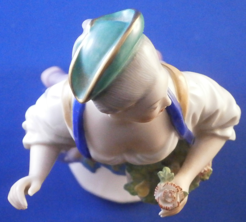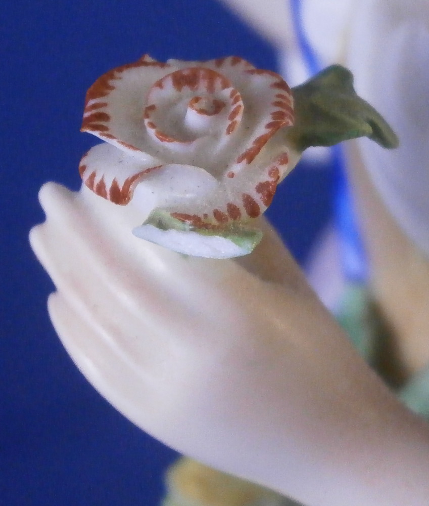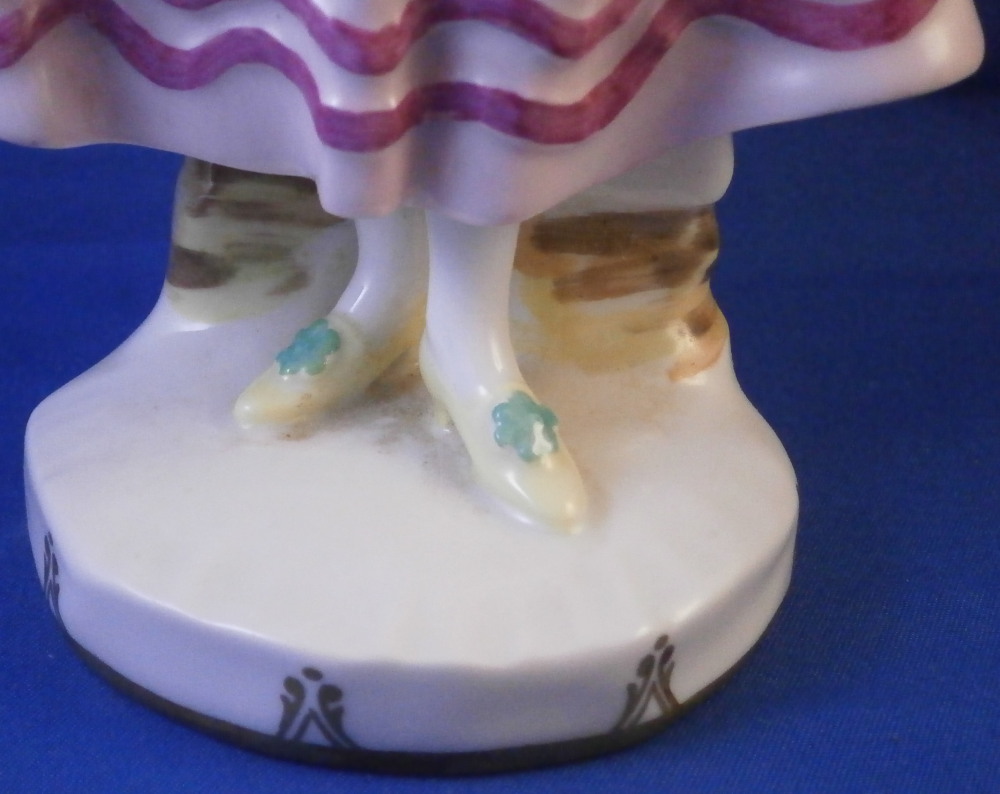 This is a nice figurine of a lady holding a basket of flowers made by Augarten in the mid 20th century. The figure was made after an original Royal Vienna model of the 18th century. The figurine is nicely modeled and haind painted with lots of detail and nice colors and even has the old style gilding on the base that was a tell tale sign for Royal Vienna. Wish I had the 18th century original to stand them side by side but I am not that lucky. The piece is in great condition with a leaf of the flower in her hand broken off as well as one in the basket but it doesn't take away from the piece! She is 9 inches tall, 4 inches wide and 3.375 inches deep. Marked underneath with the blue shield with the crown on top as well as the word Wien underneath, Augarten Wien Austria in red, impressed made in Austria as well as a letter Land a painter's mark 82 plus the model number 1008 painted over the shield mark as shown.A really nice figurine! Please email me for more information or photos.