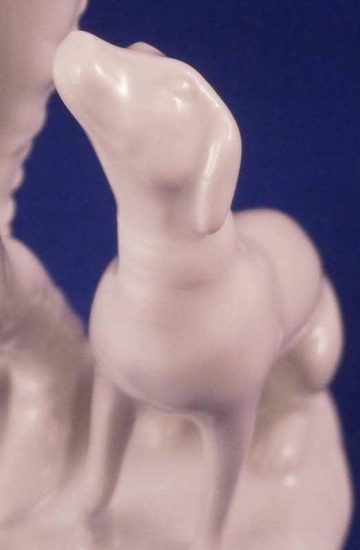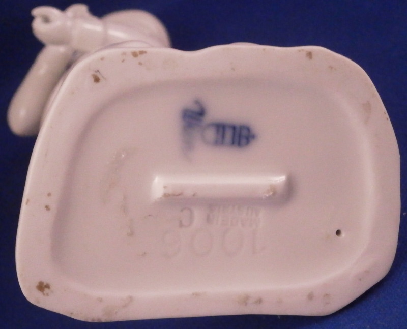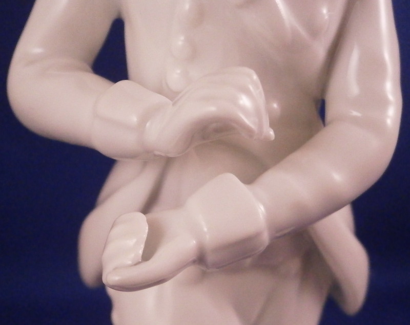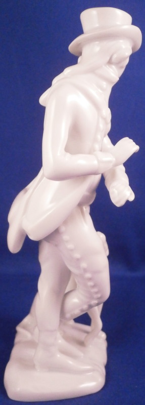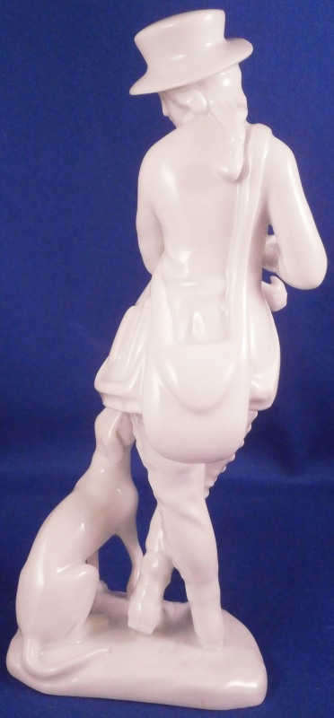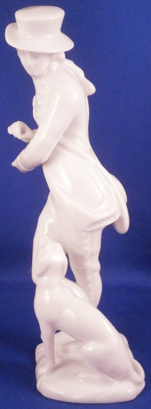 This is a nice figurine made by Augarten in the 20th century. The figure is of a gentleman dressed in a nice outfit including a top hat with his dog by his side. It looks like he is in the middle of giving the dog a treat with the way he is holding his hands and the dog is looking up at him. Quite cute! Nicely modeled and left in the white to show off all that detail without covering it up with color. A superb model especially in perfect condition which is the case herea and not one you see often at all. The figure is 5.875 inches tall, 2.375 inches wide and 1.75 inches deep. Marked underneath with the blue shield with the crown on top as well as the word Wien underneath, impressed 1006 and Made in Austria as well as the letter C as shown. Please email me for more information or photos.