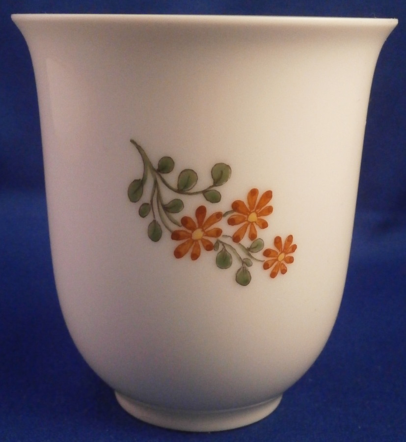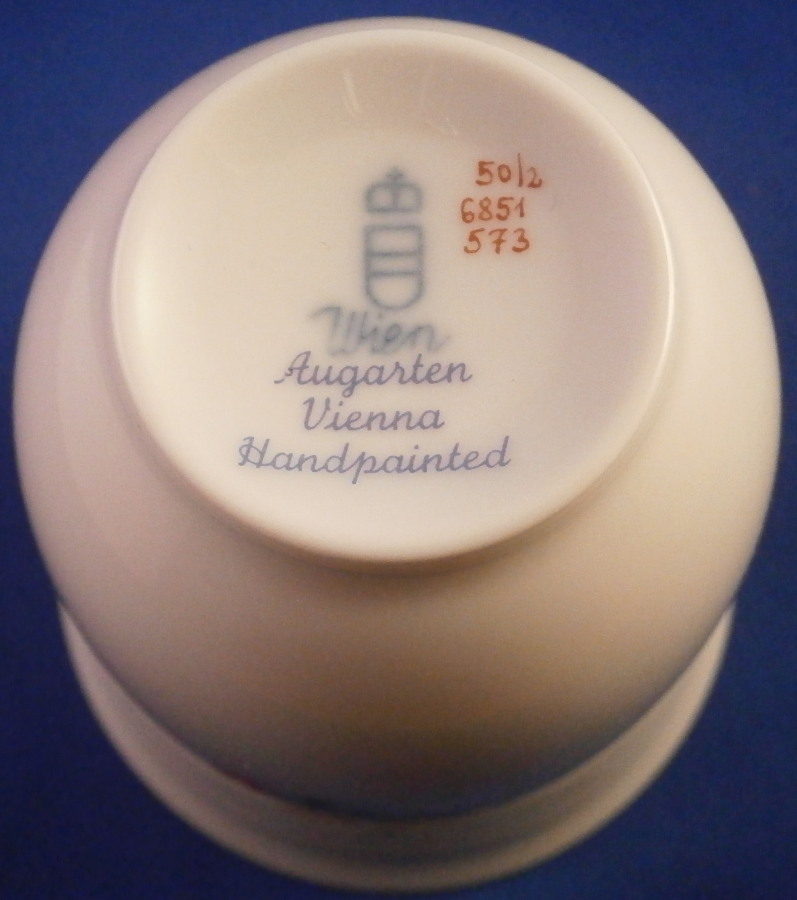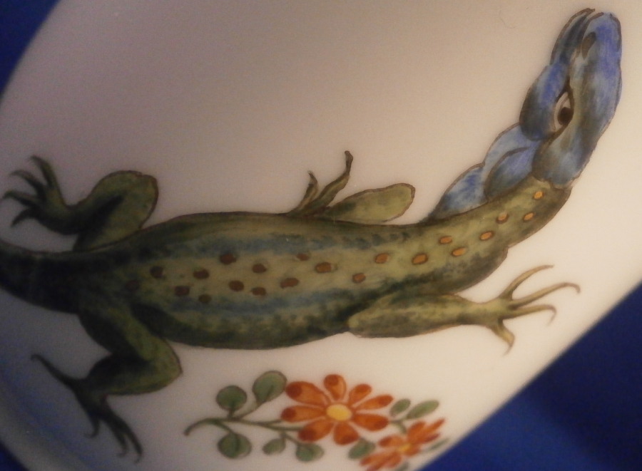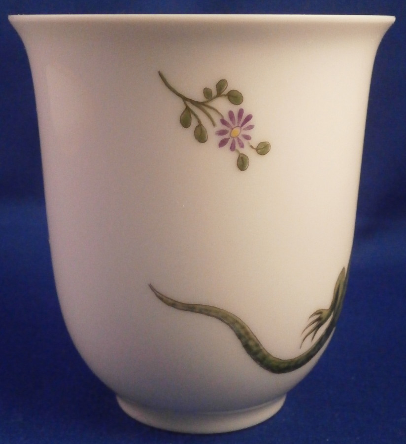 This is a really fun beaker shaped cup made by Augarten during the llate 20th or even early 21st century. The design I found on a set of dishes called the Children's dream that they still produce though this shape cup was not part of the catalog . The design is reminiscent of their early days during the Du Paquier period of the 18th century. It has the superb green and blue lizard hand painted on it with gold highlights as well as three flowers. I think the lizard is just amazing and not something you'll find again anytime soon. The cup is just over 3 inches tall and has a diameter of 2.875 inches. It is in perfect condition and is marked underneath with the blue shield with the crown on top as well as the word Wien underneath, Augarten Vienna Handpainted as well as some red numbers as shown. Please email me for more information or photos.