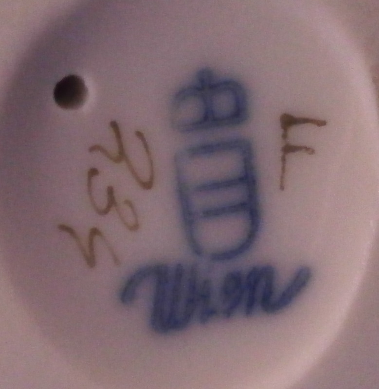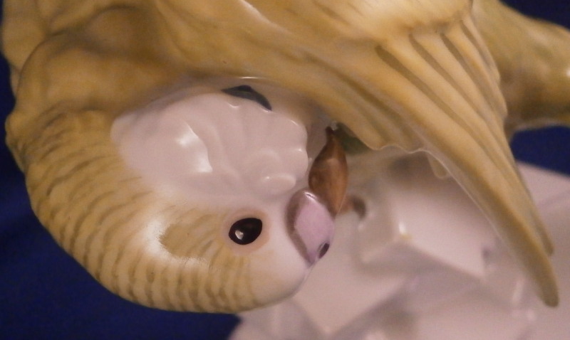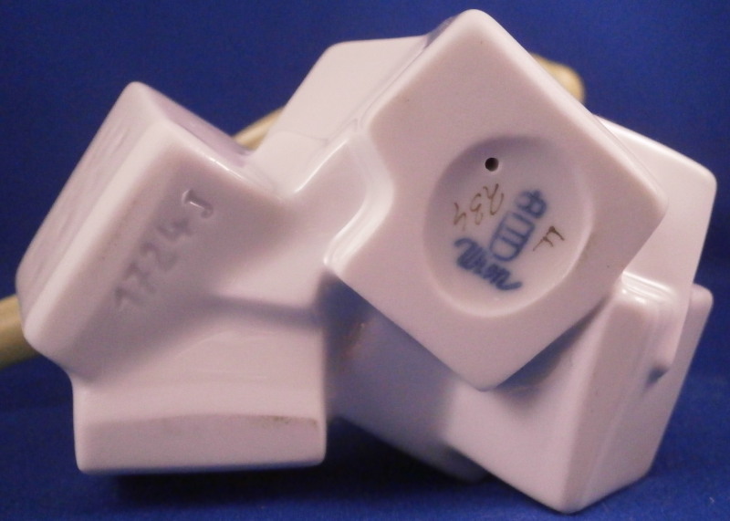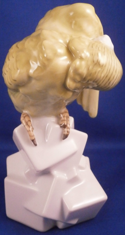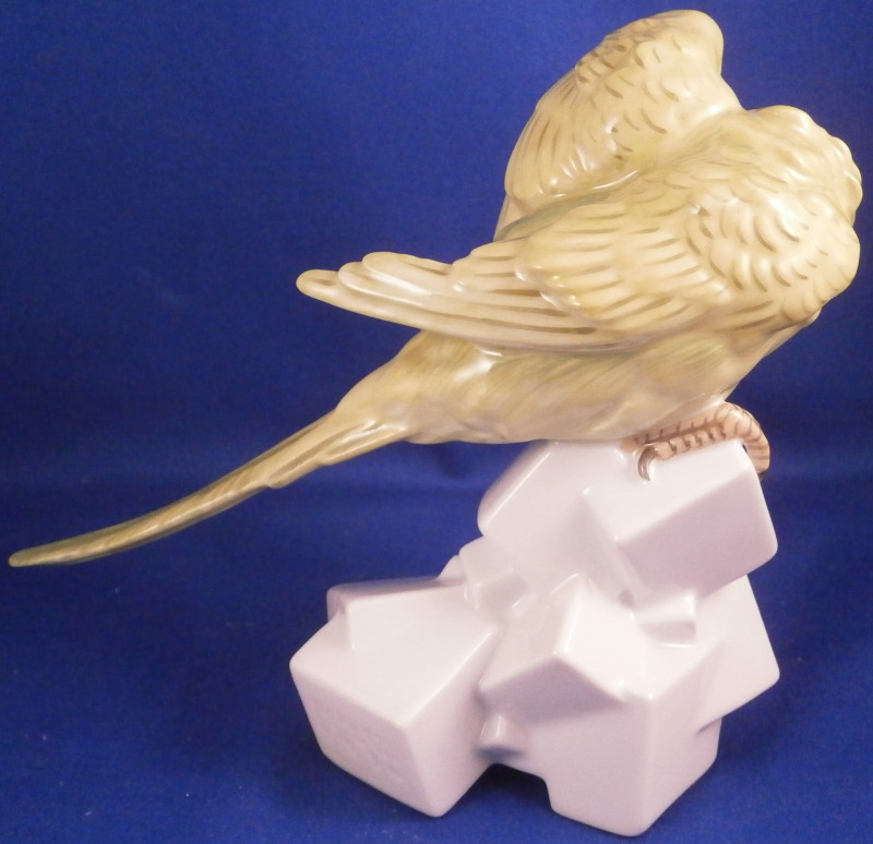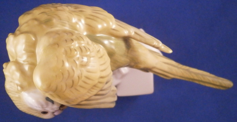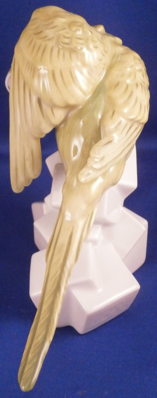 This is a very hard to find figurine of a parakeet bird first designed by Robert Ullmann in 1934. This is the green version which is rarer than the blue one - I have seen the blue one a few times but never the green one so I was excited to add him to my collection. We had three of these little birds when I was a kid and they were a lot of fun! Quite smart really. The green one used to play Yahtzee with us which was the funniest thing. The figure is superbly modeled grooming itself while sitting on some cubes - not sure what they are meant to be but they look rather Art Deco. A very realistic piece and quite a typical pose for these birds if you are familiar with them. The figurine is in perfect condition which is amazing given all the fragile parts to this figure, especially the tail. The piece is 5 inches tall, 5.25 inches from head to tail and 2.5 inches deep. The figure is marked underneath with the blue shield with the crown on top as well as the word Wien underneath, a black 77 or LL as well as a 234 as the painter's mark, impressed letter J and number 1724 and on the side of the base it has Robert Ullmann 1934 impressed. Please email me for more information or photos.