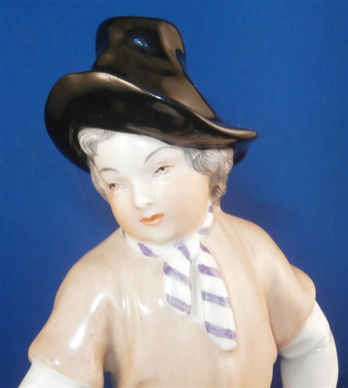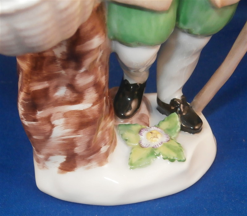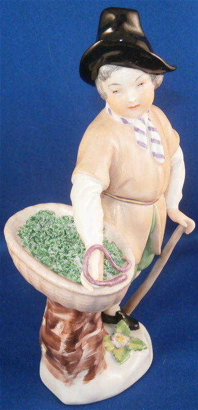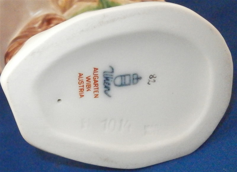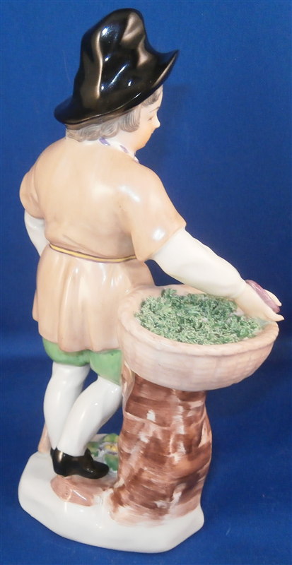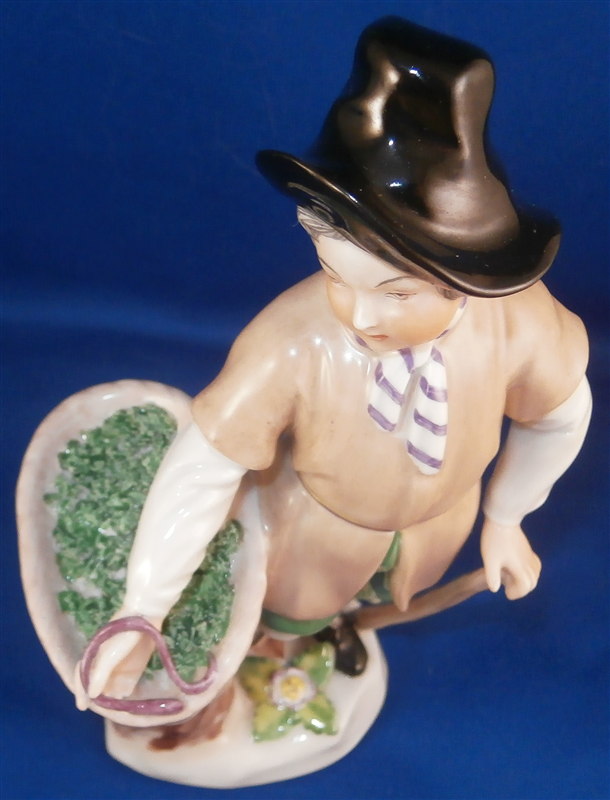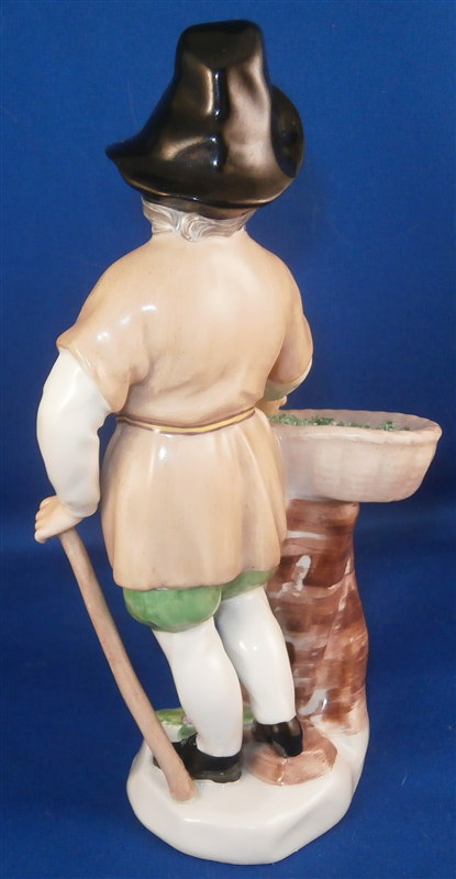 This is a figurine of a gentleman with a basket made by Augarten in the mid 20th century. The figure is likely of a street vendor and whatever he was selling is hidden under the leaves to keep it cool maybe some sort of fish. He is holding a walking stick in his left and and is superbly modeled with lots of detail and handpainted to perfection. I have not seen this model before so I am not sure if this was originally designed by the Royal Vienna factory in the 18th century or not. The figure is in perfect condition! He is 6.75 inches tall, 3.75 inches wide and 2.5 inches deep. Marked underneath with the blue shield with the crown on top as well as the word Wien underneath, Augarten Wien Austria in red, the usual impressed marks including the model number 1014 and a black painter's number 82 as shown. Please email me for more information or photos.