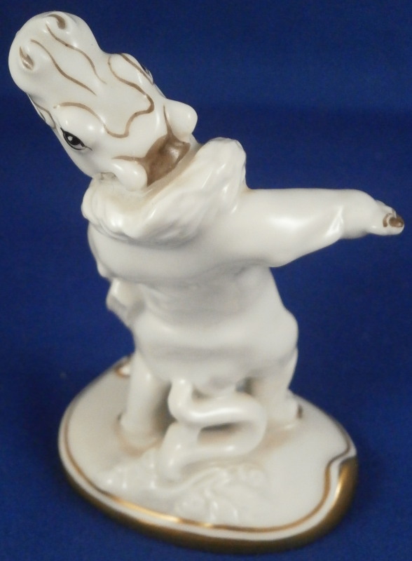 This is a really fun figurine of a singing hippopotamus which is part of the Vienna Tierhamoniker (a play on the Philharmonic and Tier means animal) made by Augarten in the 1920s. These are some of the earliest pieces made by Augarten and this piece is from the original period! I have only had one other of these before so they are very hard to find. The hippo was designed by Karin Jarl in the early days of the manufactory. Superbly modeled and painted with just a little bit of color and a gold trim make this an elegant and truly fun figurine. The hippo is holding a book in on hand with a wreath around its neck while standing on a base decorated with flowers and a harp or something along thoses lines. The figure is 3.25 inches tall, 2.125 inches wide and 1.5 inches deep. The piece is in perfect condition and marked underneath with the blue shield with the crown on top as well as the word Wien underneath and Augarten Austria in a red rectangle. No numbers or other impressed marks yet so these are really early pieces! Please email me for more information or photos.